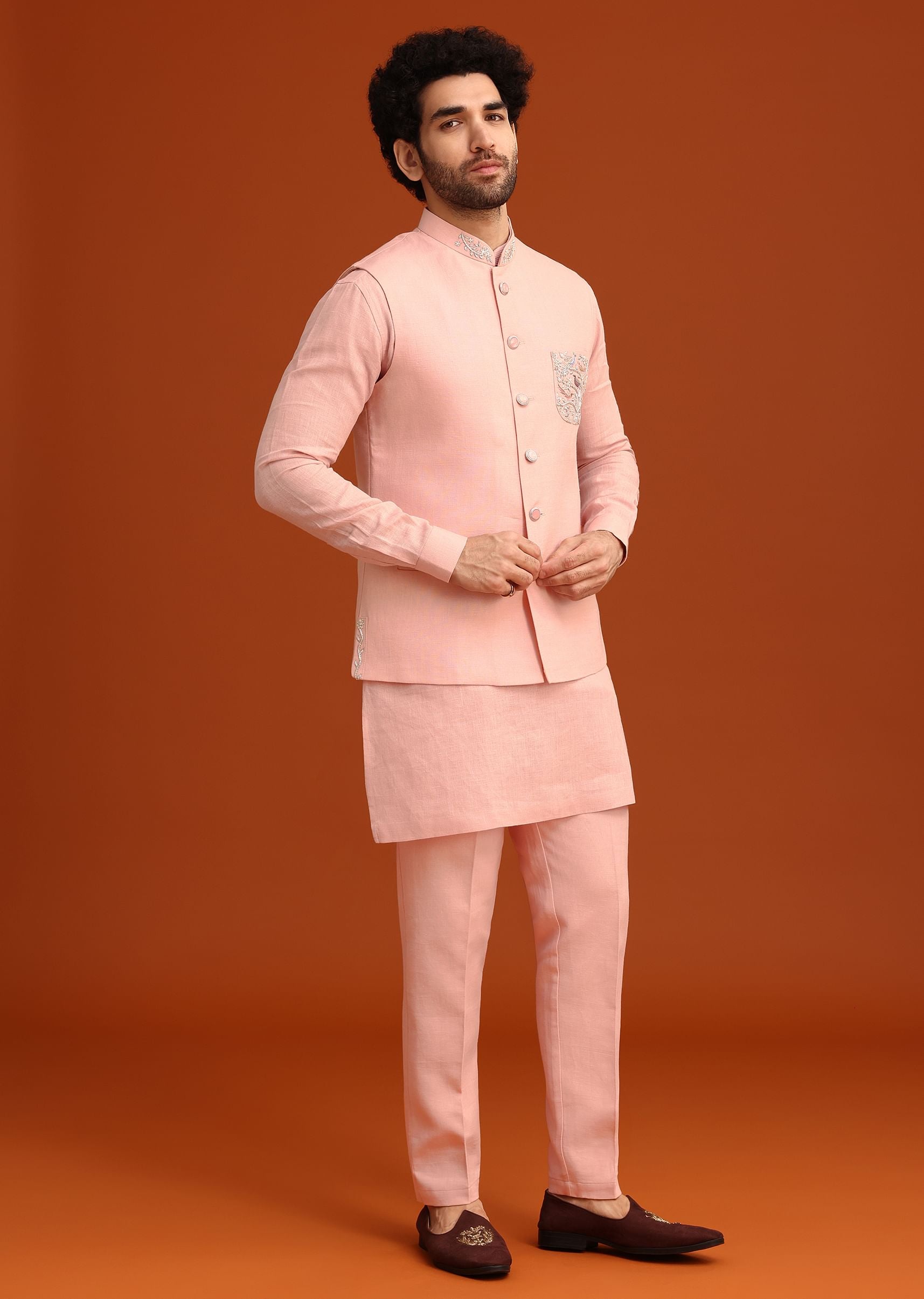 - Elevate your ethnic wardrobe with our Pink Linen Zardosi Kurta Jacket Set, featuring an exquisite mandarin collar.