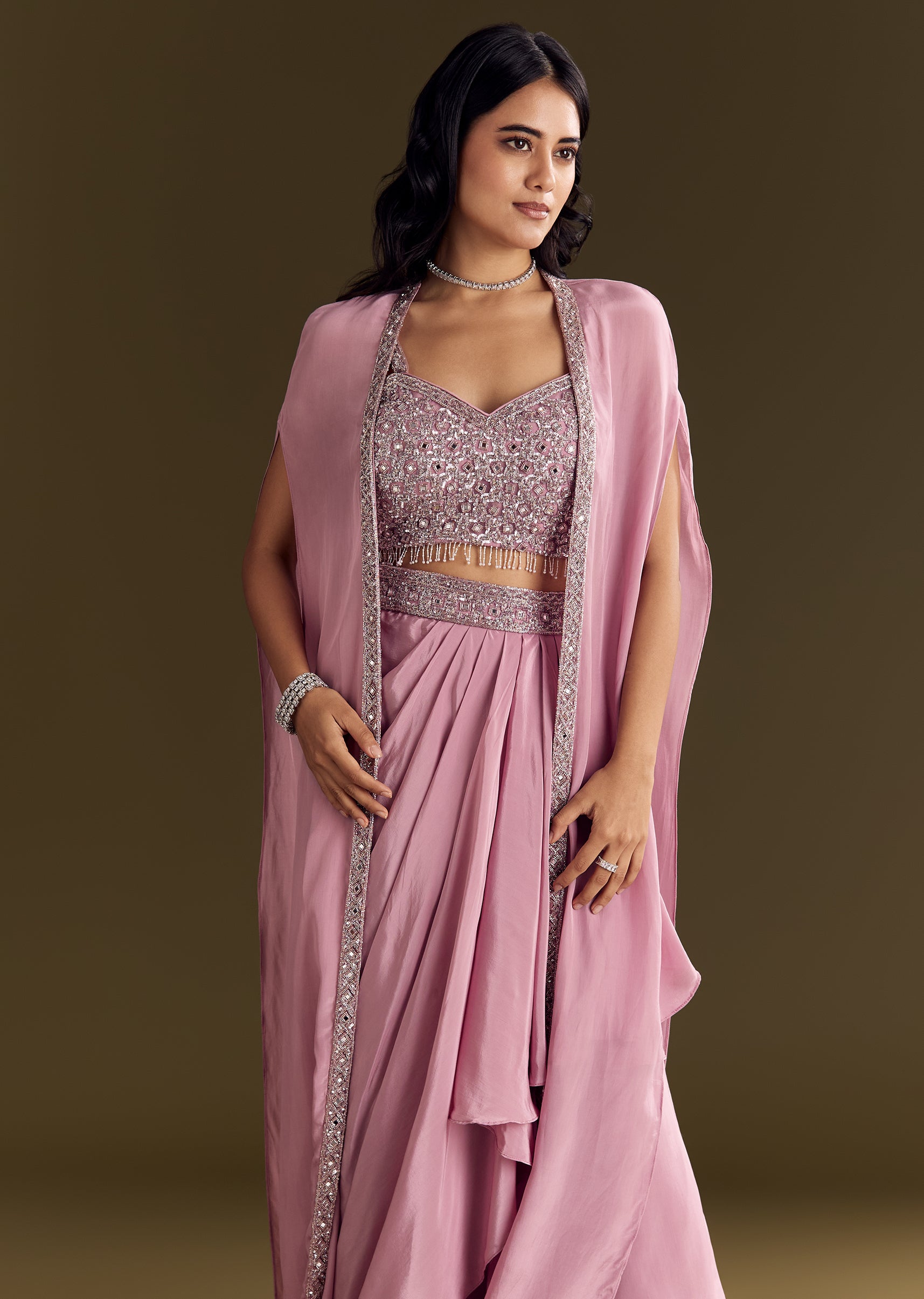 Pink Mirror Sequin Embroidered Croptop Skirt With Cape