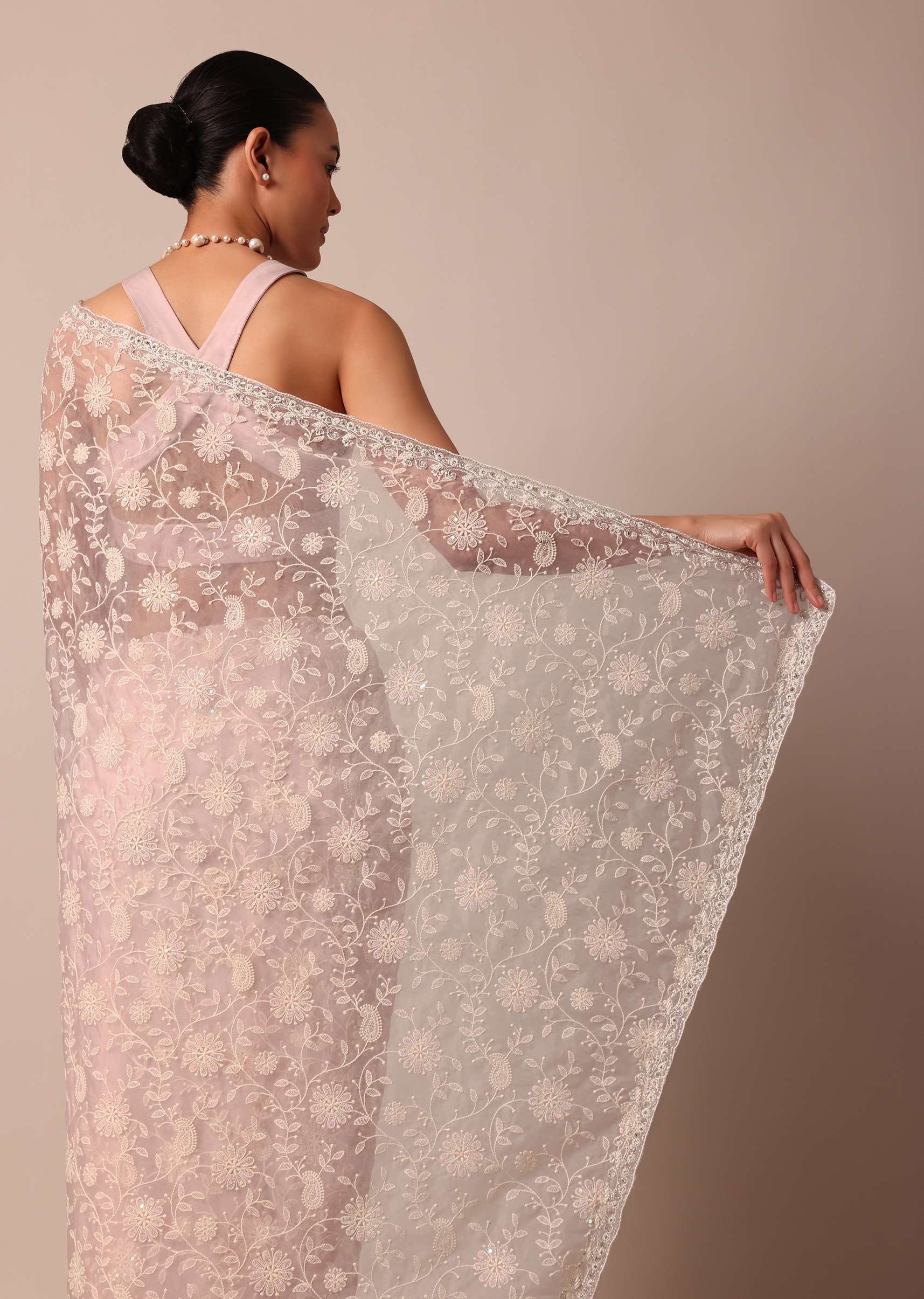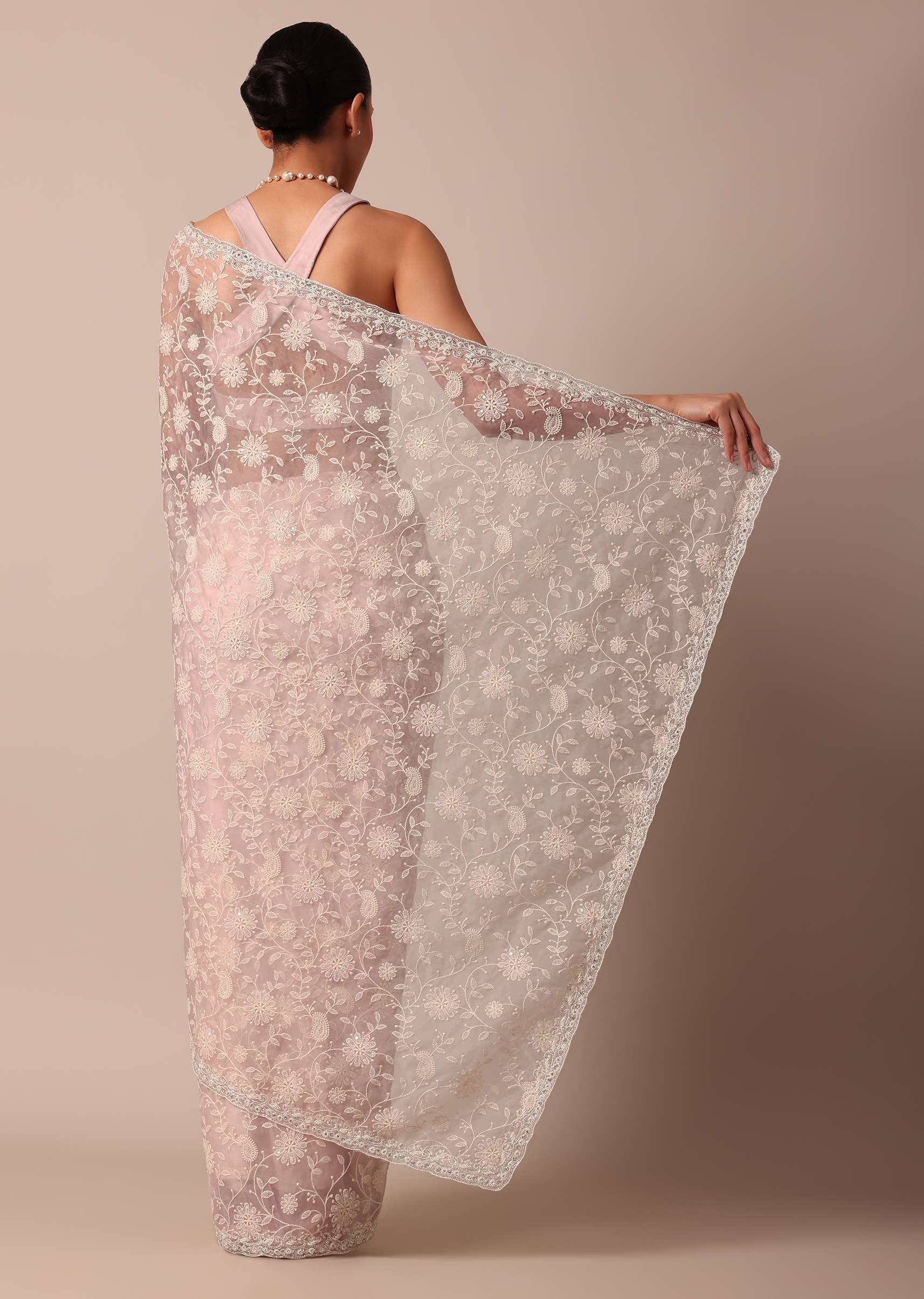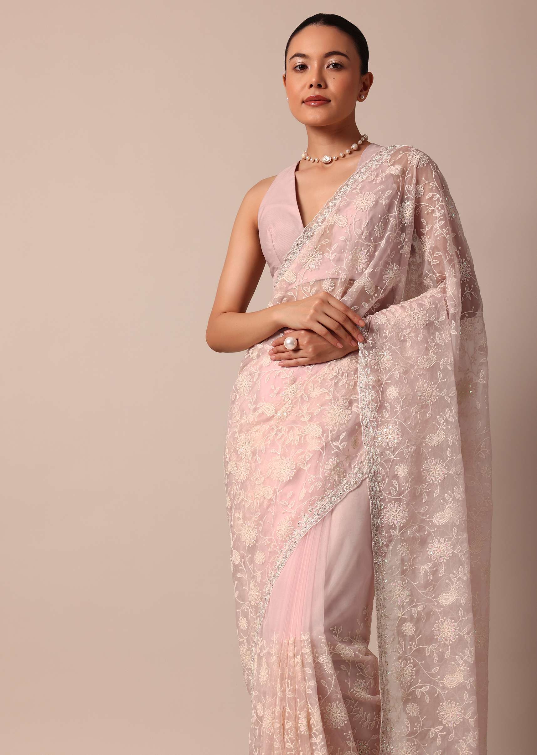 Pink Organza Silk Saree With Chikankari Floral Jaal Work And Unstitched Blouse Fabric