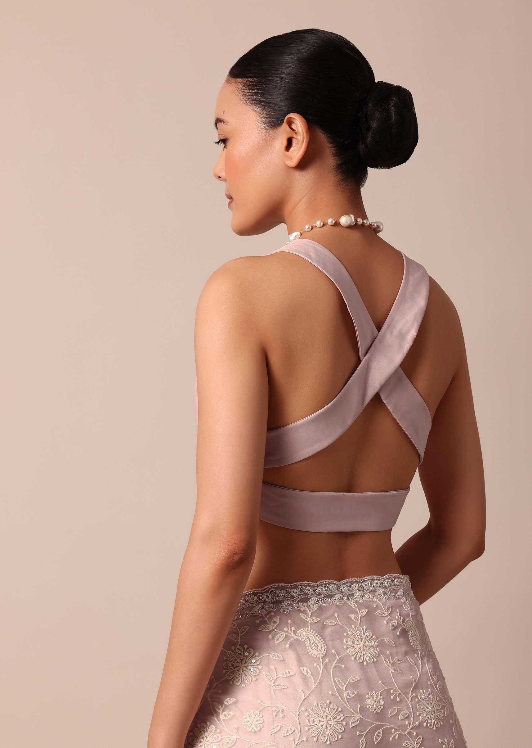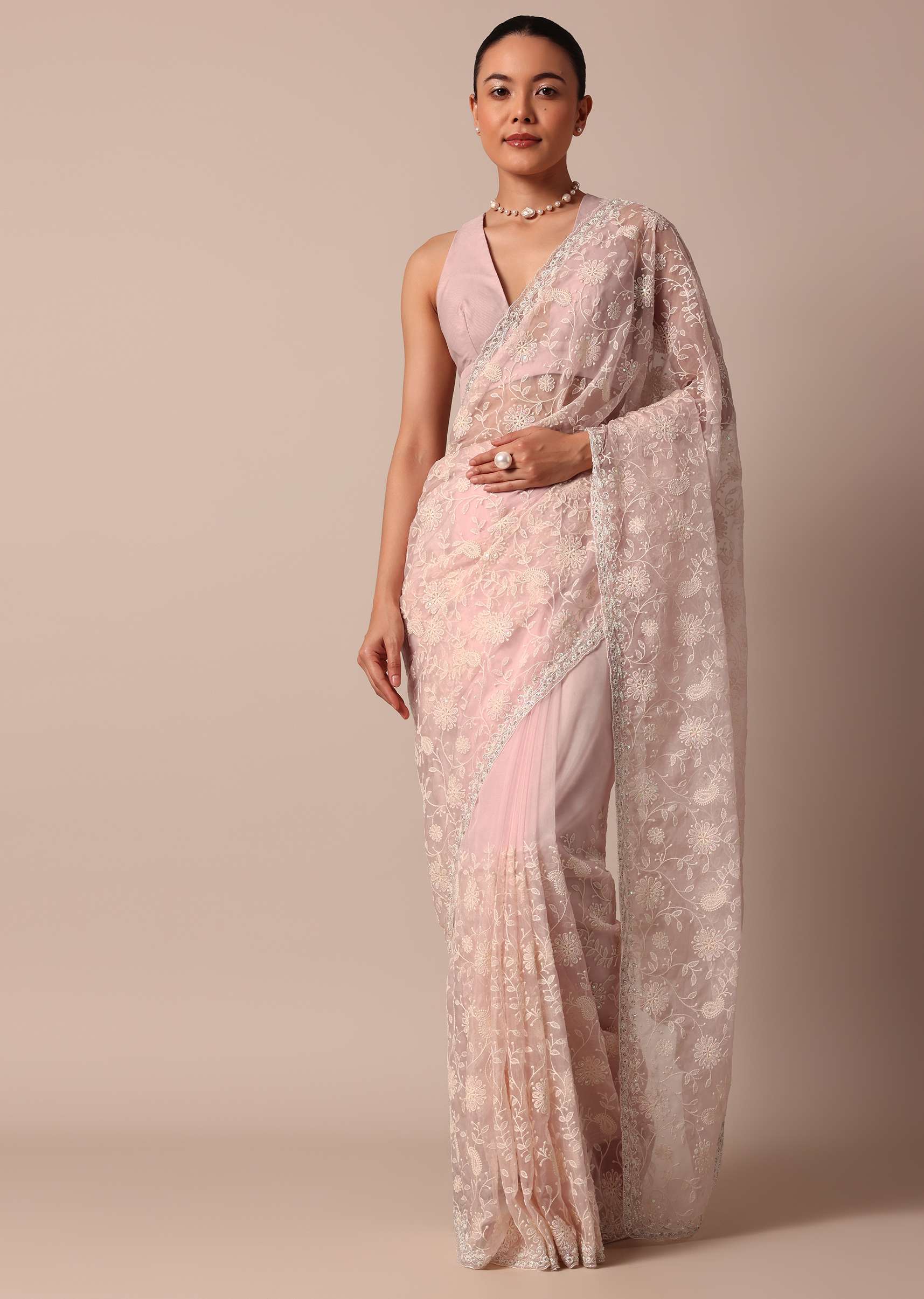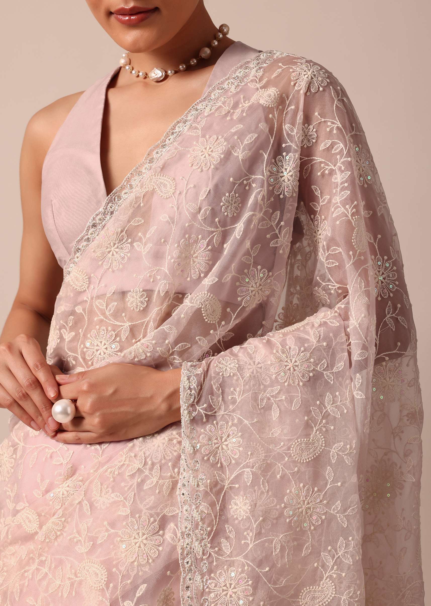 Pink Organza Silk Saree With Chikankari Floral Jaal Work And Unstitched Blouse Fabric