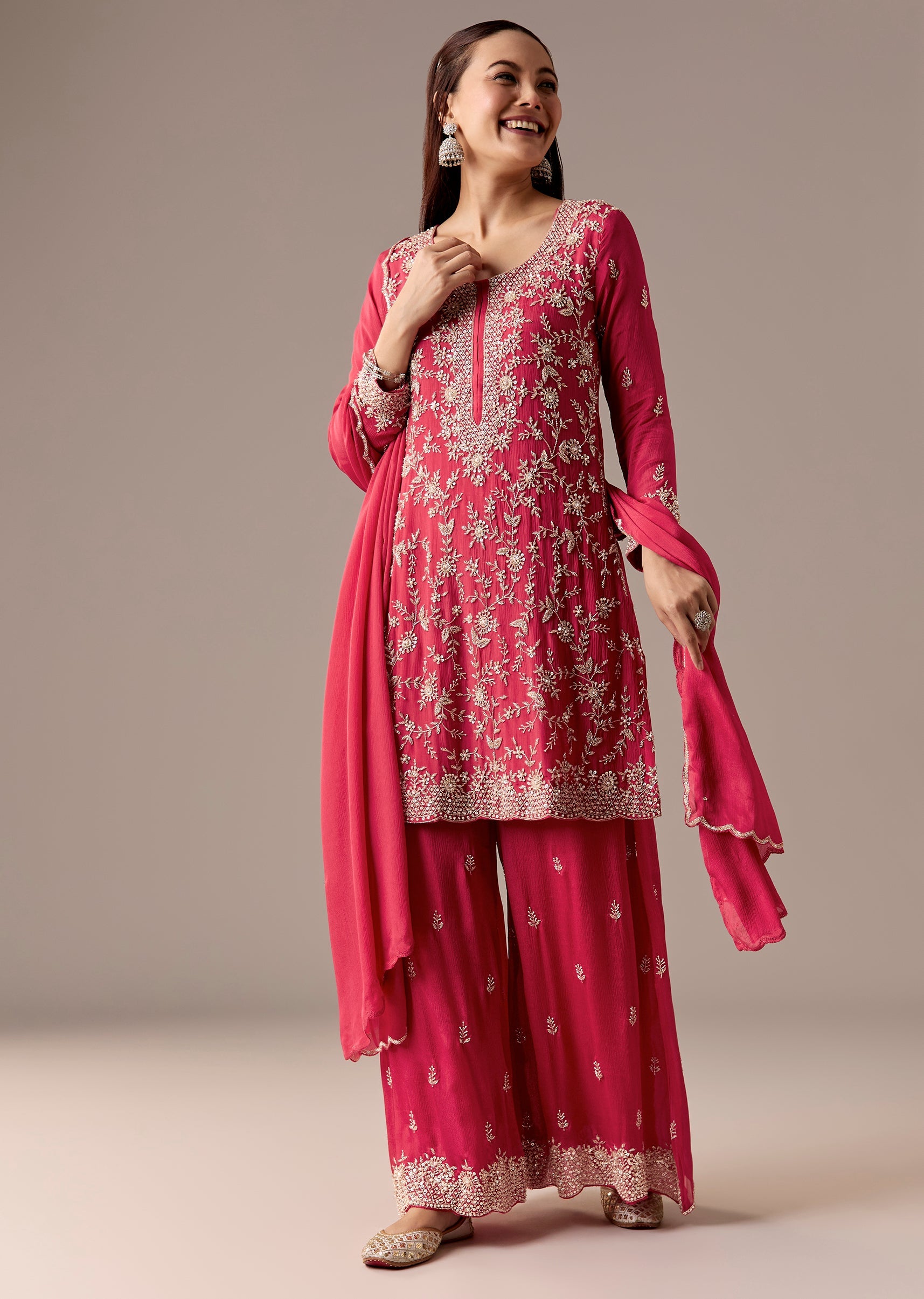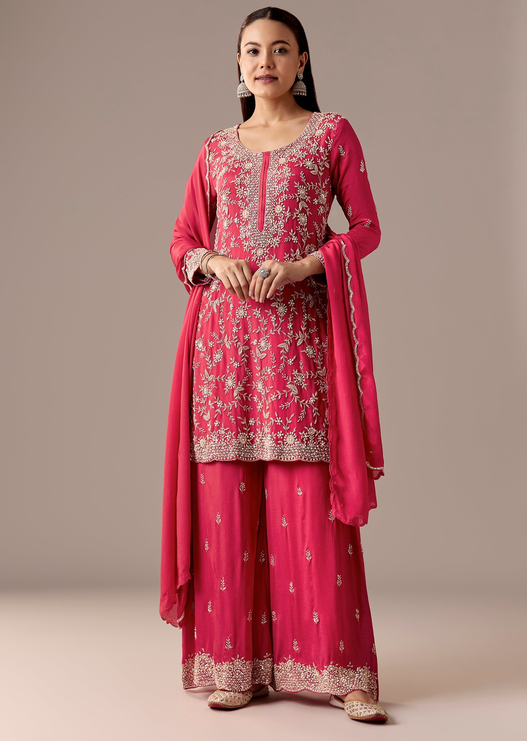A classic pink chinon palazzo suit with a cut-dana embellished straight kurta, paired with palazzos and a matching dupatta. 3/4th sleeves, side slits, and a clean festive fall—ideal for engagement... More Product Details