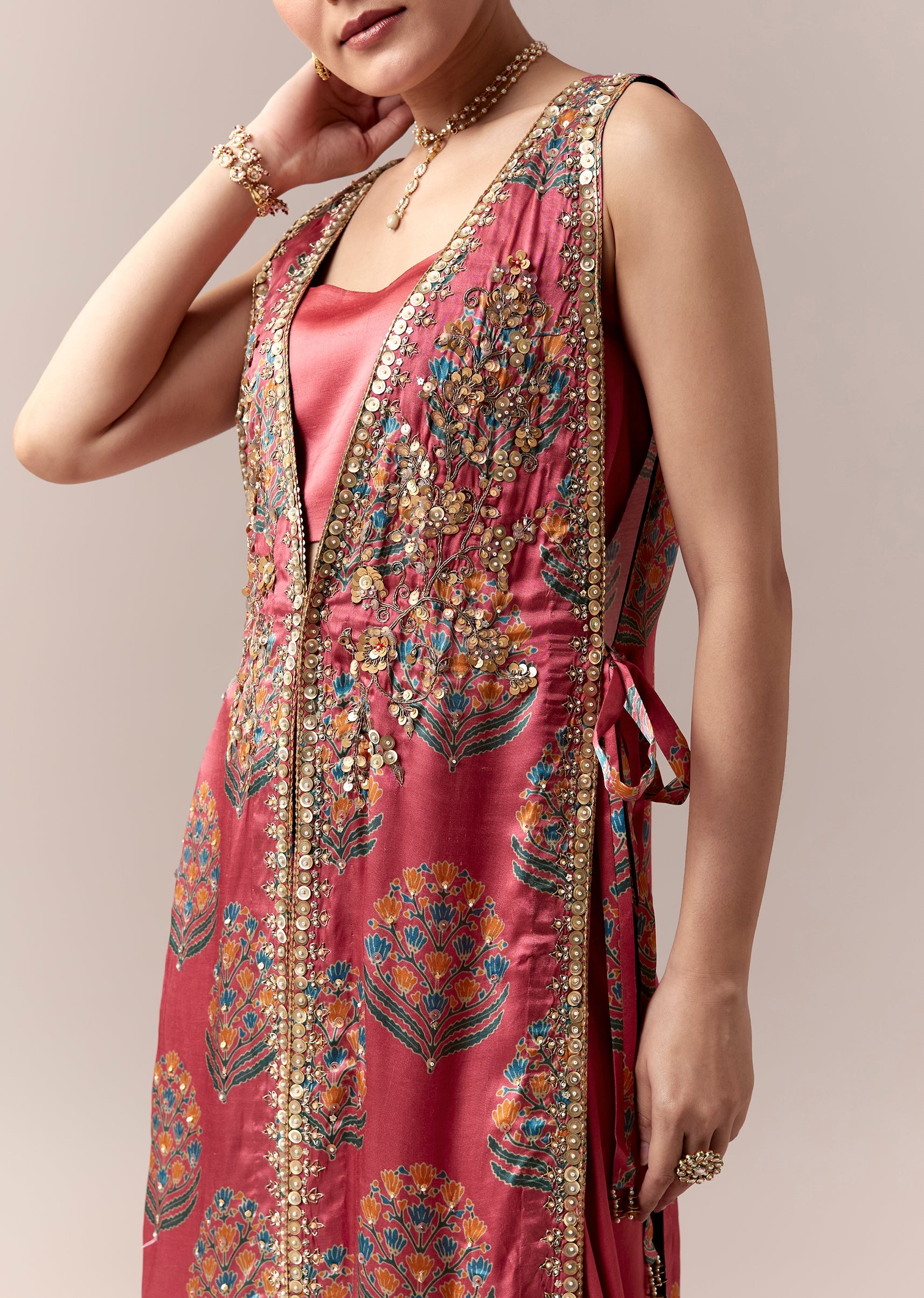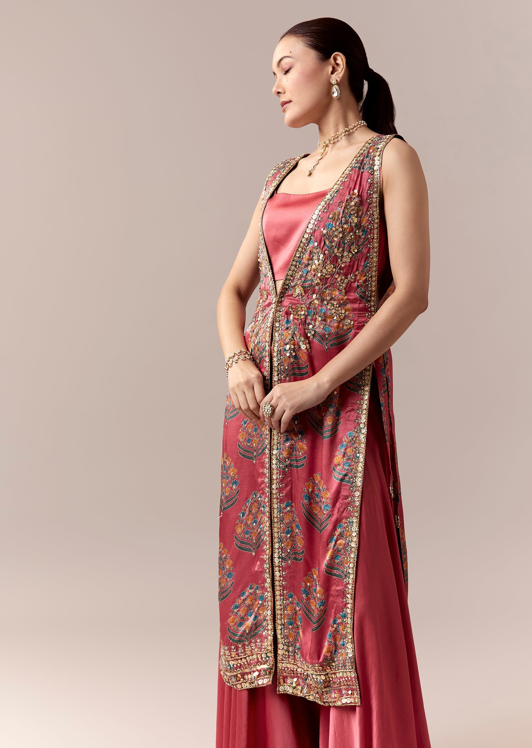 Pink Palazzo Suit With Printed Sequins Work Jacket