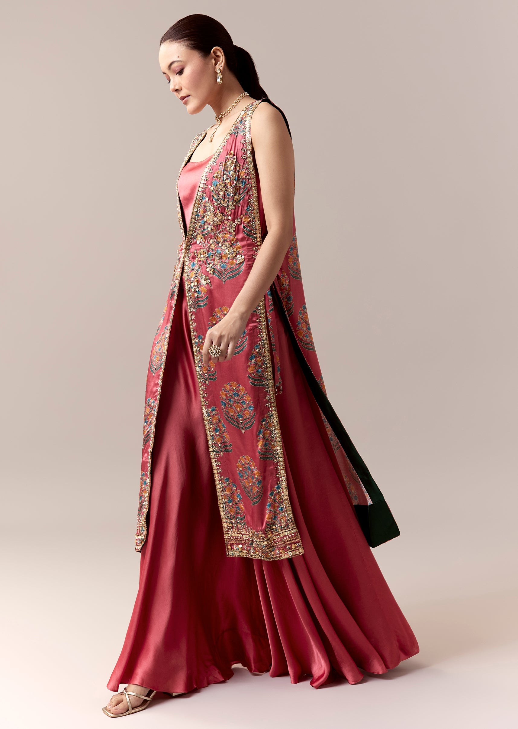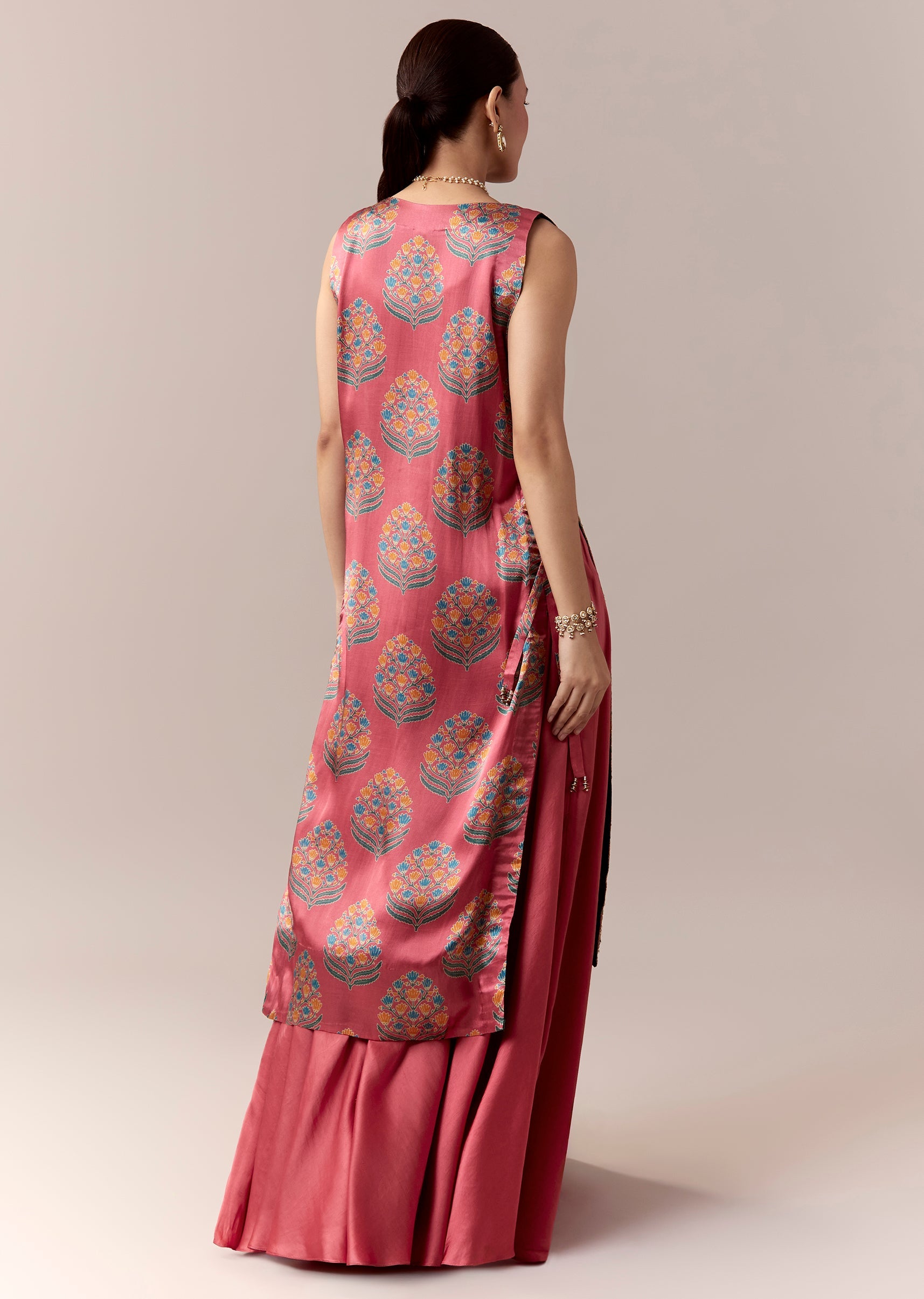 Elegant and vibrant, this pink palazzo suit set is crafted in soft gaji silk fabric for a fluid festive look. The sleeveless V neckline top pairs beautifully with a coral... More Product Details