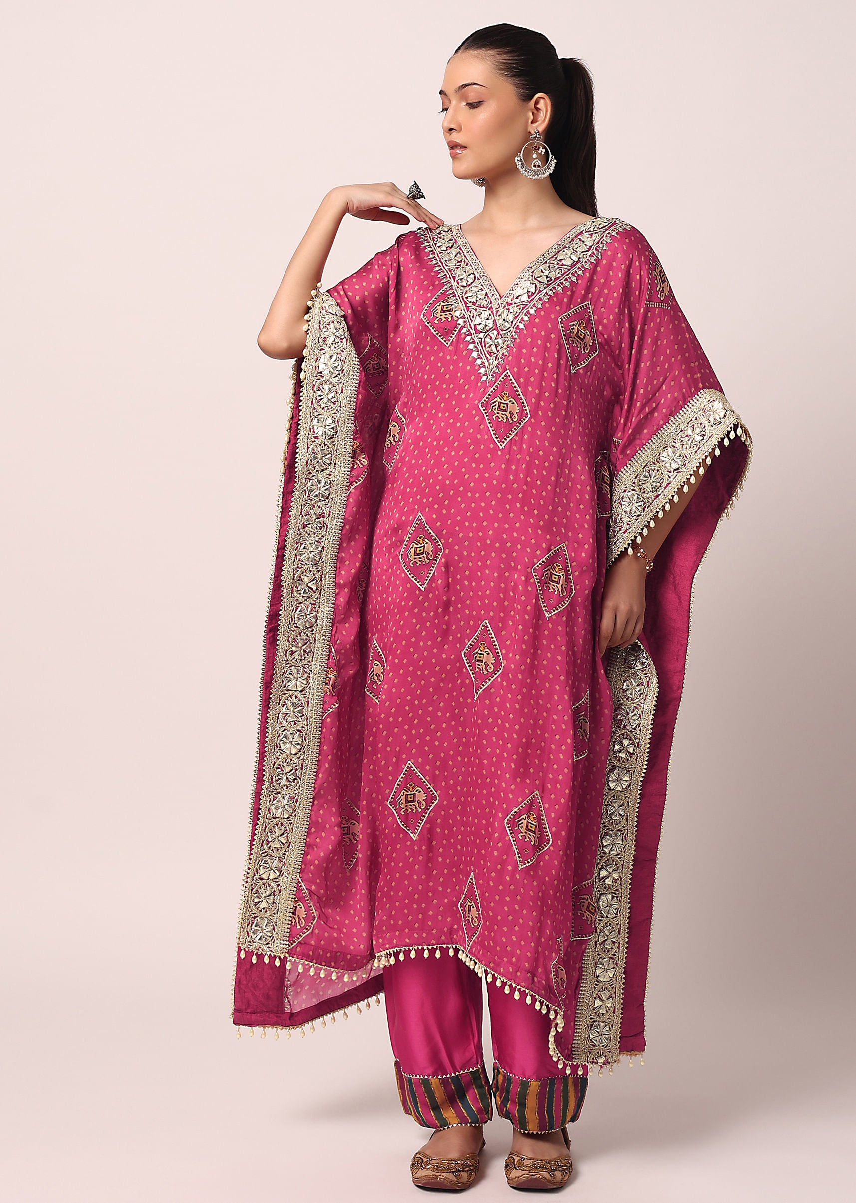 • Fabricated in a vibrant pink hue, this kaftan kurta is elevated with glimmering mirror, gota... More Product Details