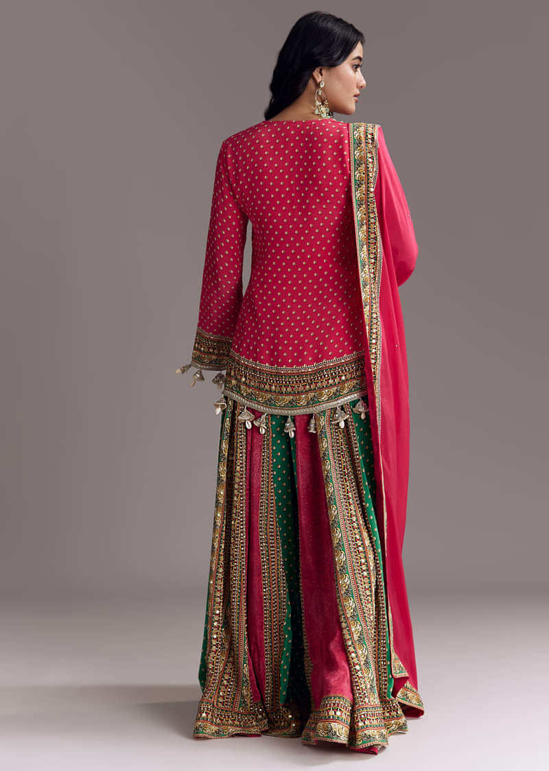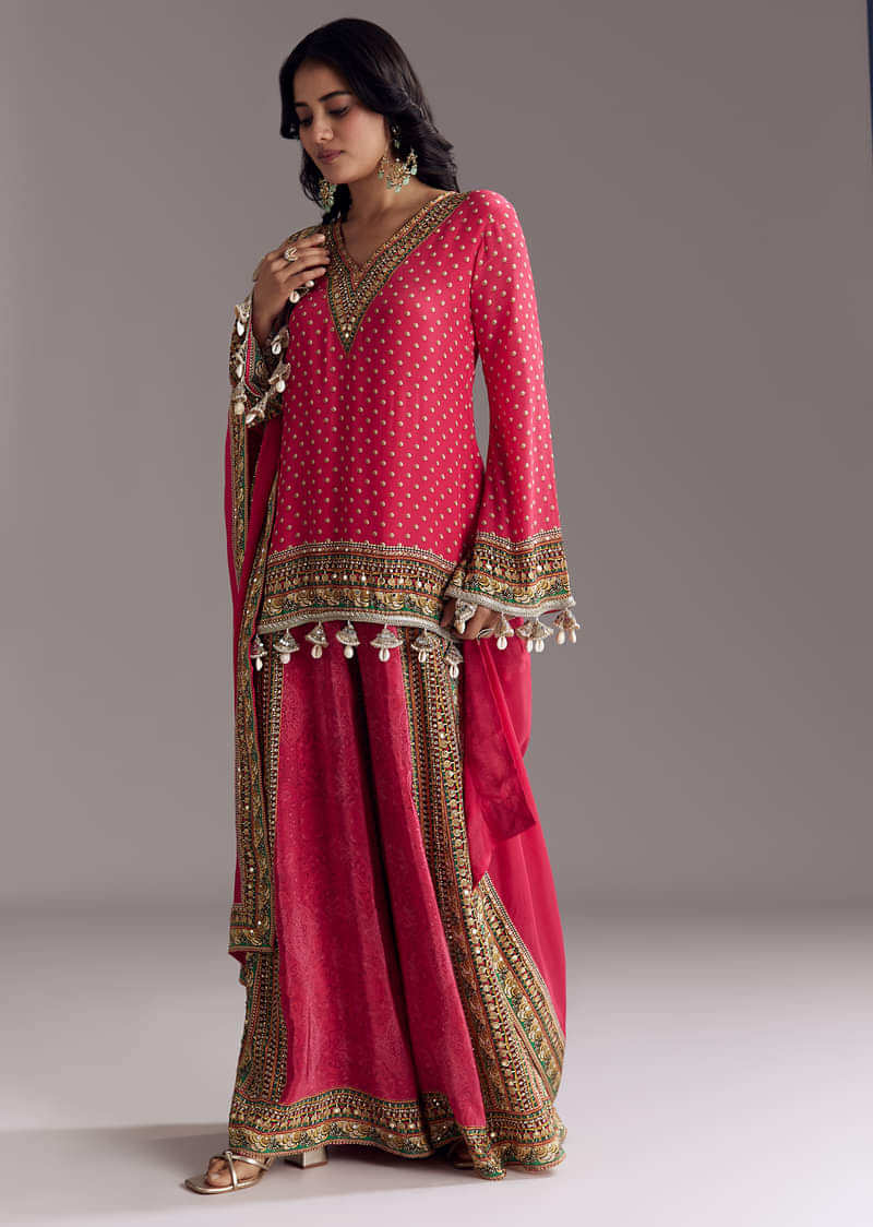 A breezy festive pick, this crepe suit set features a printed kurta with V-neckline, wide-legged palazzos, and a coordinating dupatta. The relaxed cut and flared sleeves make it a practical... More Product Details