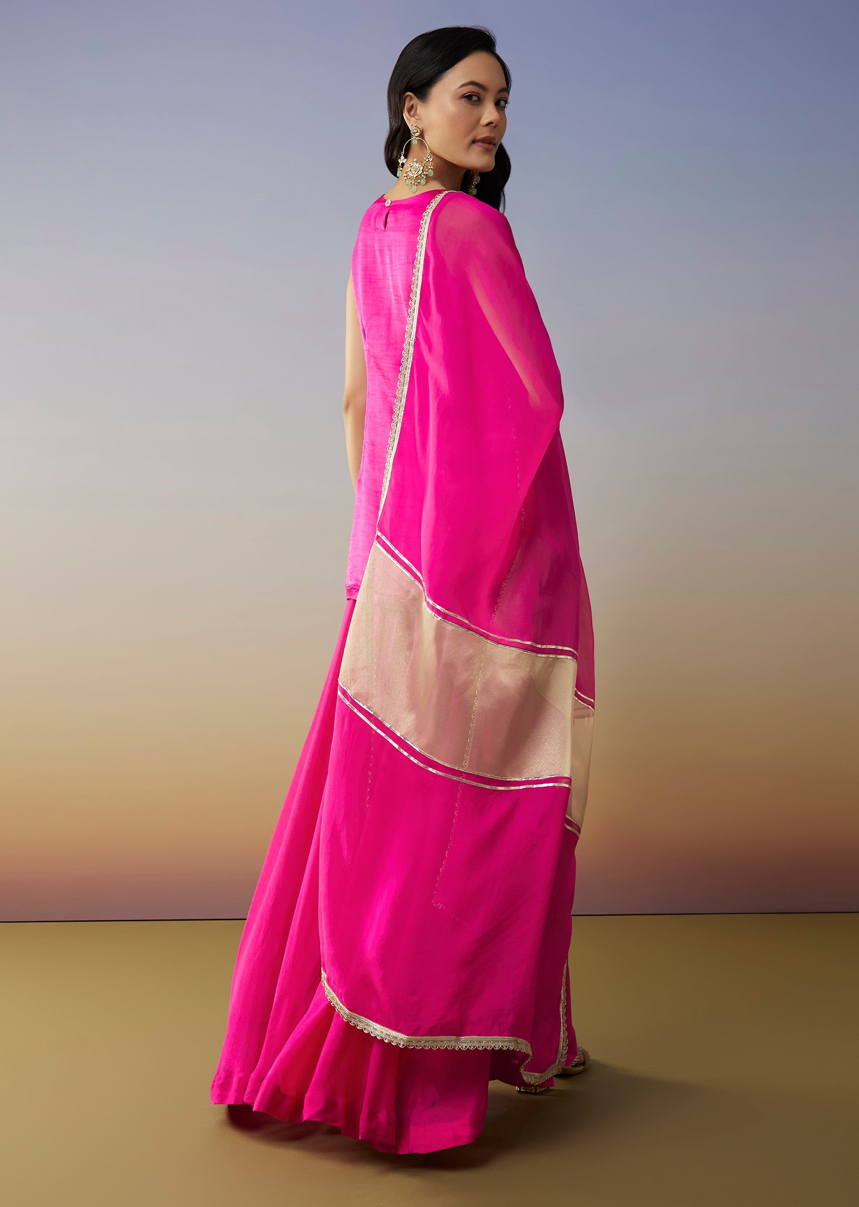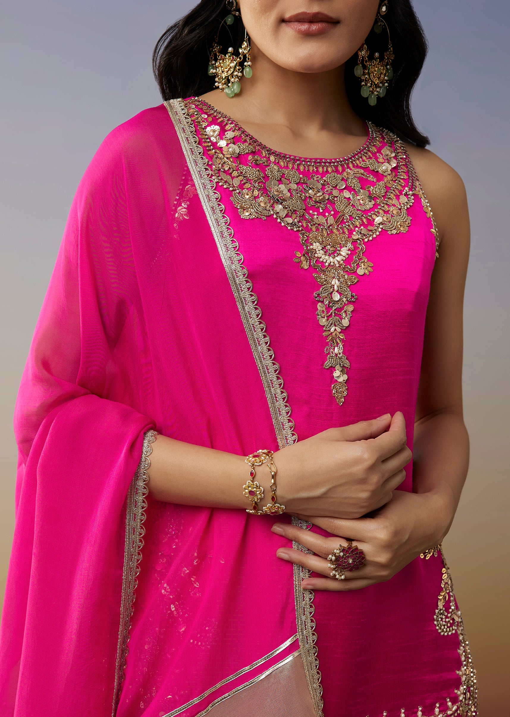 This vibrant pink palazzo suit is crafted for sangeet mehendi and wedding celebrations where color pop charm takes center stage. Designed in a straight style it features a satin primary... More Product Details
