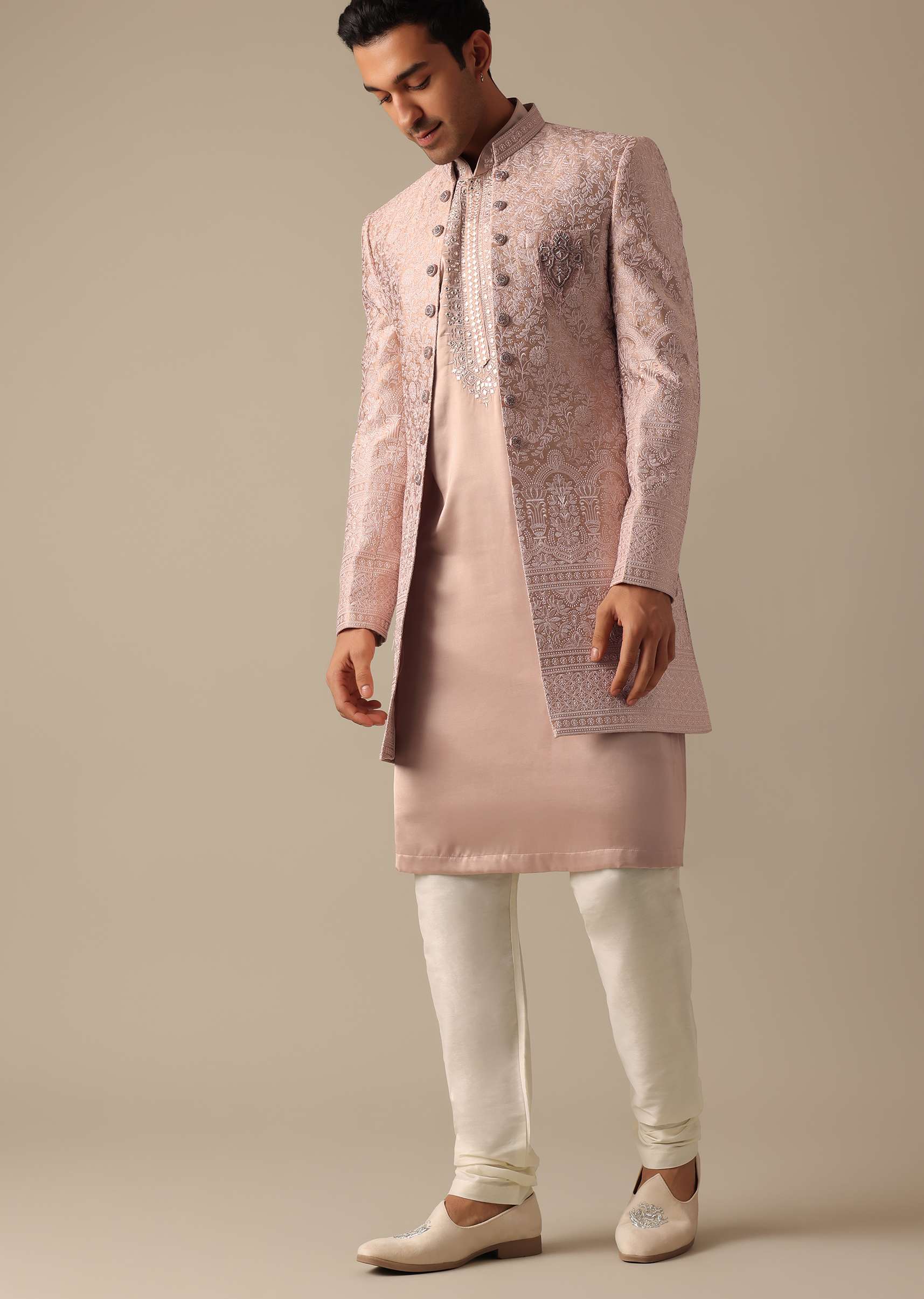 Pink Satin Silk Sherwani And Kurta Set