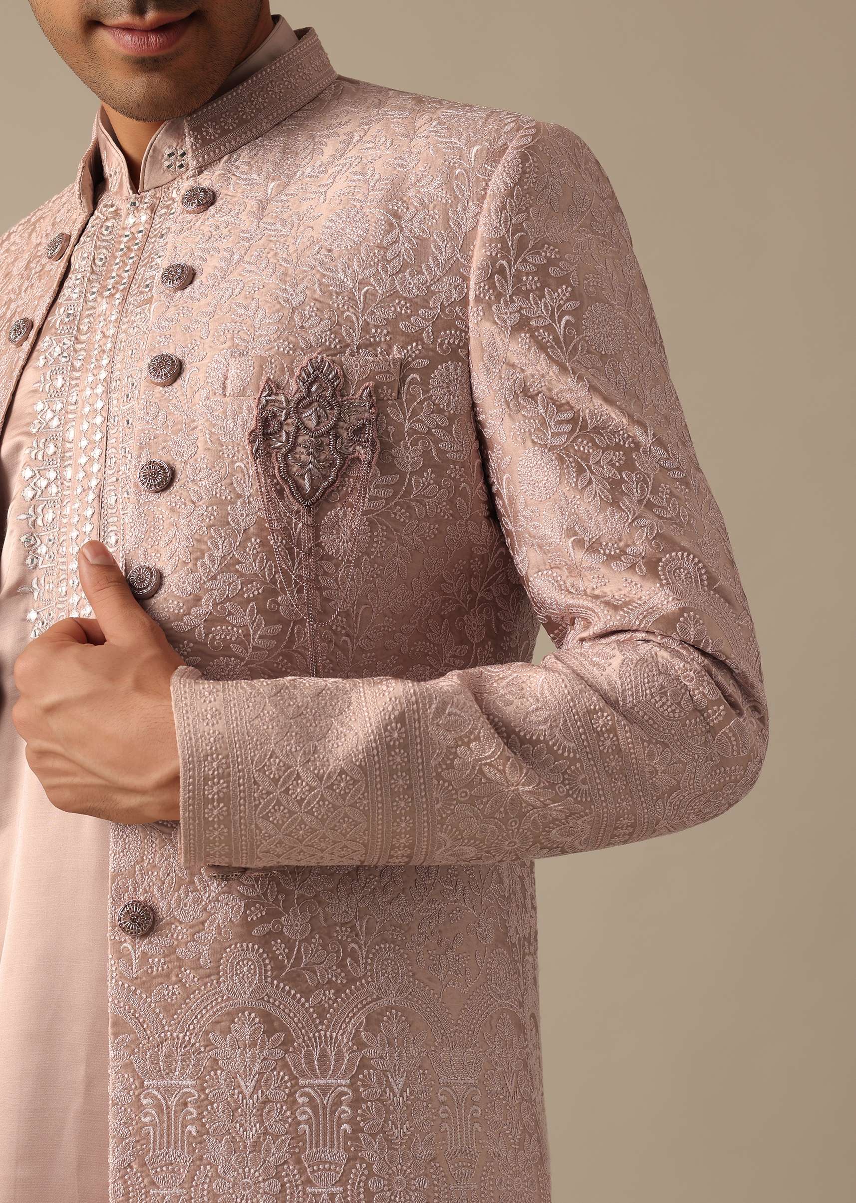 - Decked with striking embroidery, the sherwani flaunts of a chest welt pocket and front-button detail.