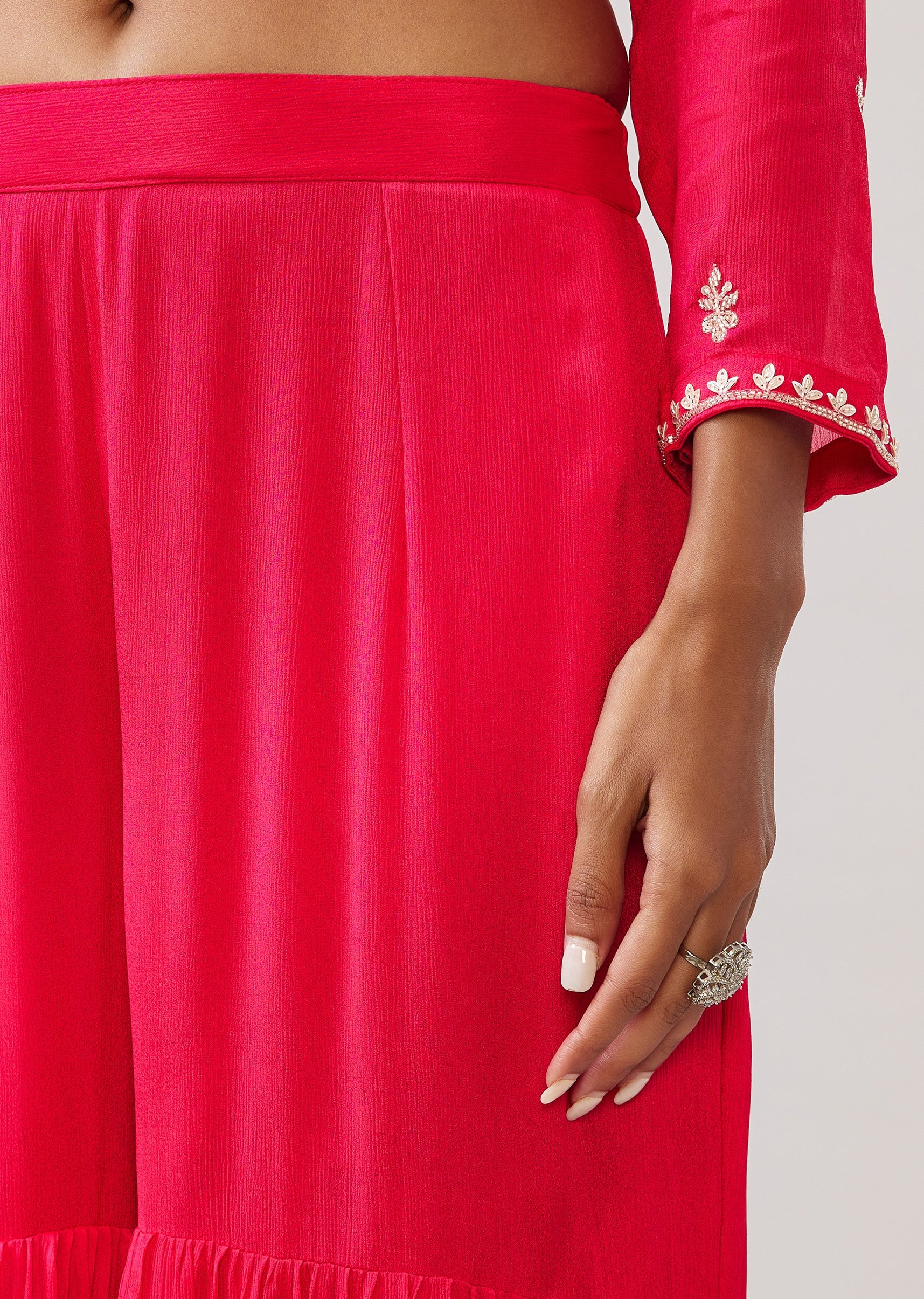 Turn heads at Eid and mehendi celebrations in this pink chinon sharara set featuring classic sequin and cut dana work on the kurta. Designed in a straight silhouette with 3/4th... More Product Details