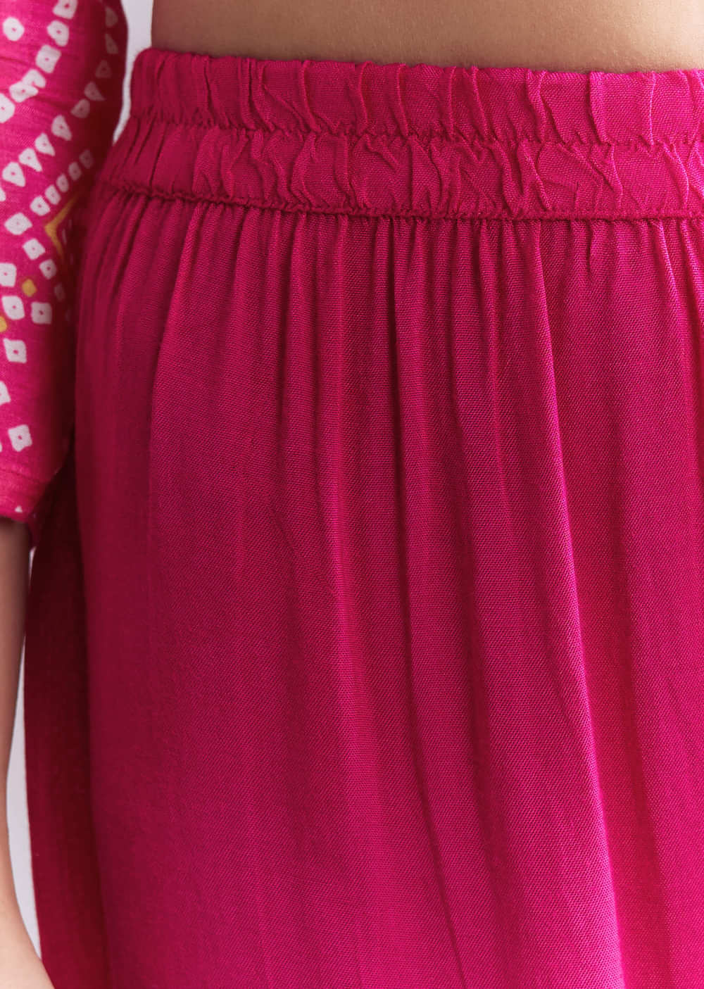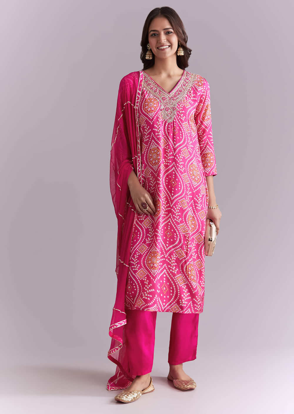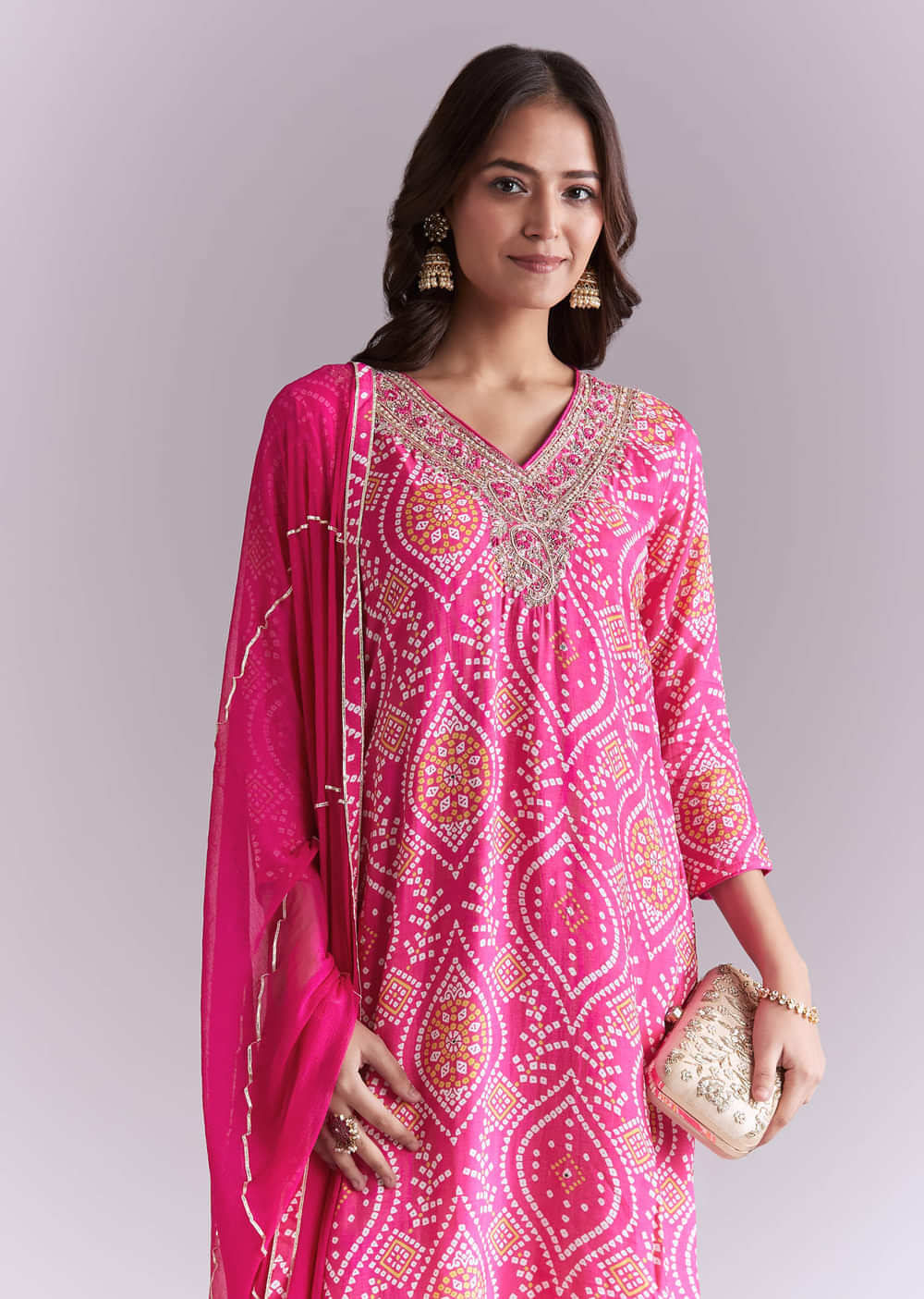 Pink Silk Kurta Set With Bandhani Print And Embroidery