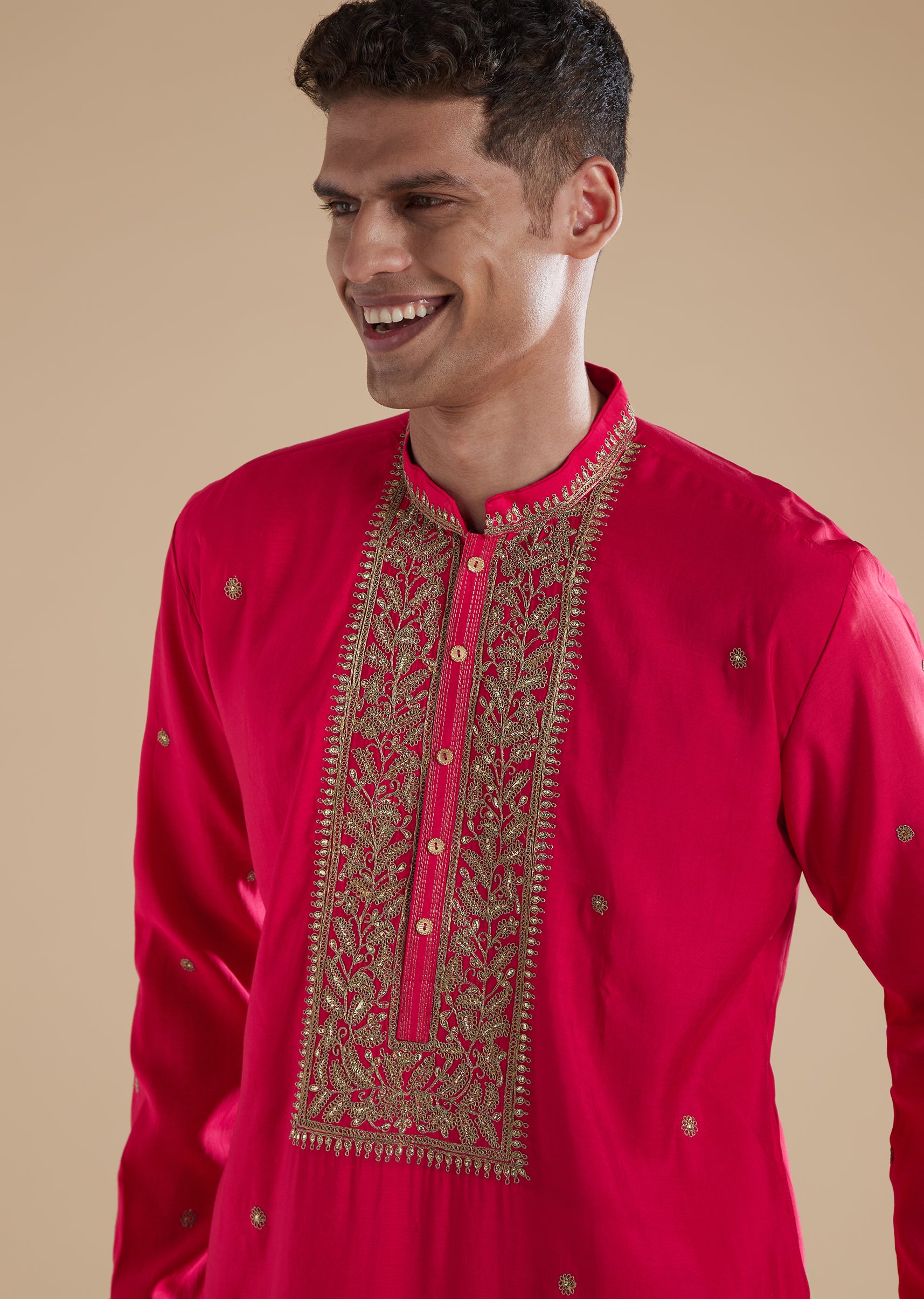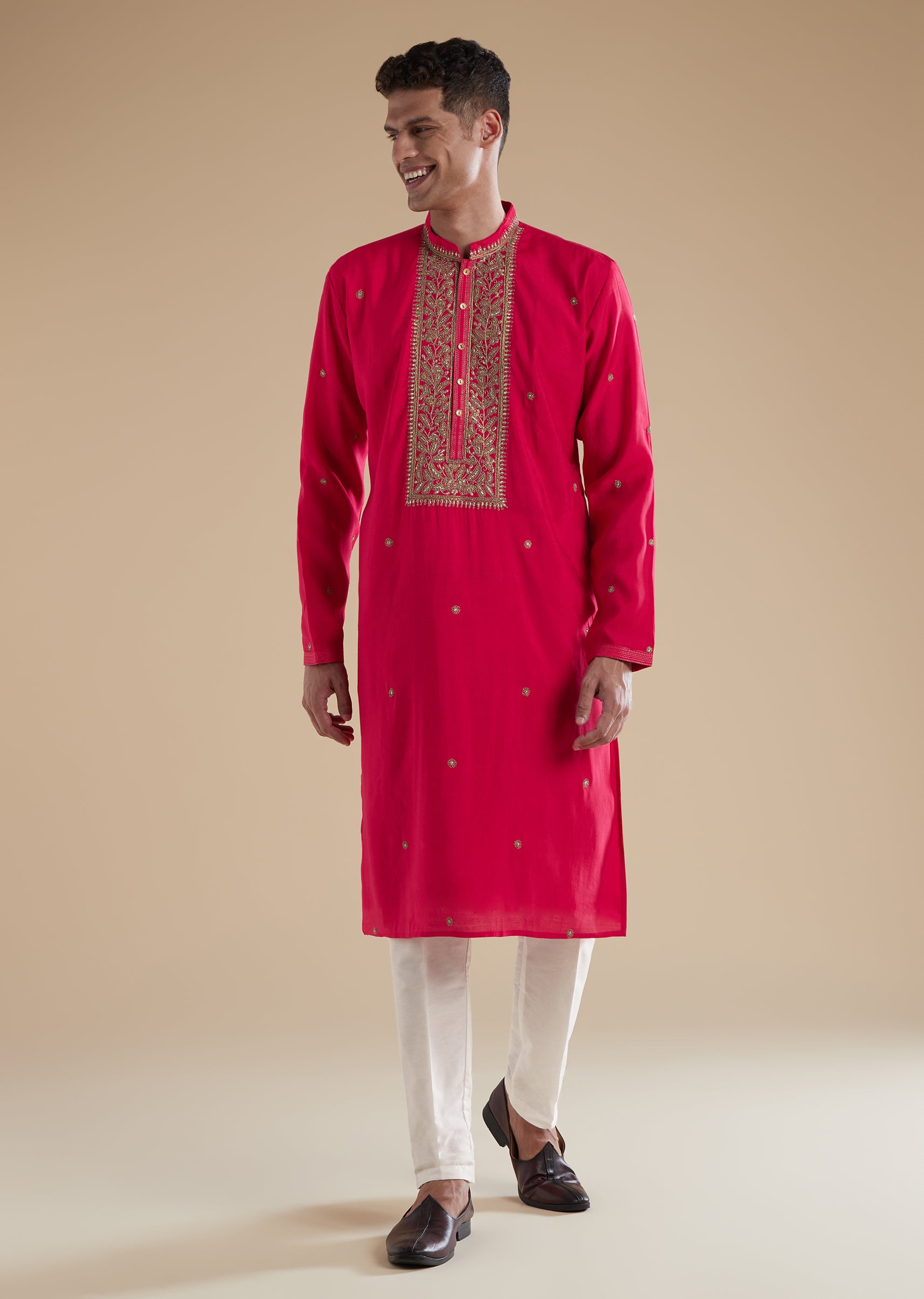 Soft and serene, this pink kurta set is crafted in premium silk with art silk as the secondary fabric for a smooth and elegant finish. Designed for festive pooja celebrations, the kurta features delicate thread and resham detailing that adds a subtle traditional charm. Styled with a mandarin collar, full sleeves, and clean front button closures on both the kurta and the coordinating pants, the ensemble offers a polished and graceful silhouette perfect for sacred and celebratory moments.
