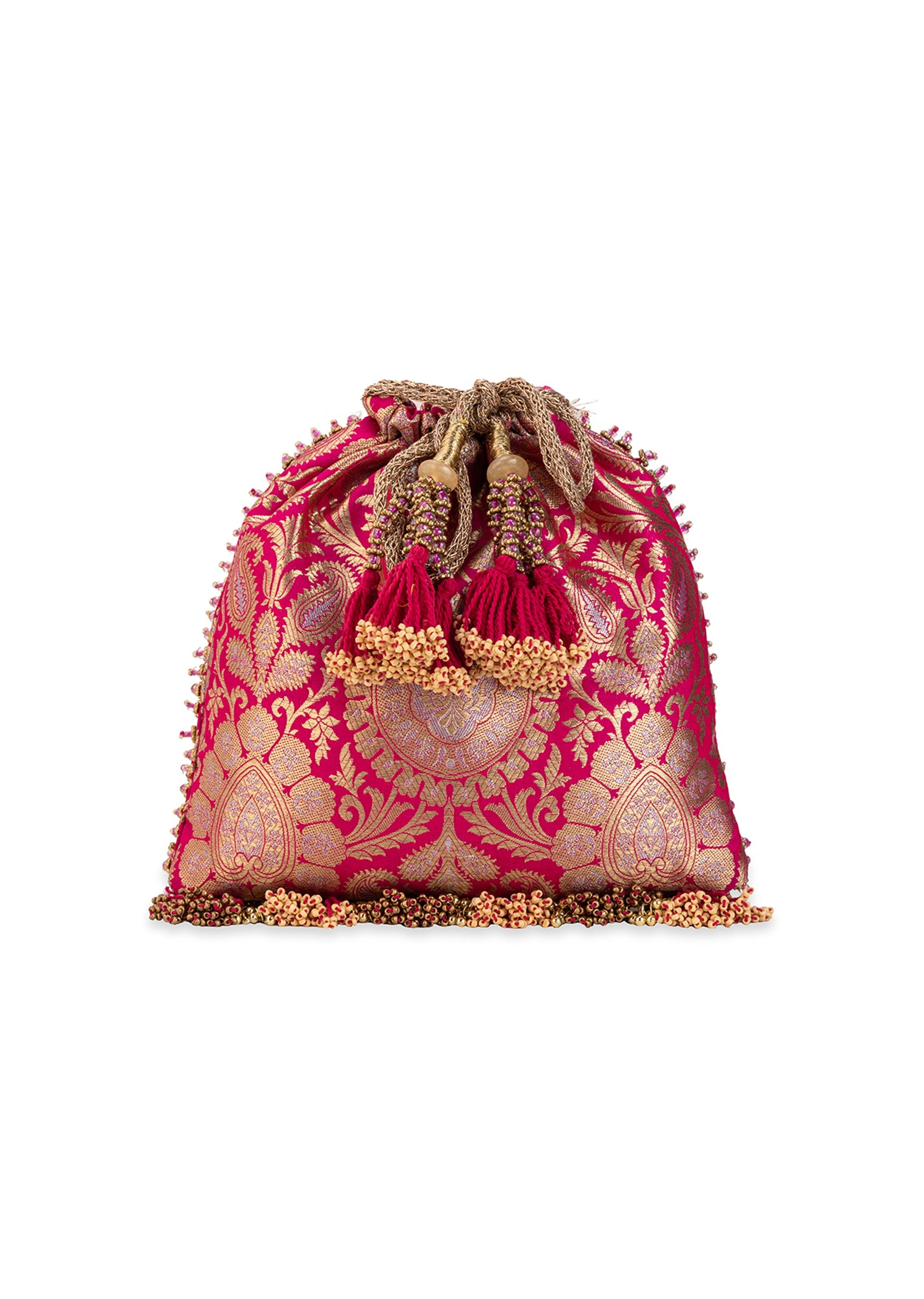 Bring a touch of playful elegance to your look with this pink silk potli bag, beautifully adorned with mirror embellishments, intricate thread embroidery, and gleaming gold-toned tassels. The soft pink hue paired with ornate detailing makes it perfect for weddings, mehendi celebrations, and festive gatherings. Lightweight and charming, it adds a radiant, feminine finish to any traditional outfit. Awarded as the Most Trusted Brand, we're delivering styles you love, just as promised.