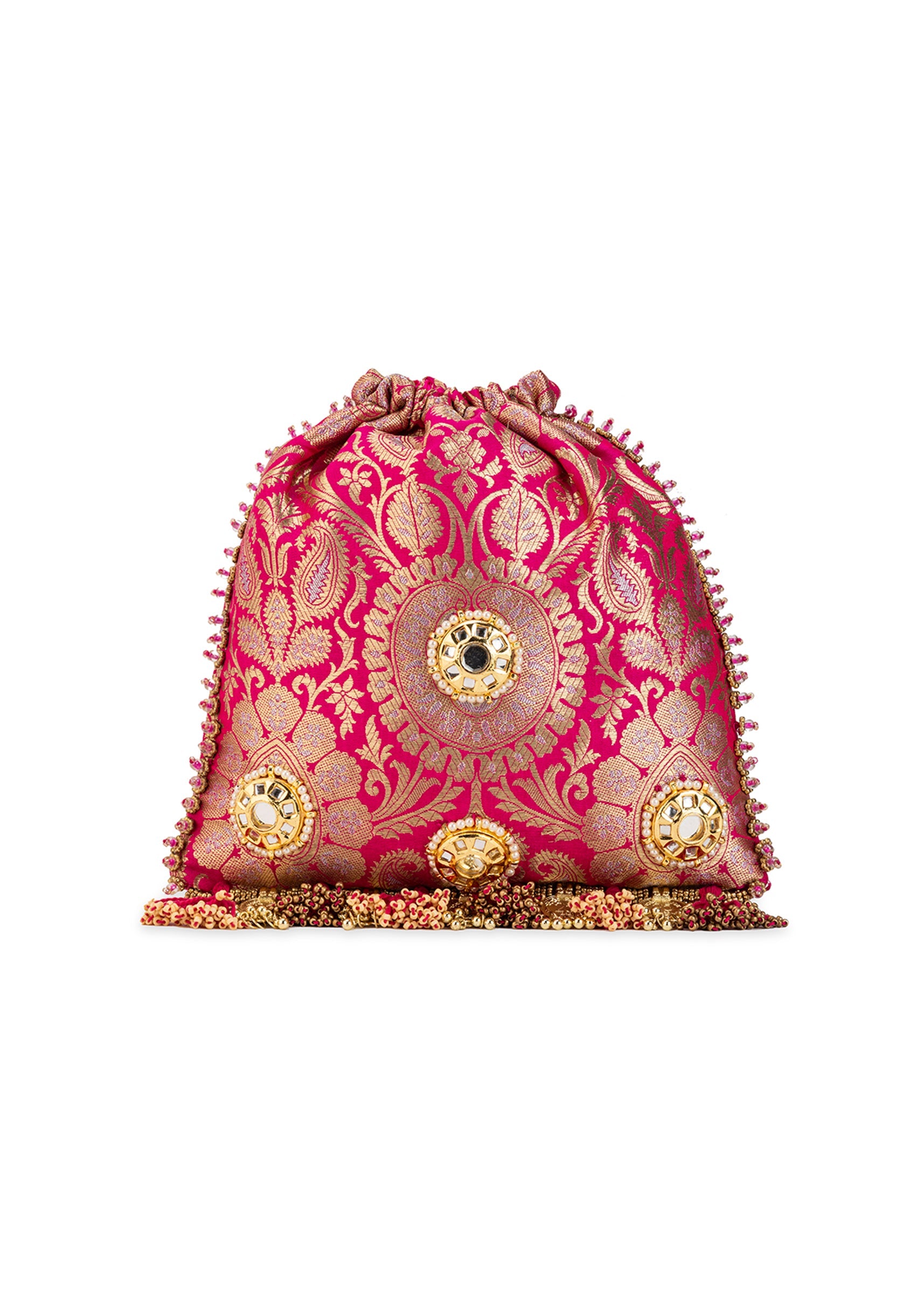 Pink Silk Mirror Embellished Tassel Potli Bag