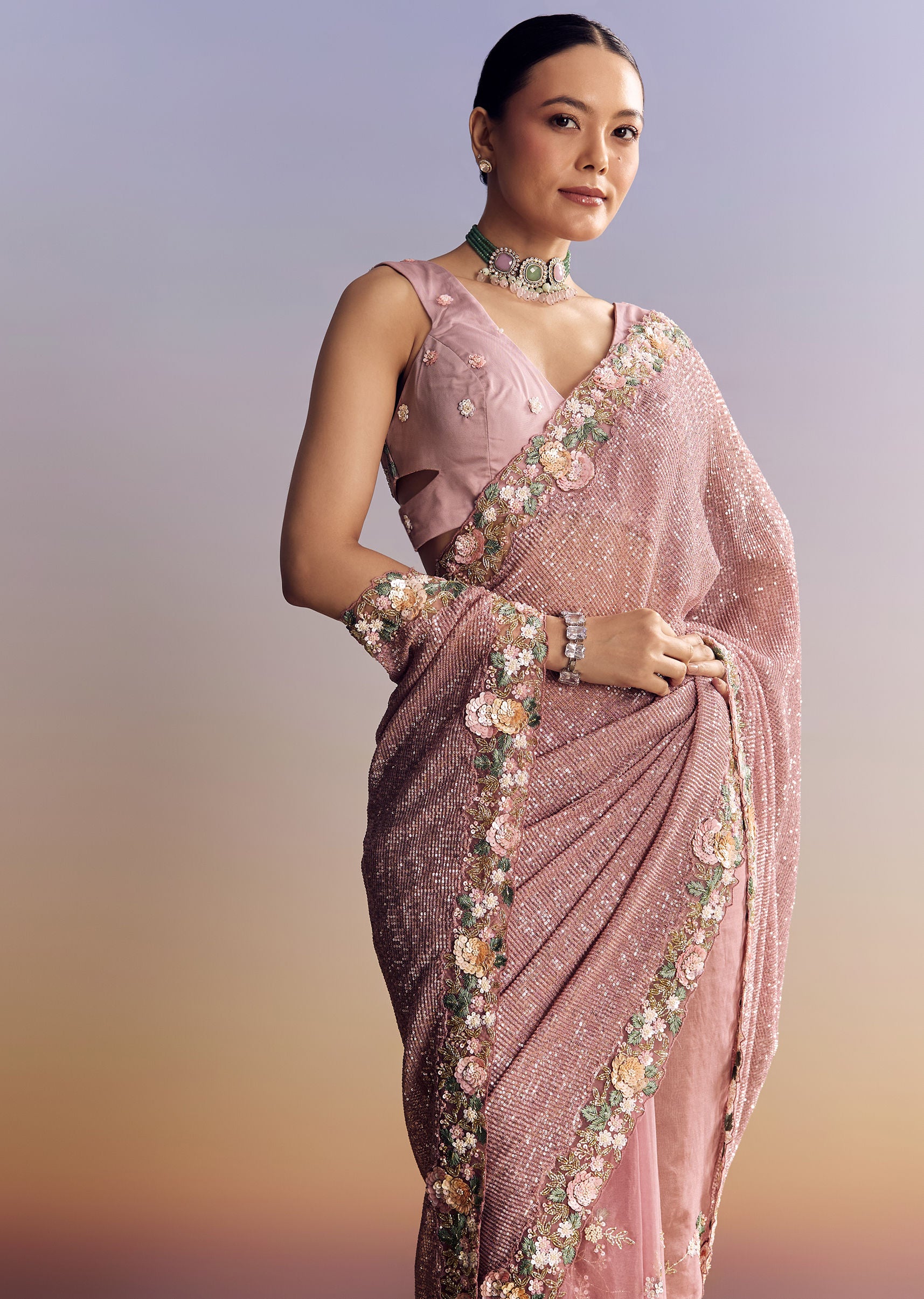 Pink Tissue Half And Half Saree With Floral Sequin Embroidery