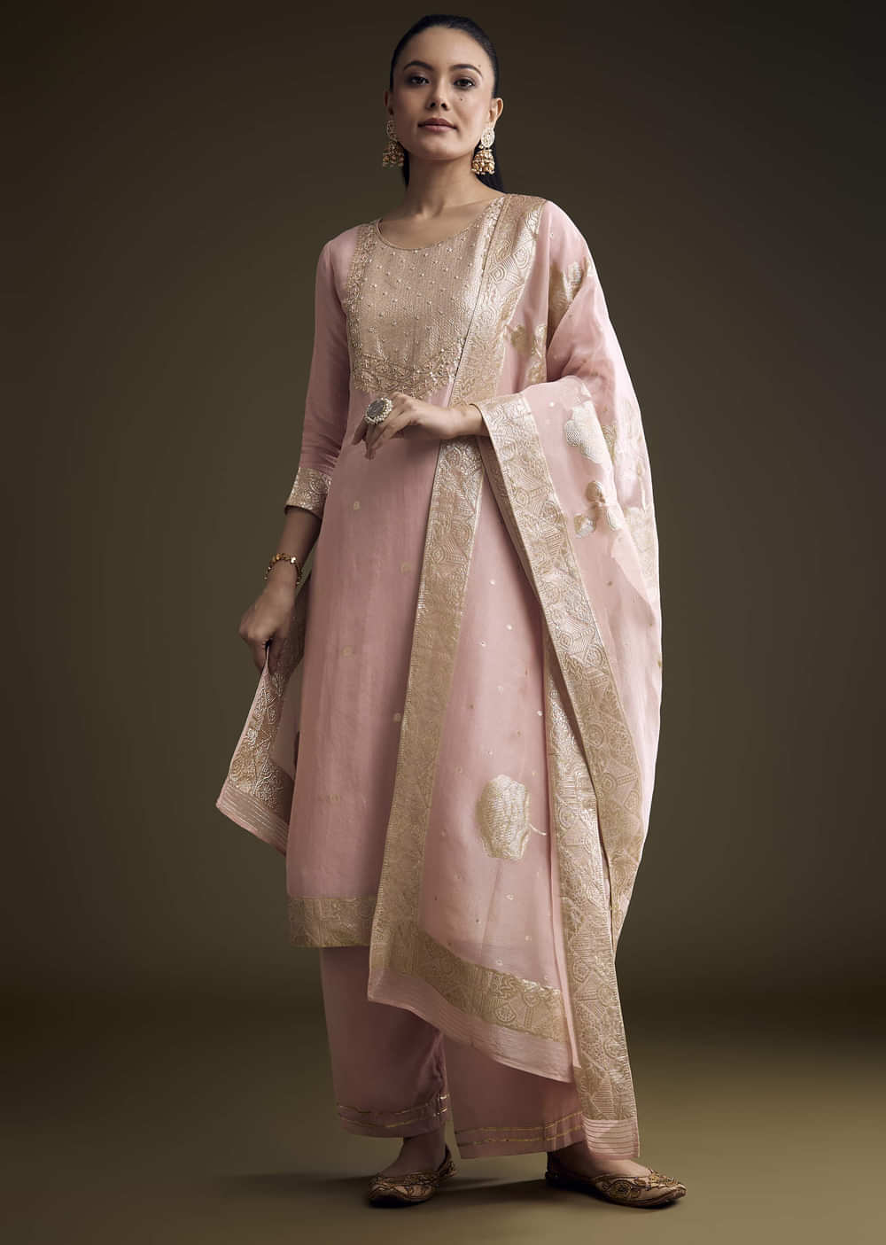 Pink Tissue Kurta Set With Zardosi Work And Banarasi Weave