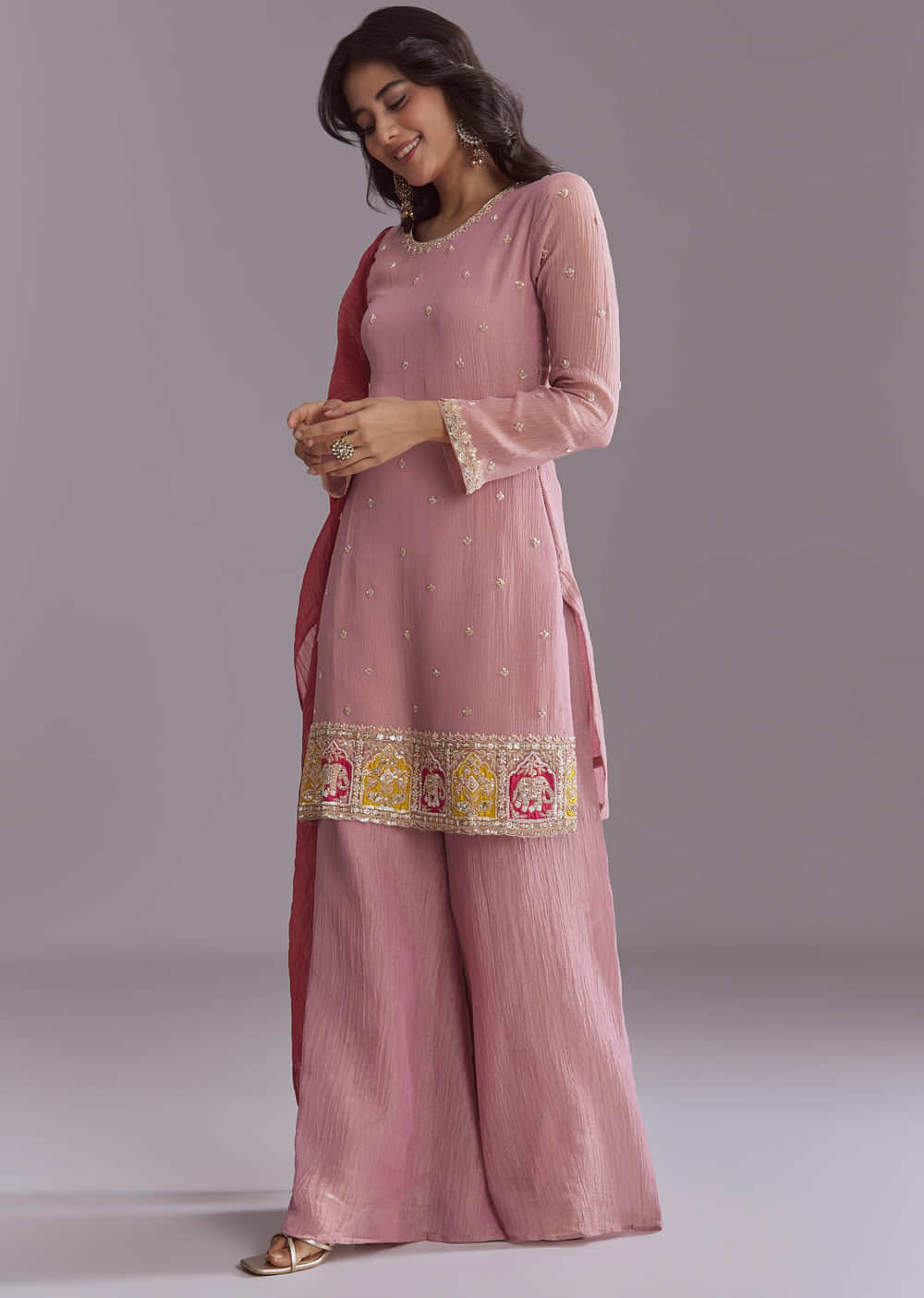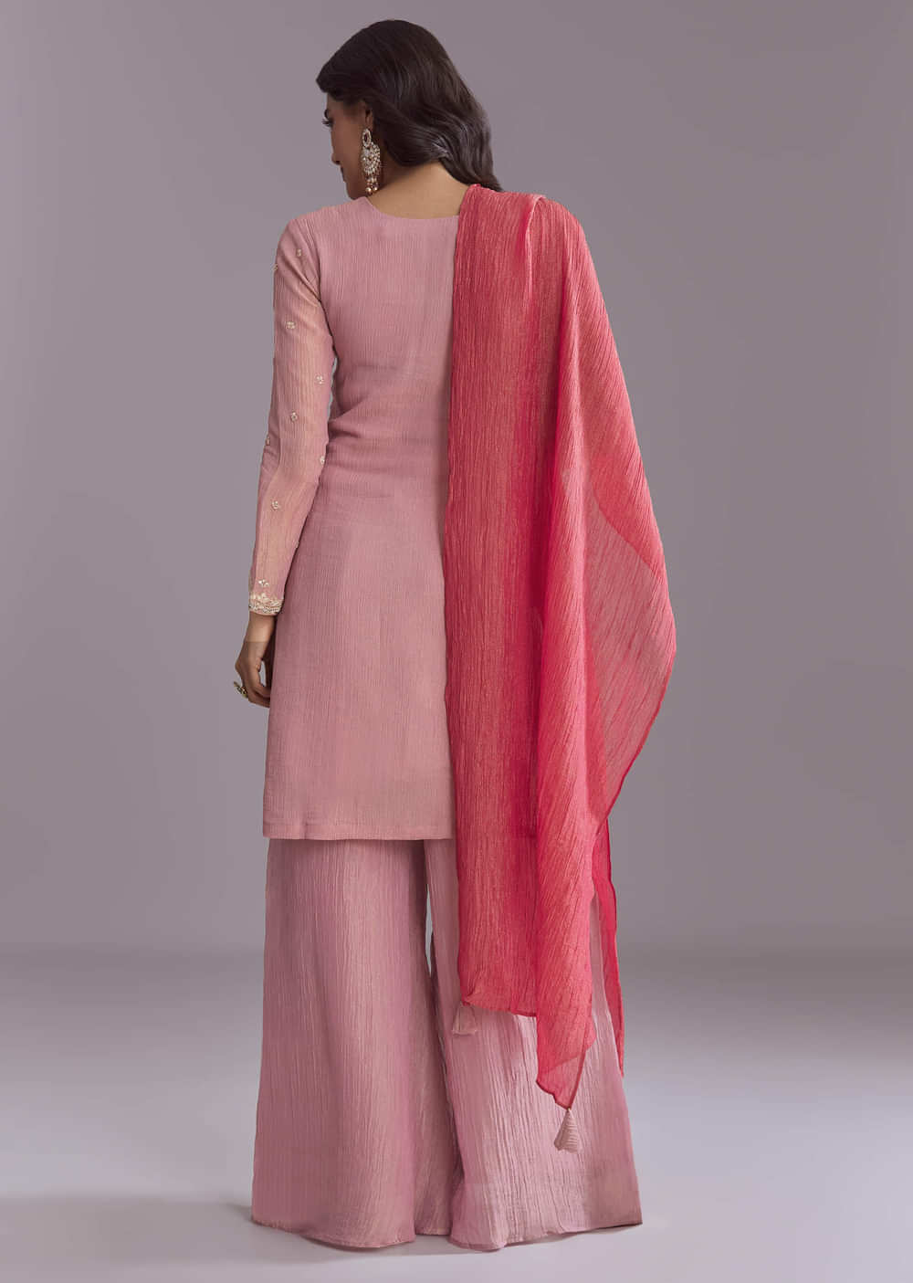 Pink Tissue Palazzo Suit With Embroidery And Contrast Dupatta