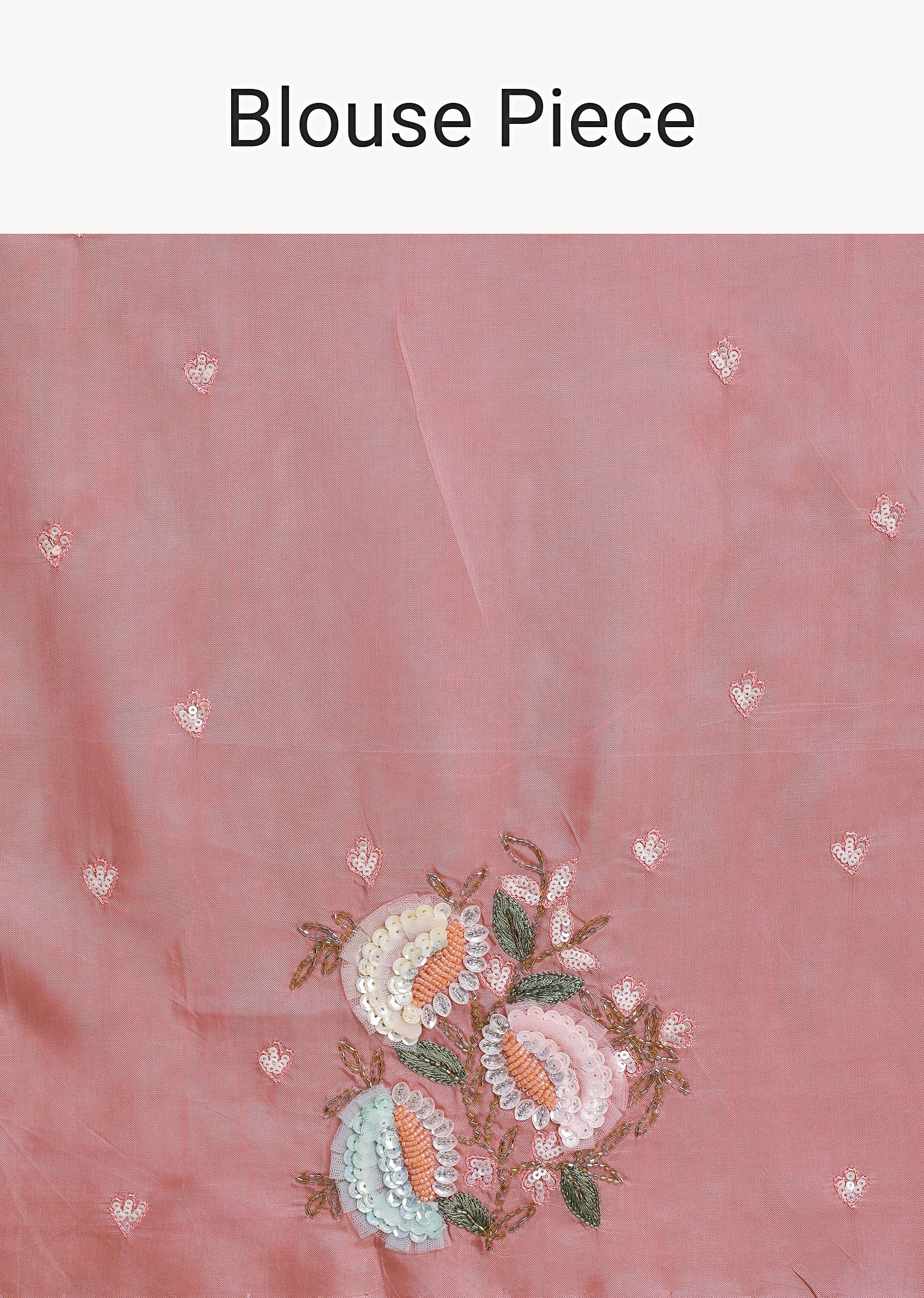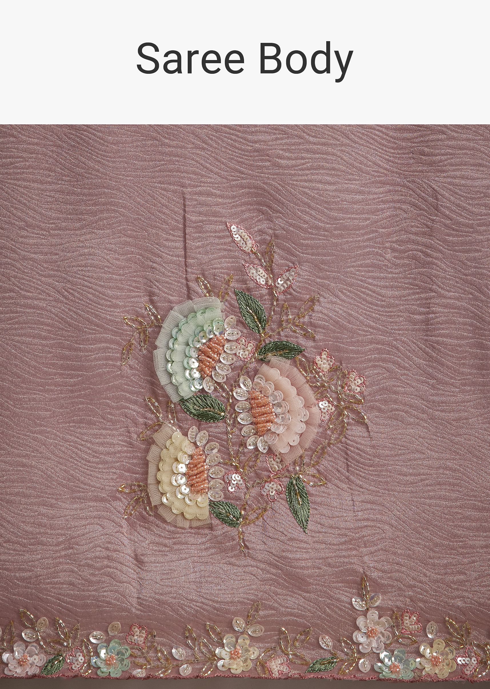 - Drape Yourself In Elegance With This Pink Tissue Saree Adorned With Intricate Floral Embroidery.