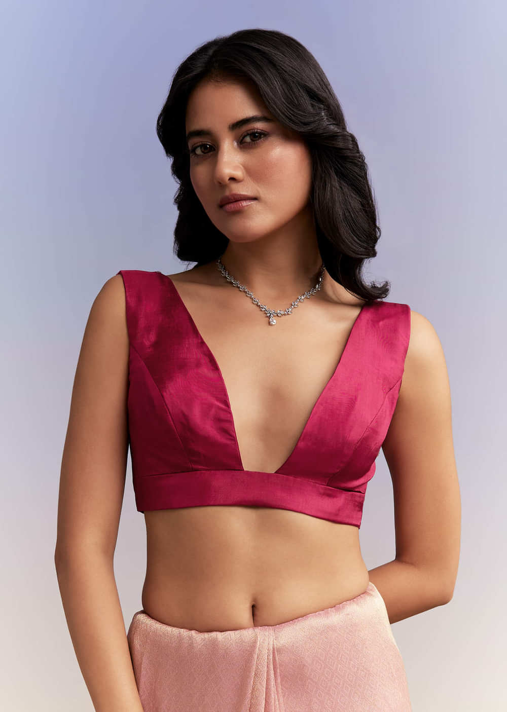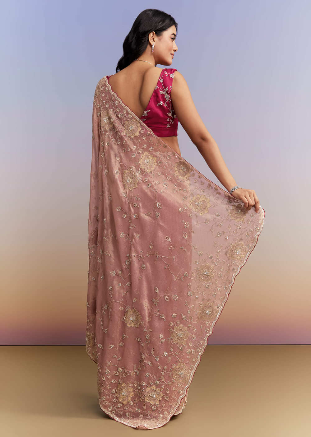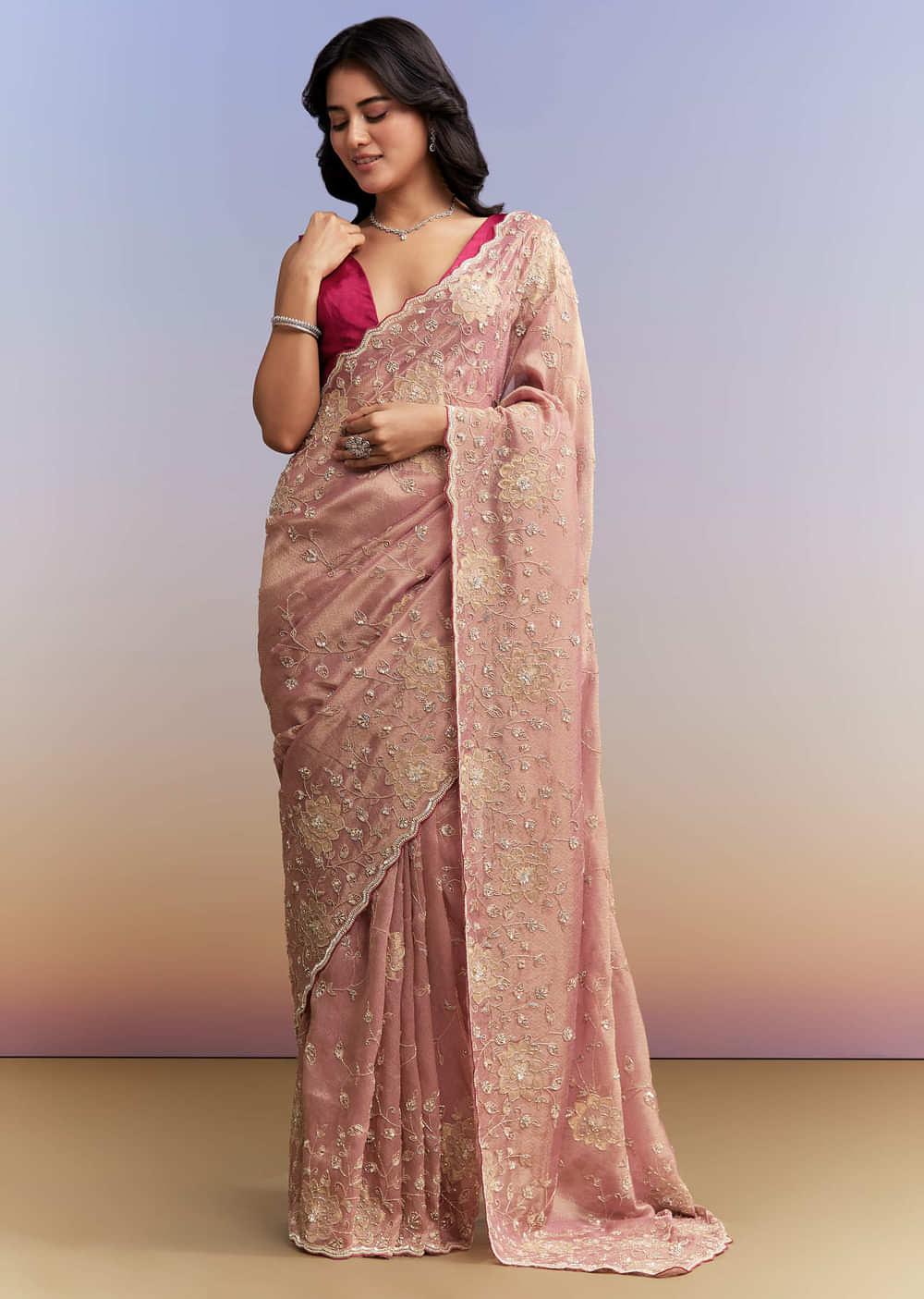 For timeless texture with statement edges, this pink tissue saree pairs a luminous base with crafted detail. A cutwork border frames a heavy embroidered body in cutdana, sequins and beads, neatly finished with zardosi, and a contrast blouse fabric completes the set. You feel elegant and festive as a bridesmaid or the bride’s mother for engagement, mehendi and sangeet functions. Awarded as the Most Trusted Brand, we're delivering styles you love, just as promised.