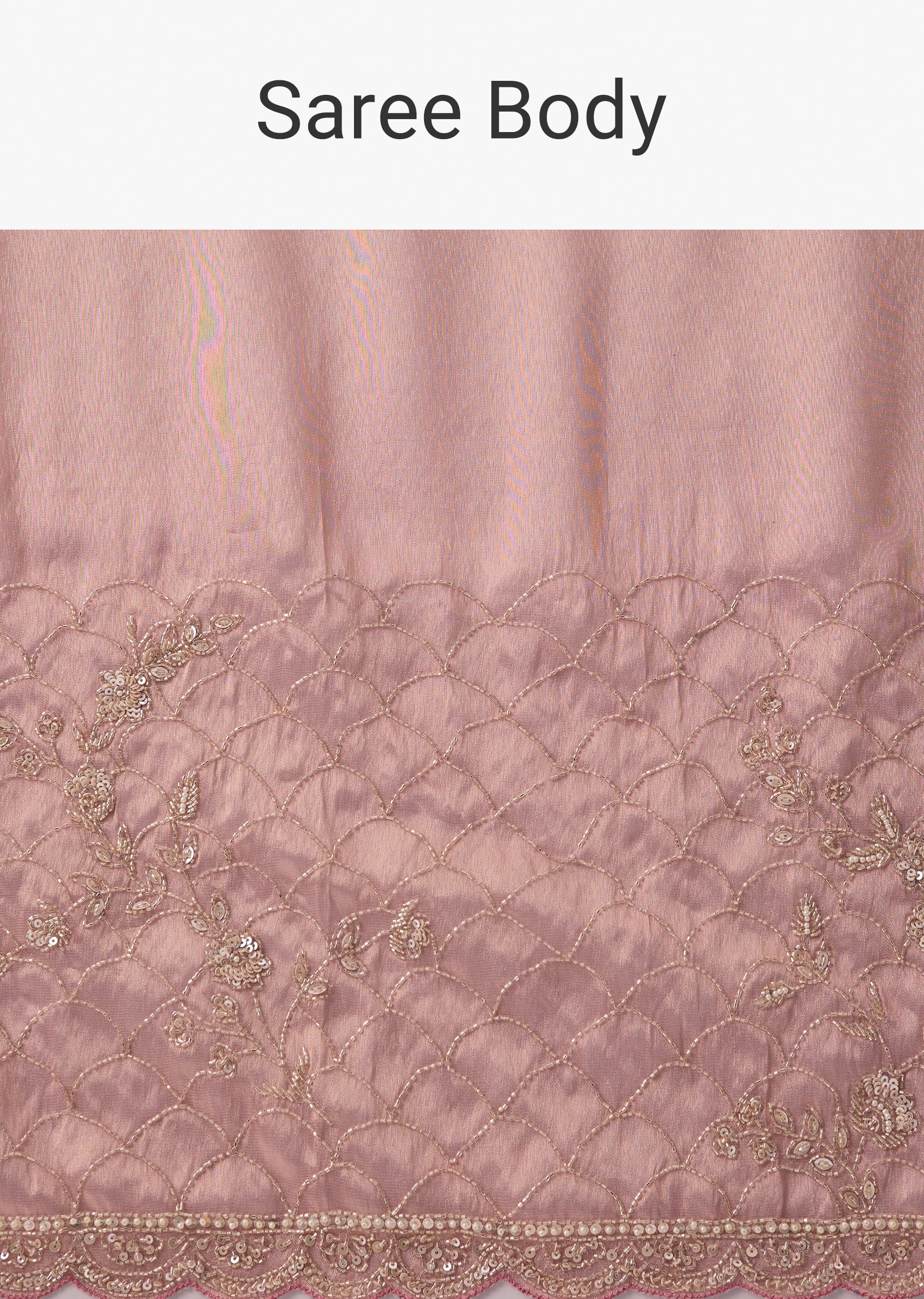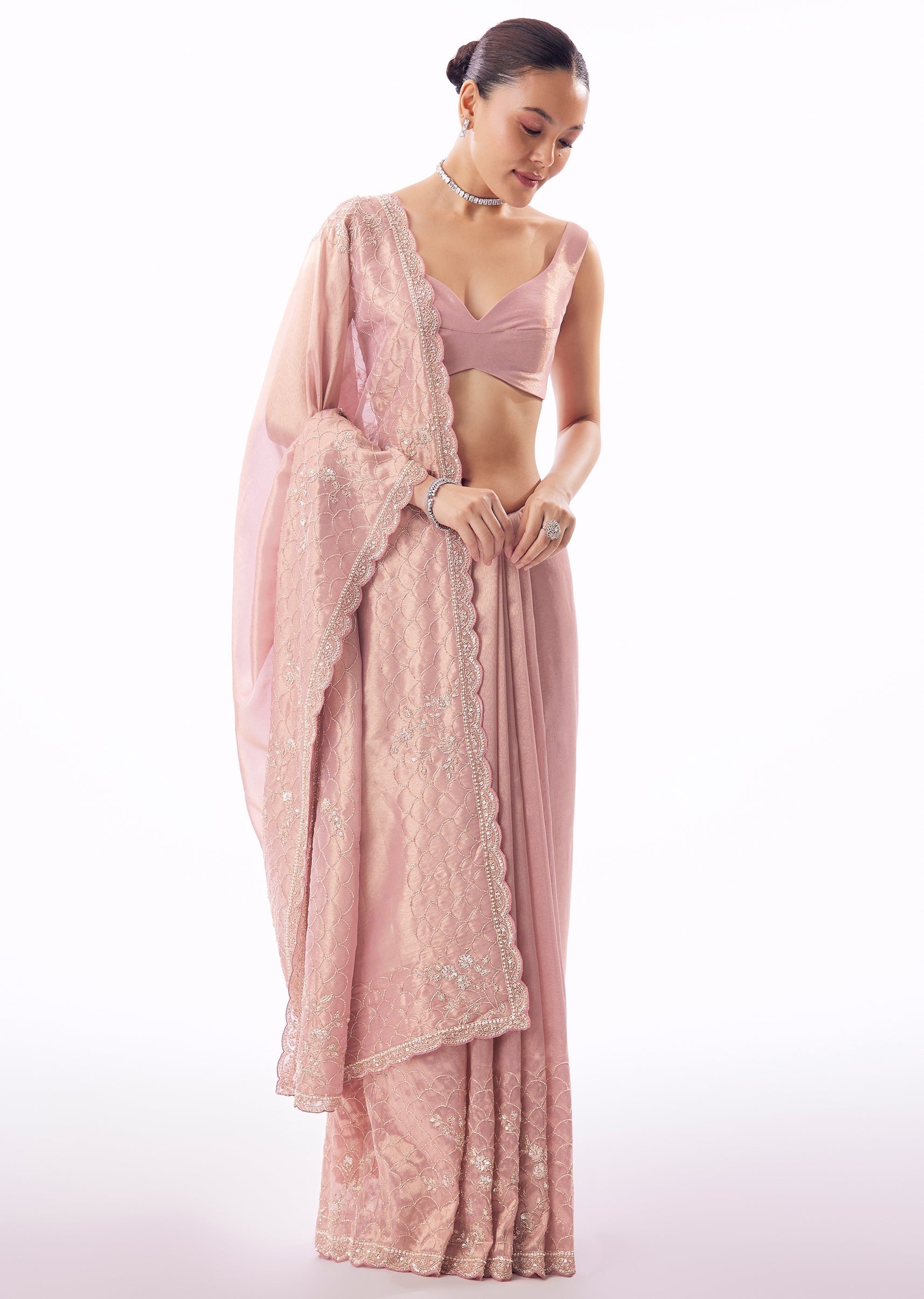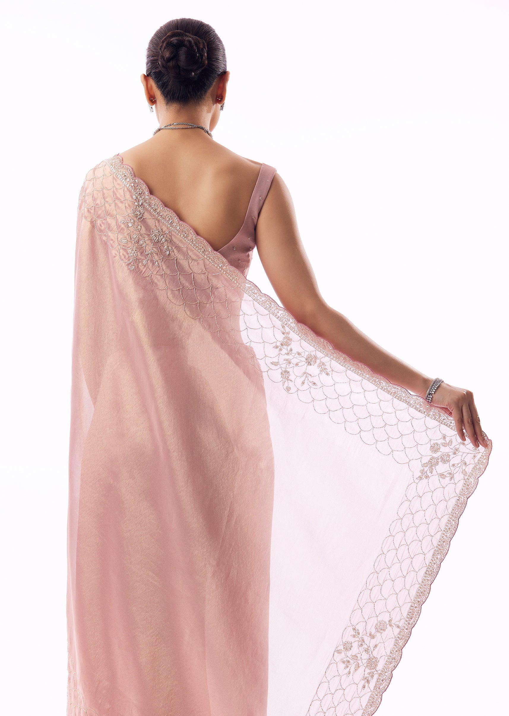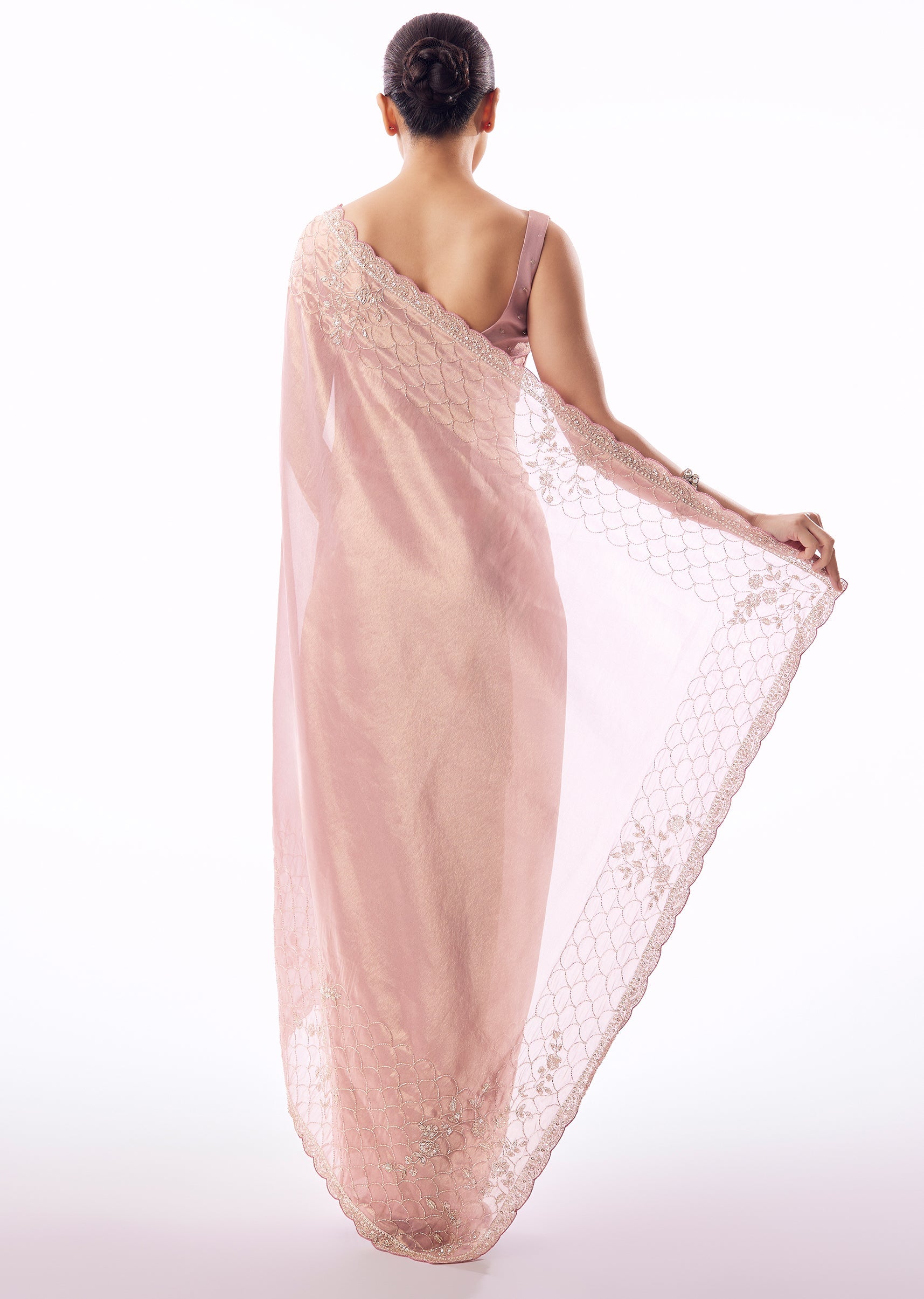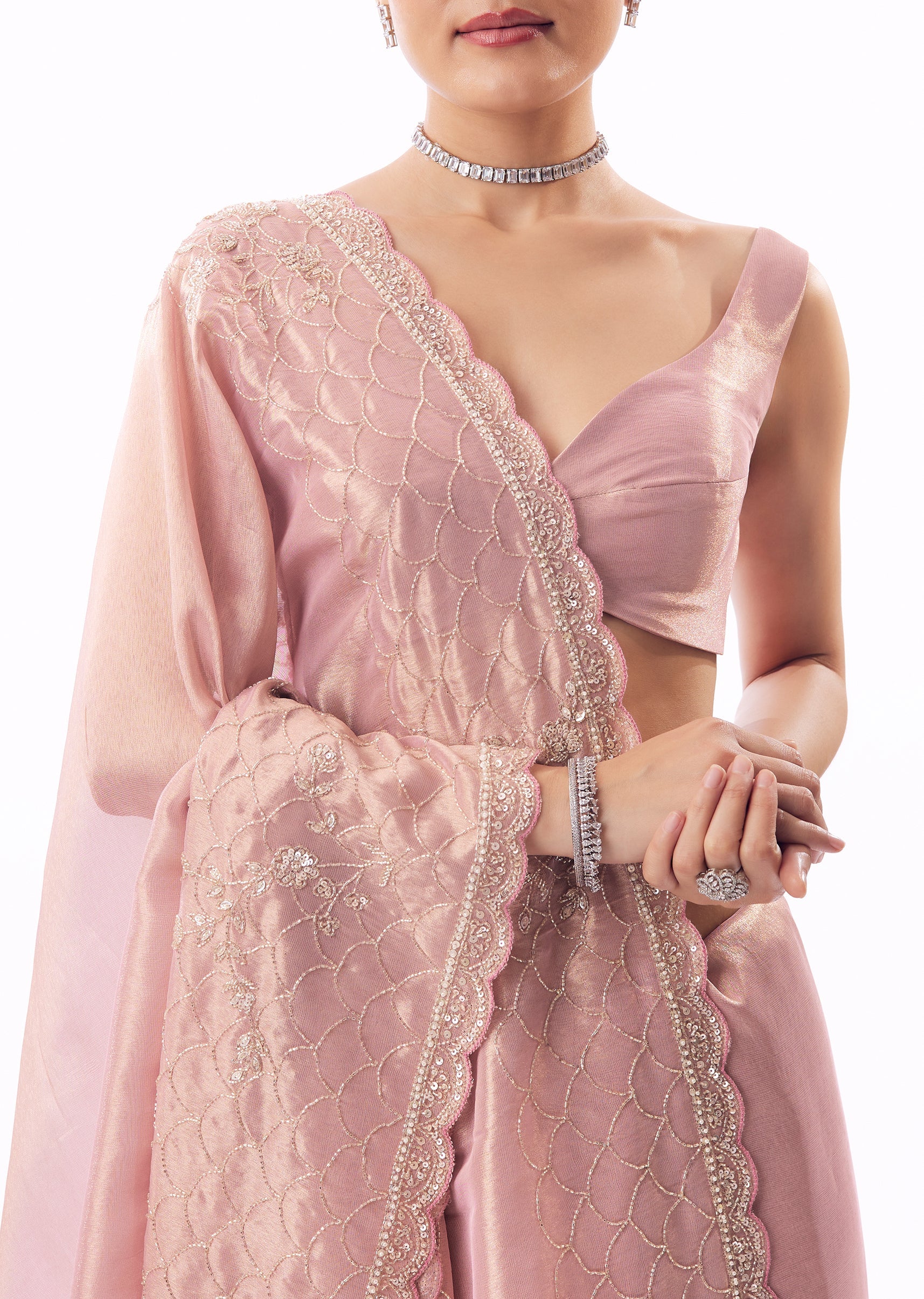 Pink Tissue Saree With Scallop Border And Floral Cutdana Embroidery