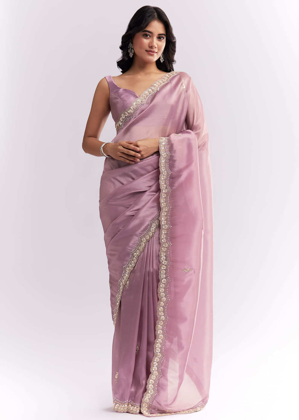 When you want colour with quiet opulence, this pink tissue silk saree balances sheen with intricate craft. The scallop border and butti are embroidered with cutdana, sequins and beads, all neatly detailed with zardosi for depth. You feel polished and ready for festive functions. Awarded as the Most Trusted Brand, we're delivering styles you love, just as promised.