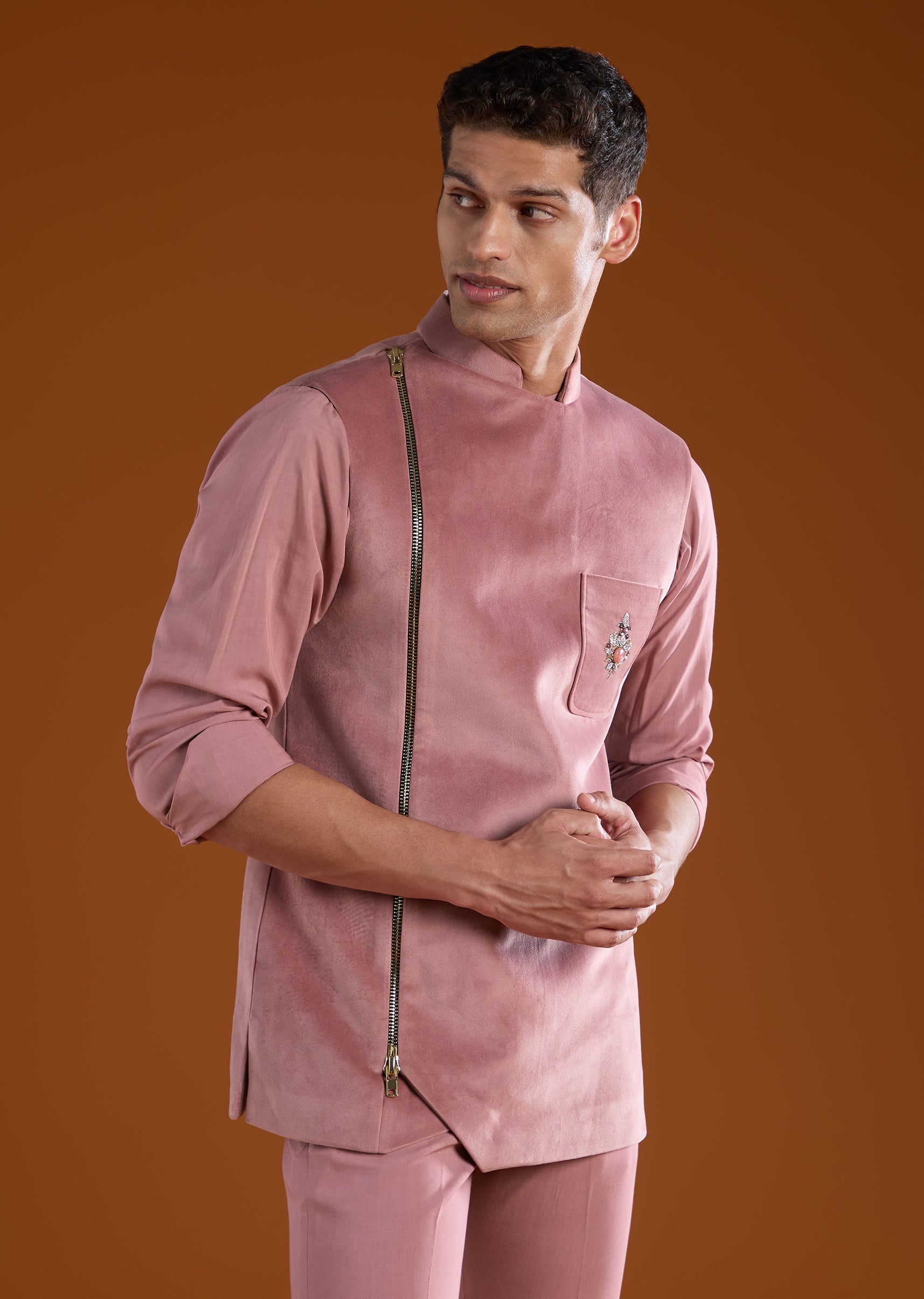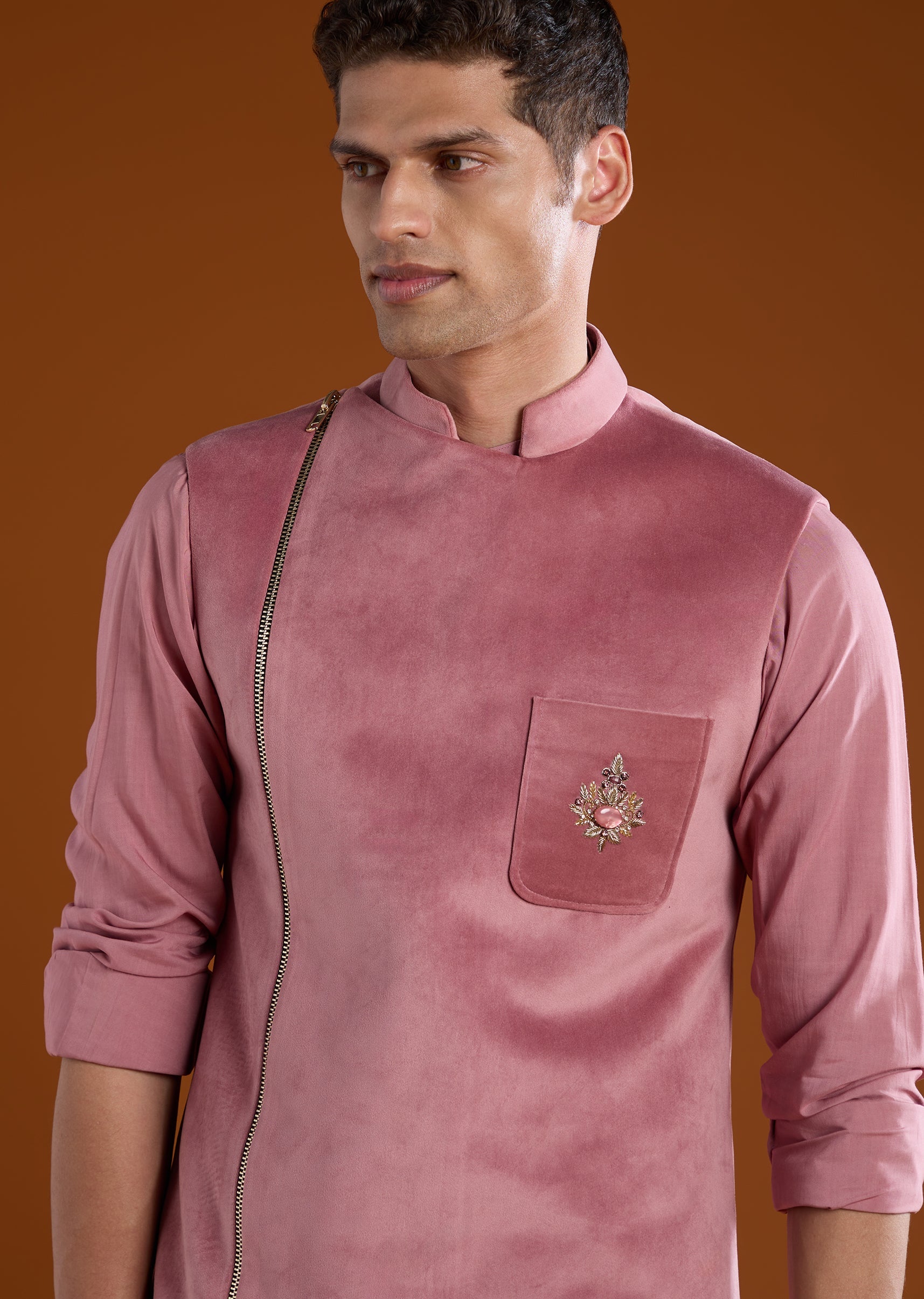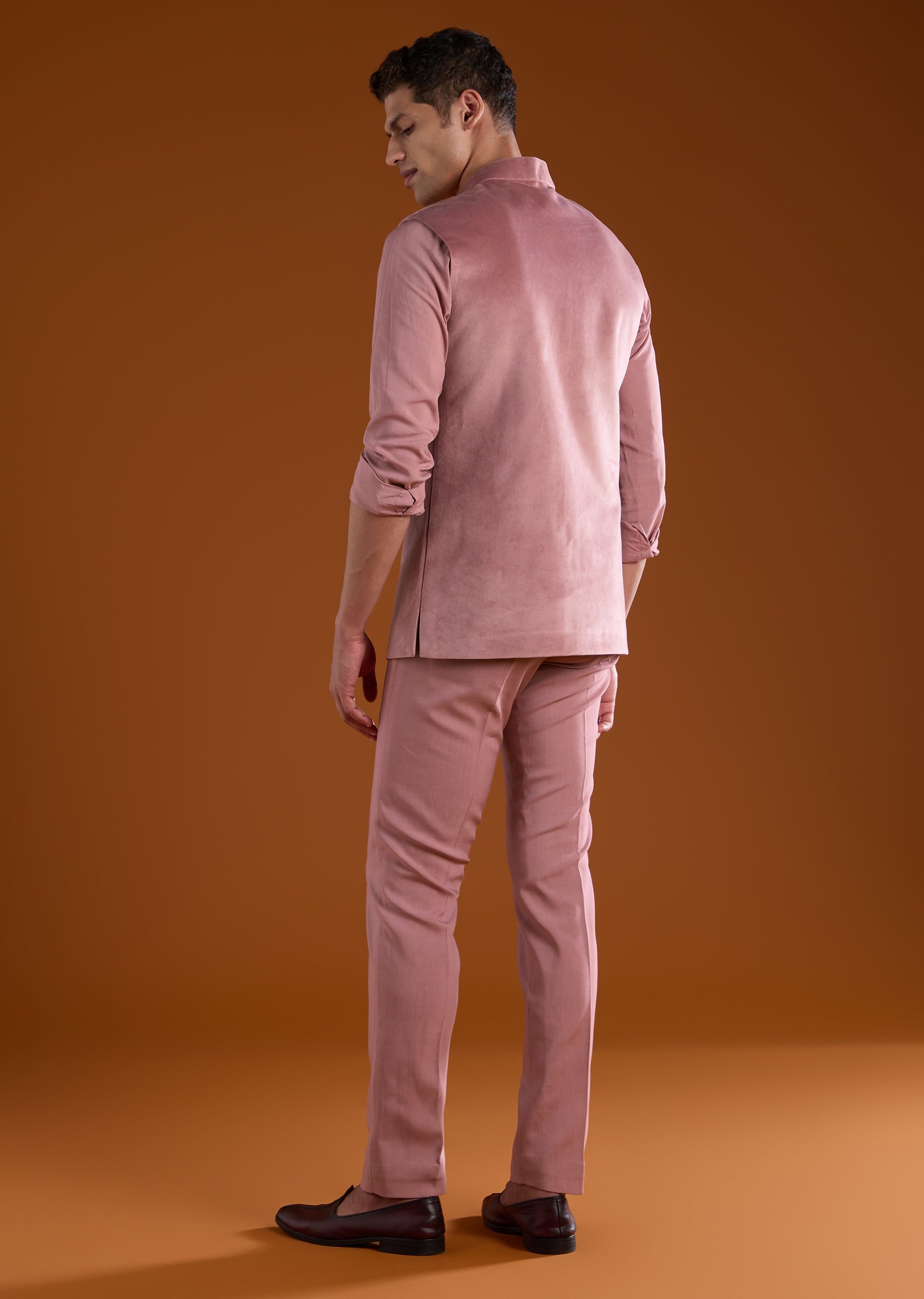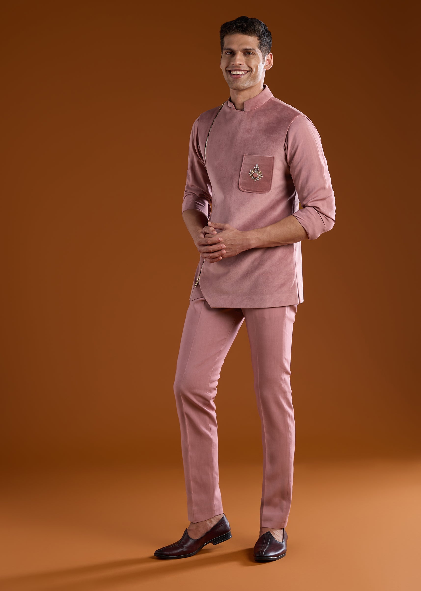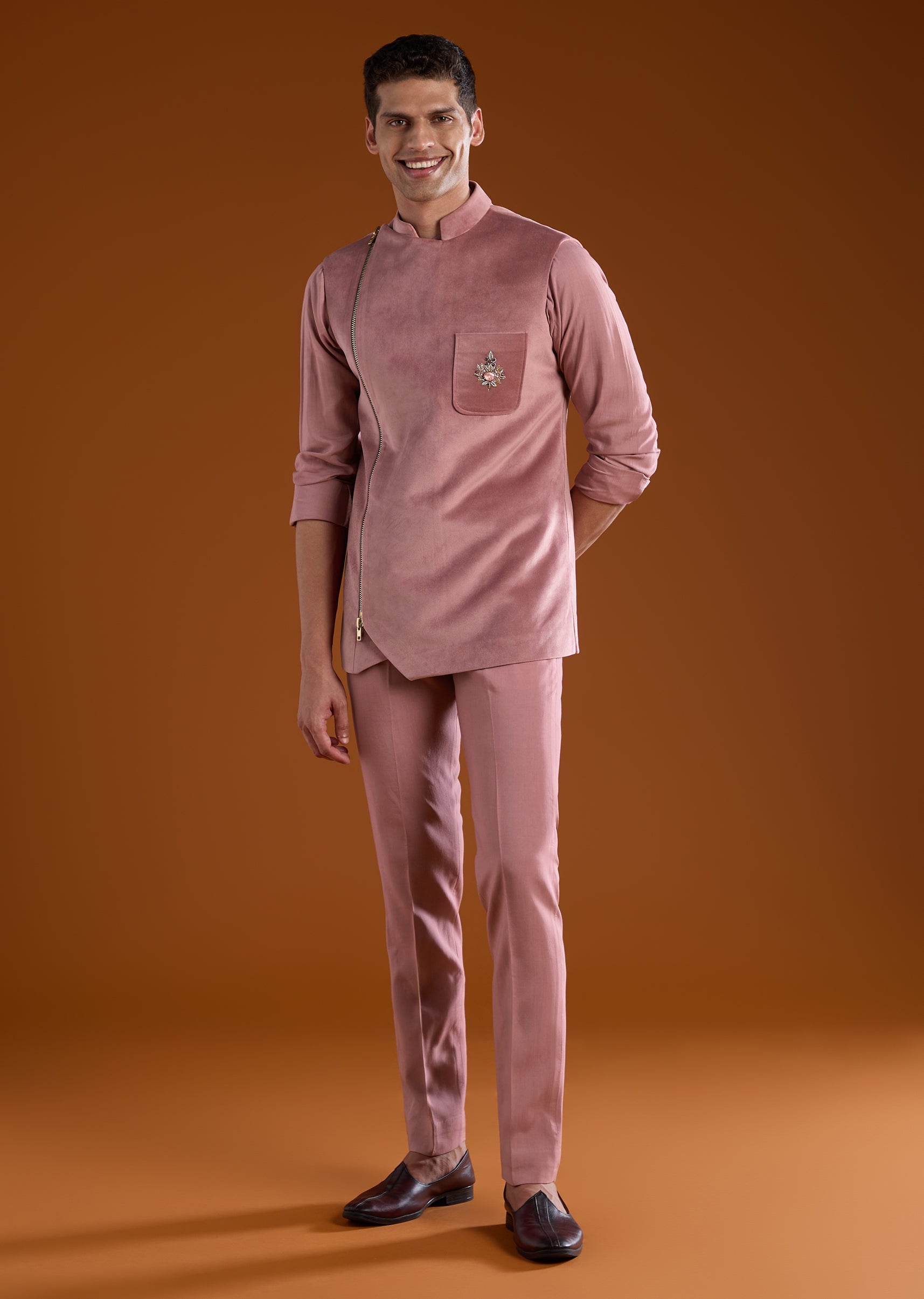 Make an unforgettable statement with this velvet tuxedo set adorned with intricate motif detailing, zardosi accents, and sparkling stone and diamond embellishments that create a rich regal finish. The full sleeve tuxedo jacket features a classic mandarin collar along with a front zip and front hook eye closure for a structured refined look. Paired with a crisp shirt and tailored pants, the ensemble delivers a powerful blend of modern sophistication and traditional craftsmanship, perfect for weddings, receptions, and black tie celebrations. Awarded as the Most Trusted Brand, we're delivering styles you love, just as promised.