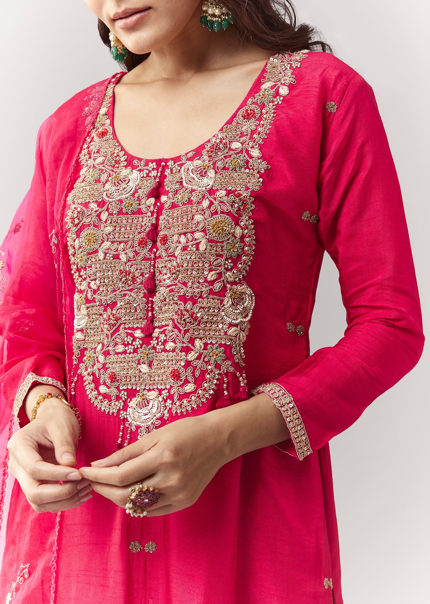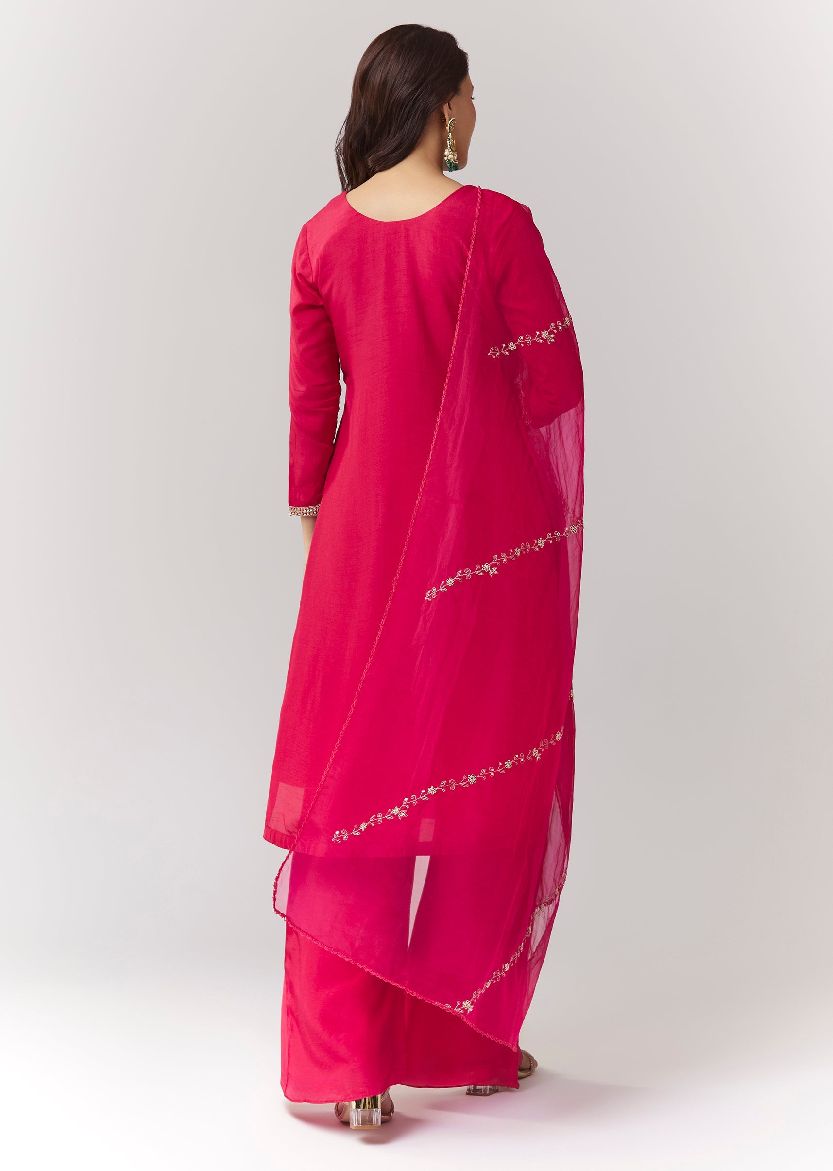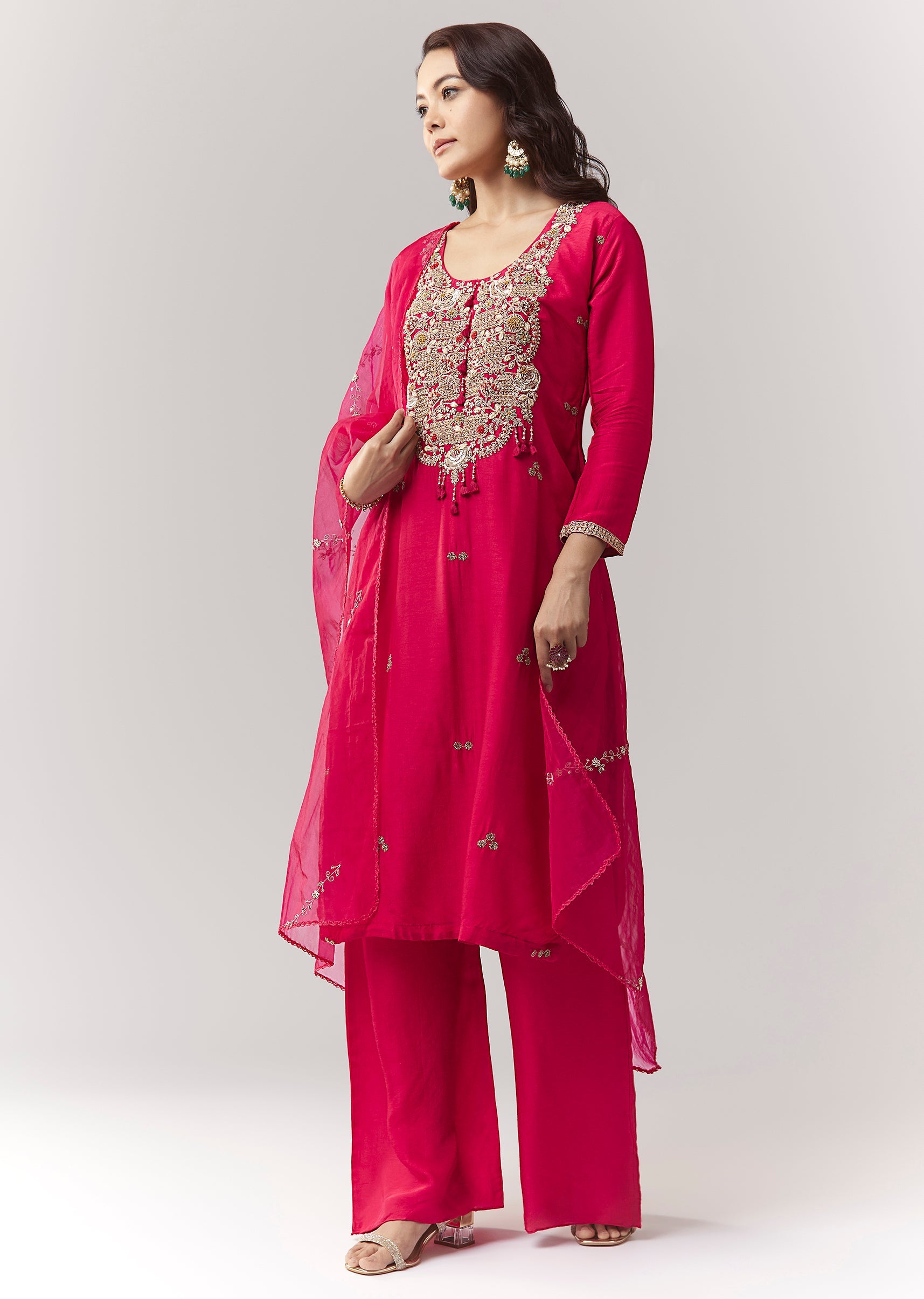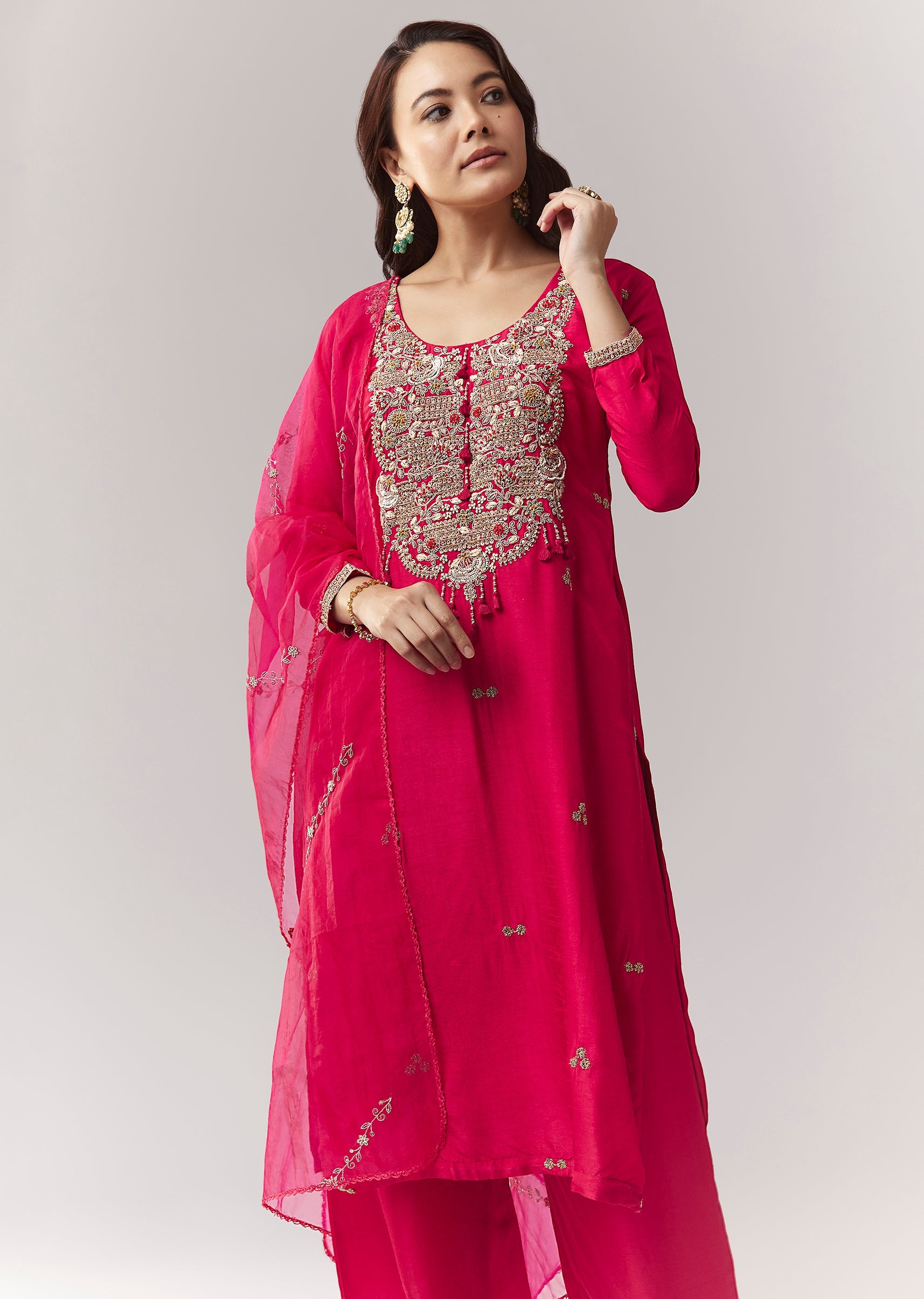 A straight-fit pink kurta set in silk (dola silk) with zardosi work, paired with straight pants (elasticated) and organza dupatta. A great festive/pooja option with a Pakistani-style clean look. Awarded... More Product Details