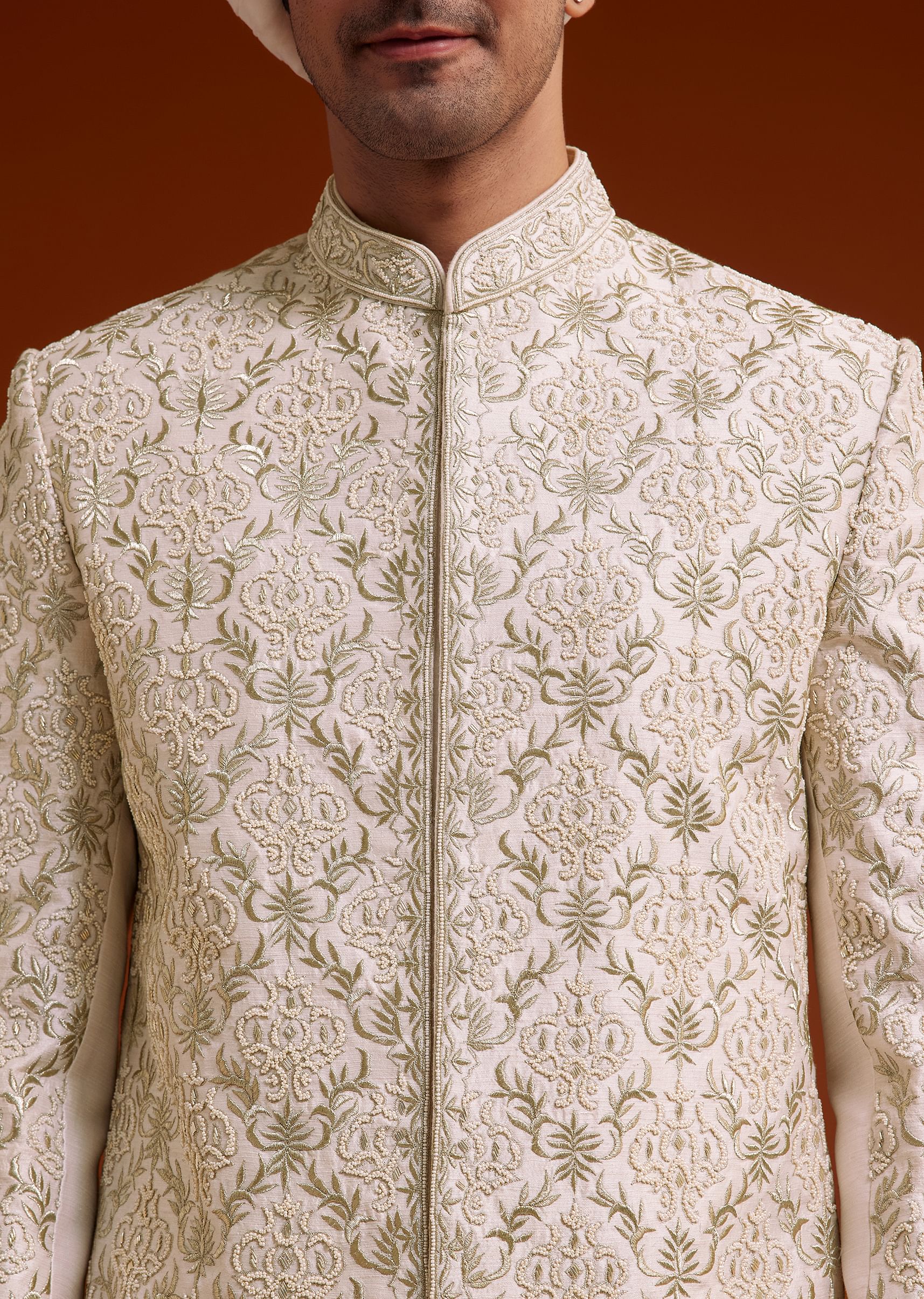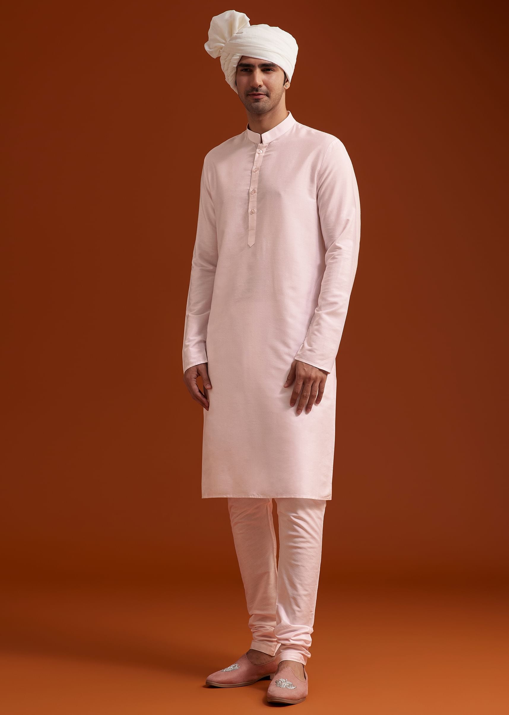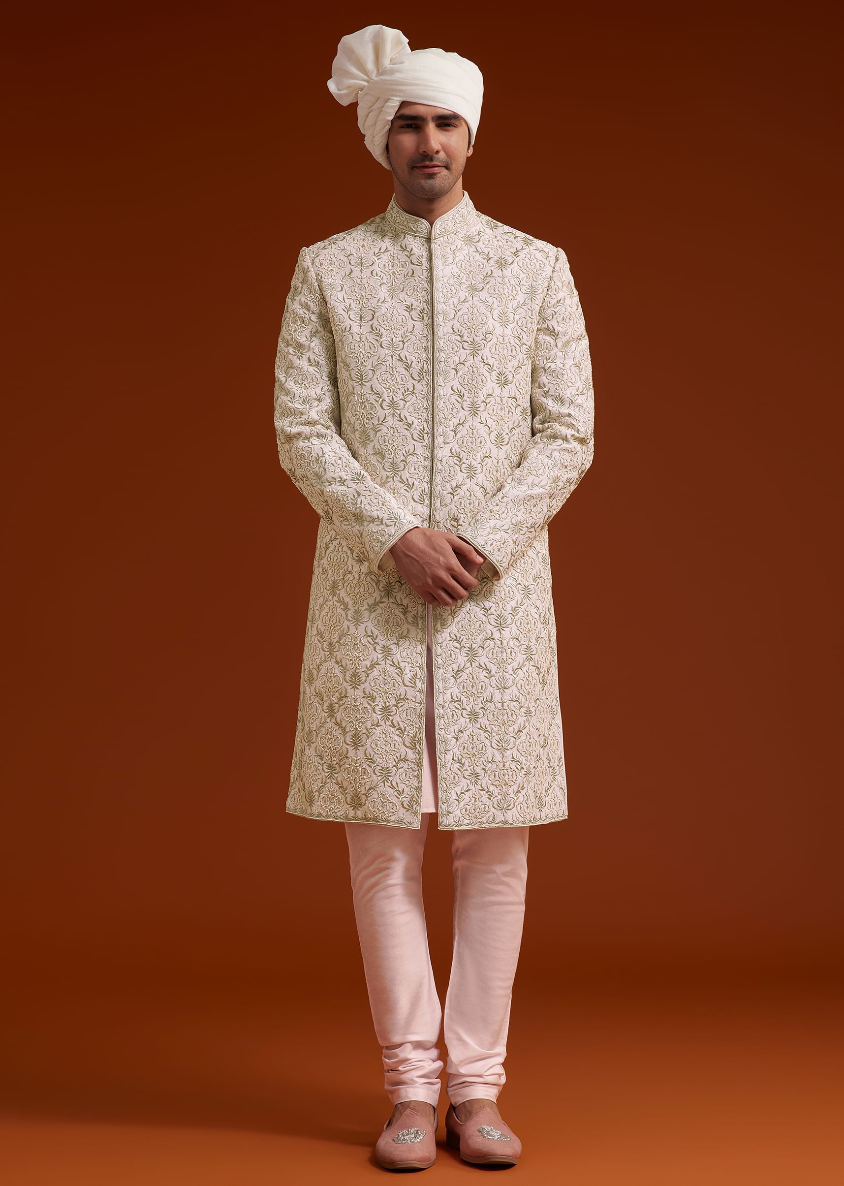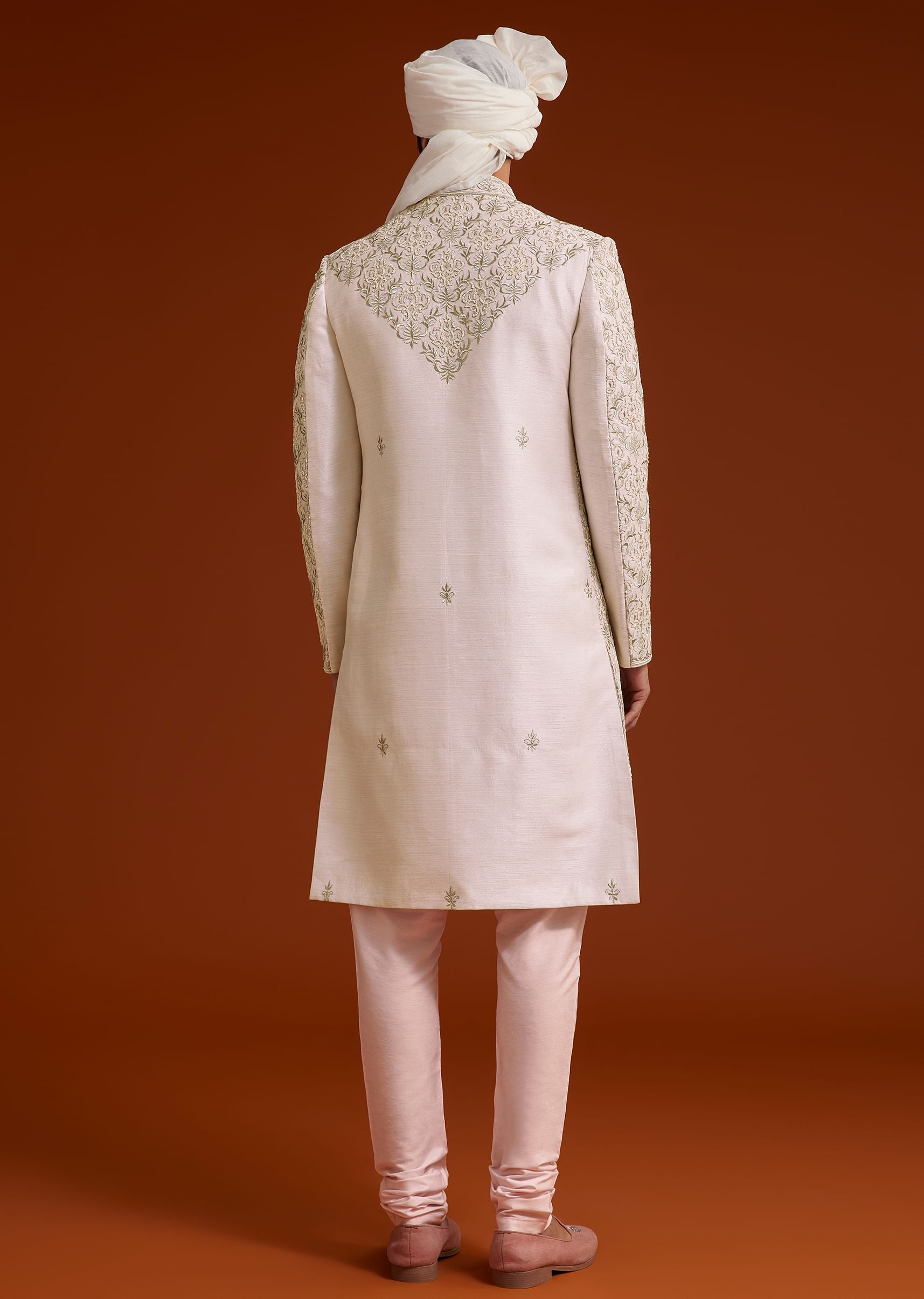 This elegant pink sherwani set showcases intricate zari pearl and resham embroidery, creating a timeless masterpiece of refined craftsmanship. The detailed work extends across the entire sherwani and back yoke, enhancing its regal appeal. Paired with a matching kurta and tailored bottom, it offers a sophisticated and structured silhouette. A perfect choice for weddings and grand celebrations, this ensemble embodies luxury and grace. Awarded as the Most Trusted Brand, we're delivering styles you love, just as promised.