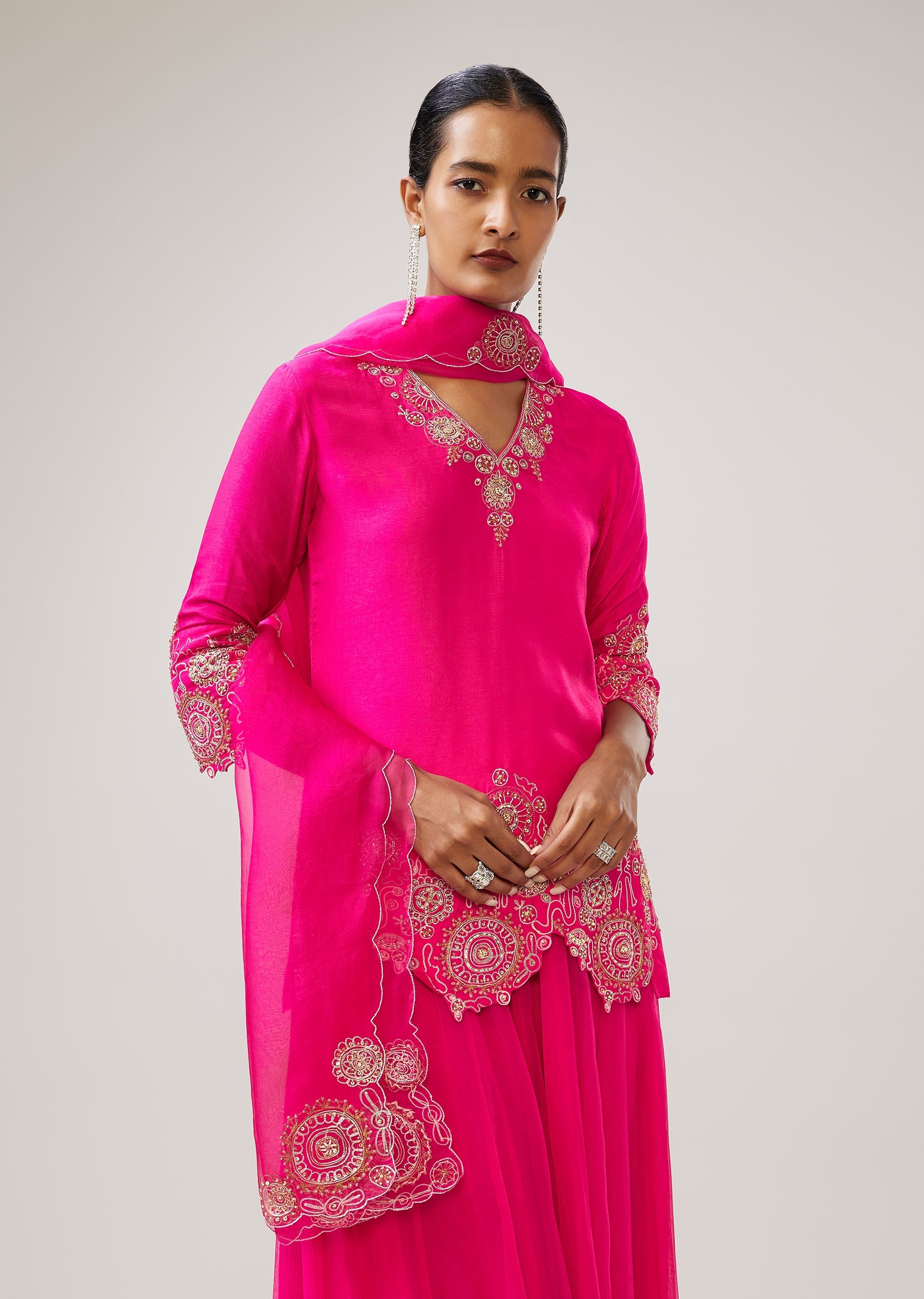 Designed for festive evenings, this pink silk kurta set features zari, sequin and resham embroidery for a refined shimmer. The straight kurta with 3/4th sleeves and a V-neckline is paired... More Product Details