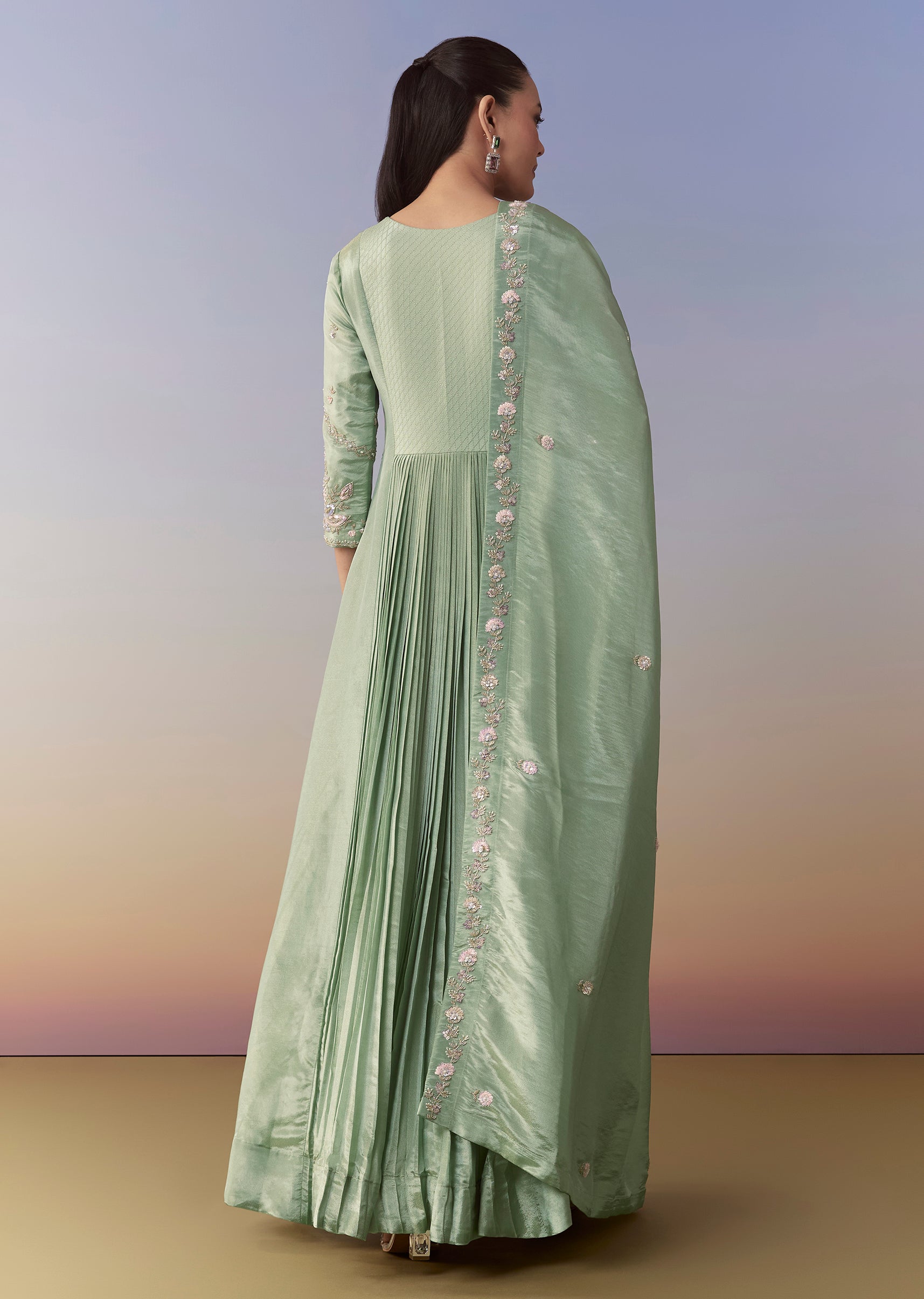 Step into understated elegance with this pista green anarkali set, adorned with sequins, cutdana, and bead work that adds a refined festive sparkle. The front pleating detail enhances the silhouette... More Product Details