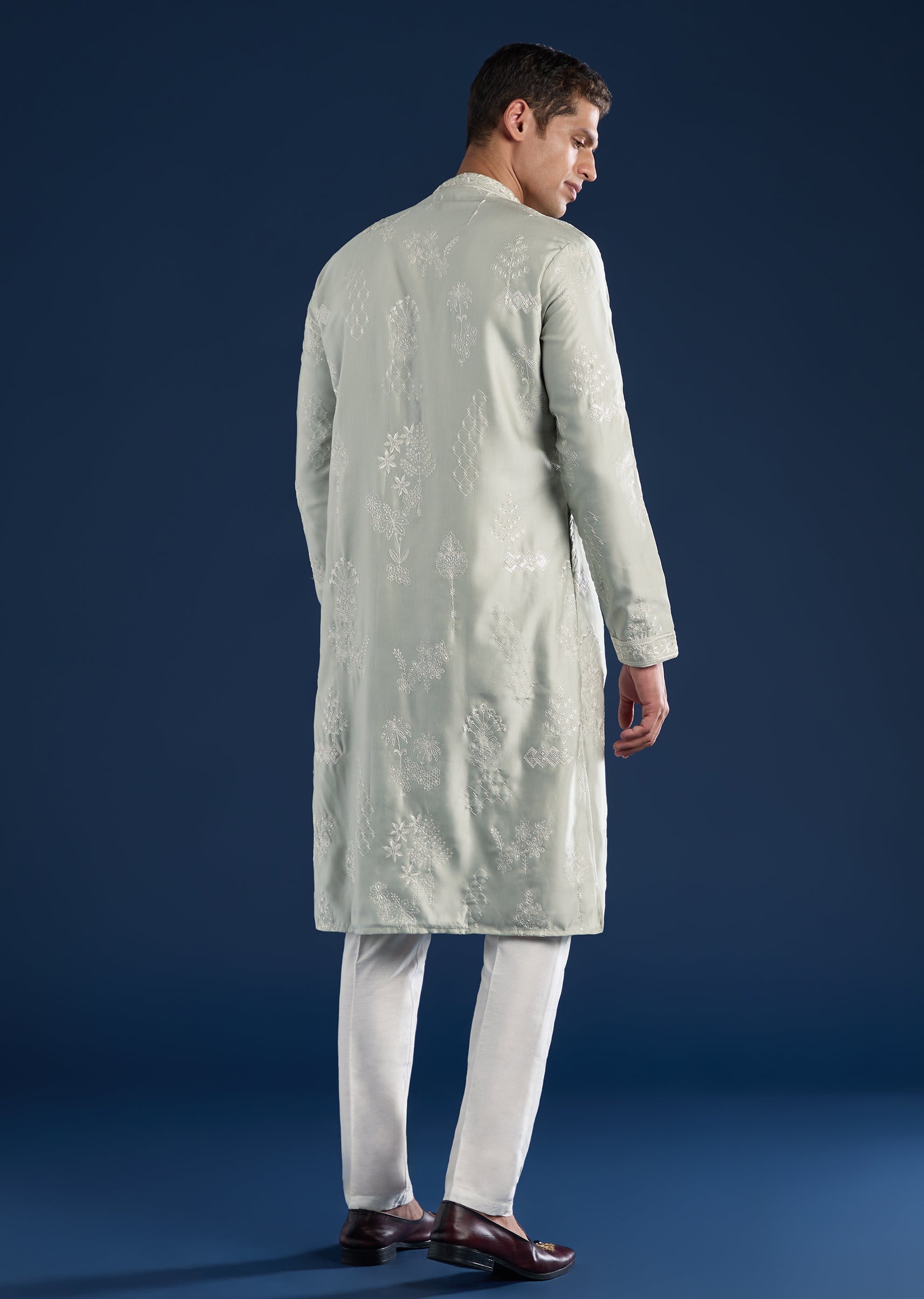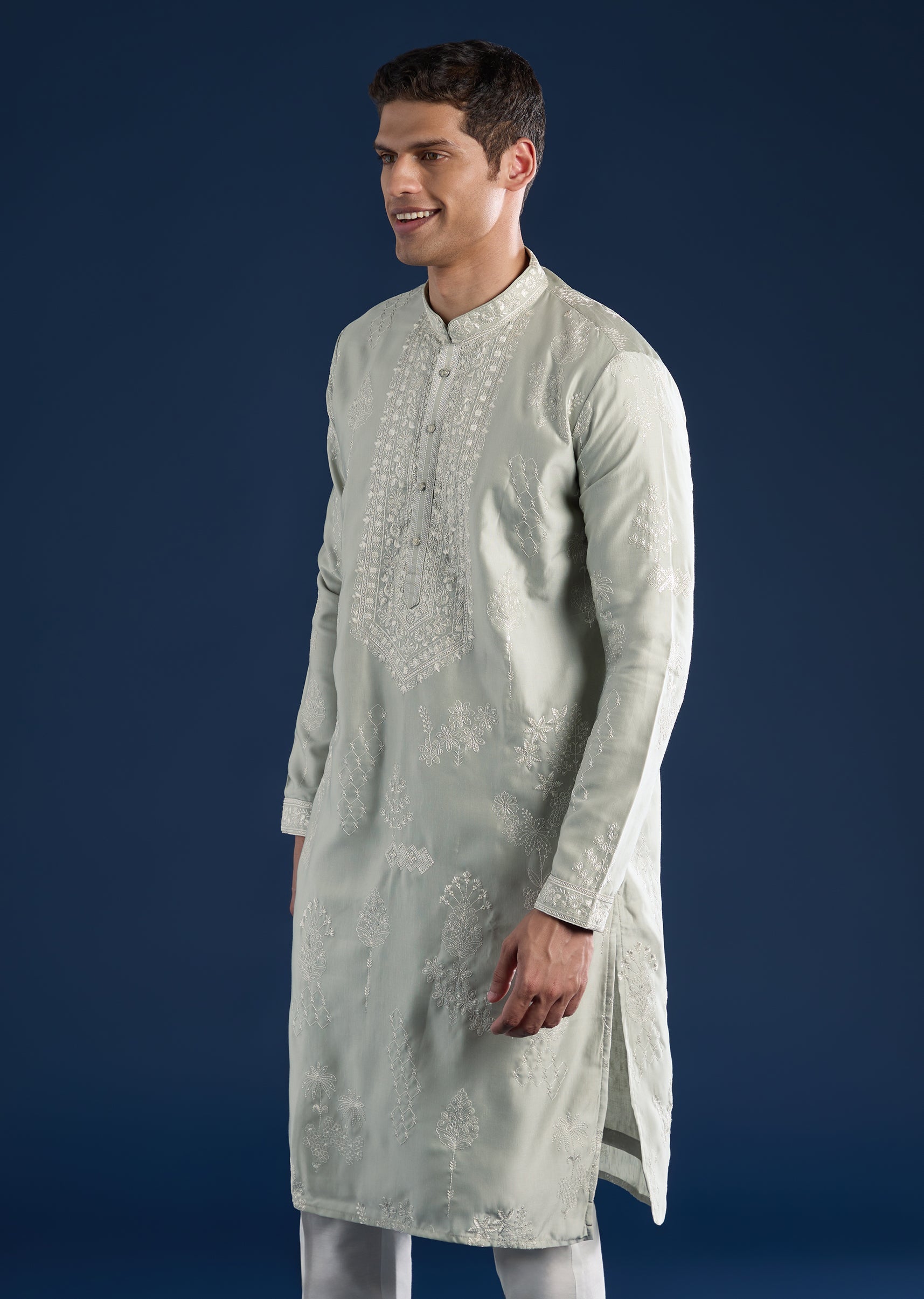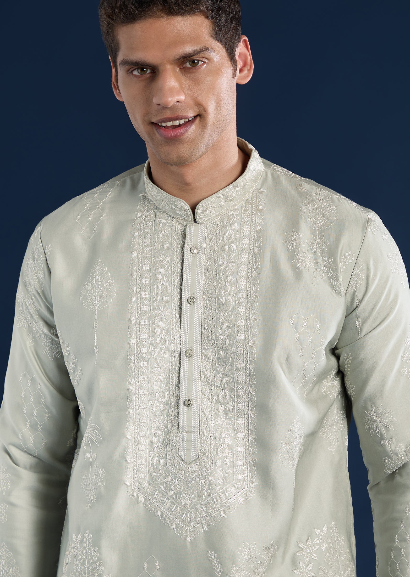 Crafted in art silk, this pista green kurta set brings understated elegance to festive and pooja settings. Featuring a mandarin collar, full sleeves, and side slits, it is finished with... More Product Details