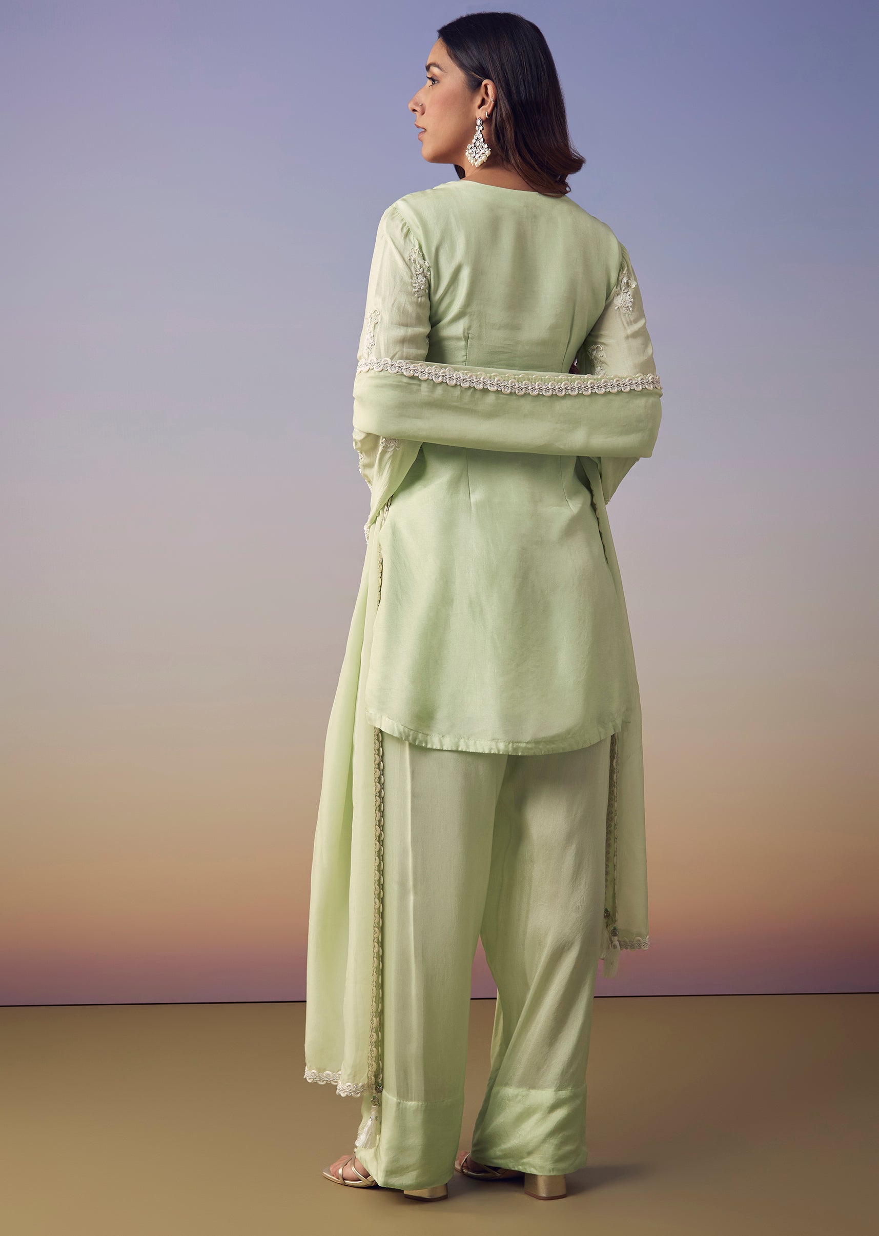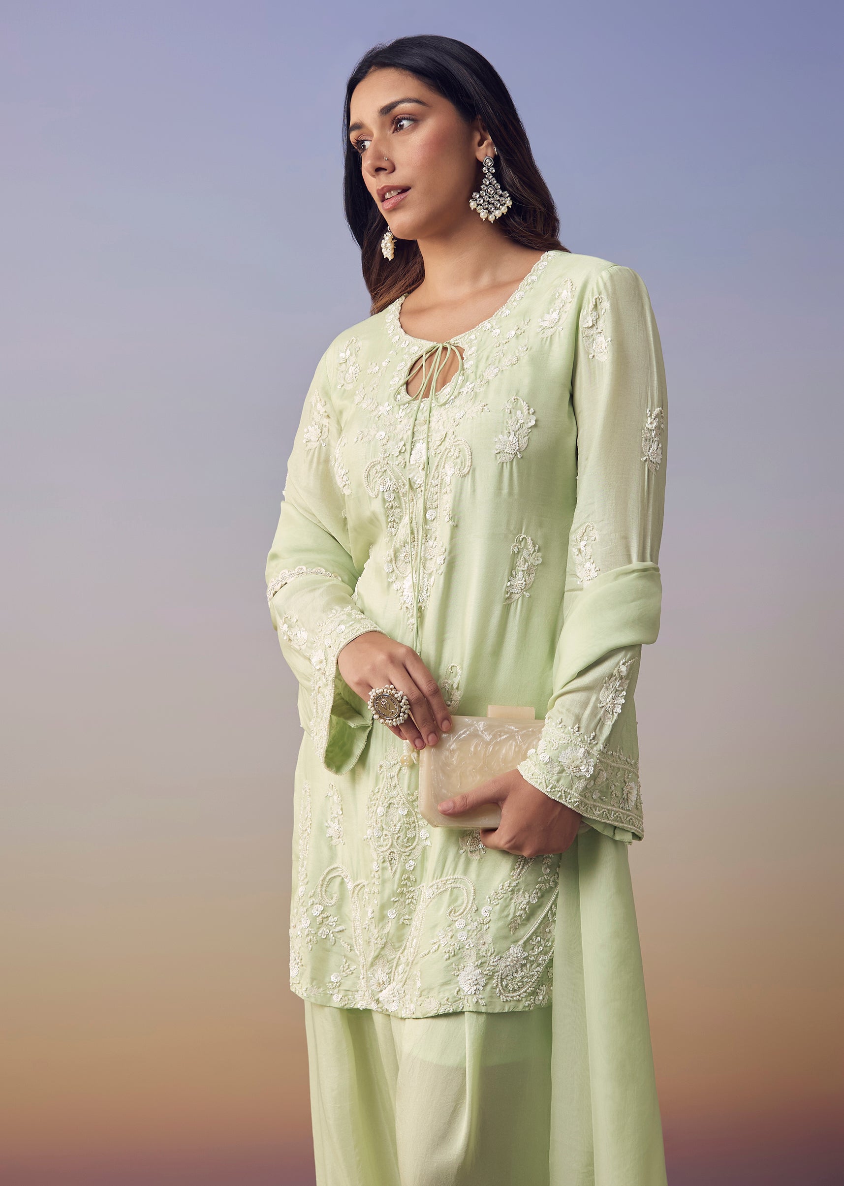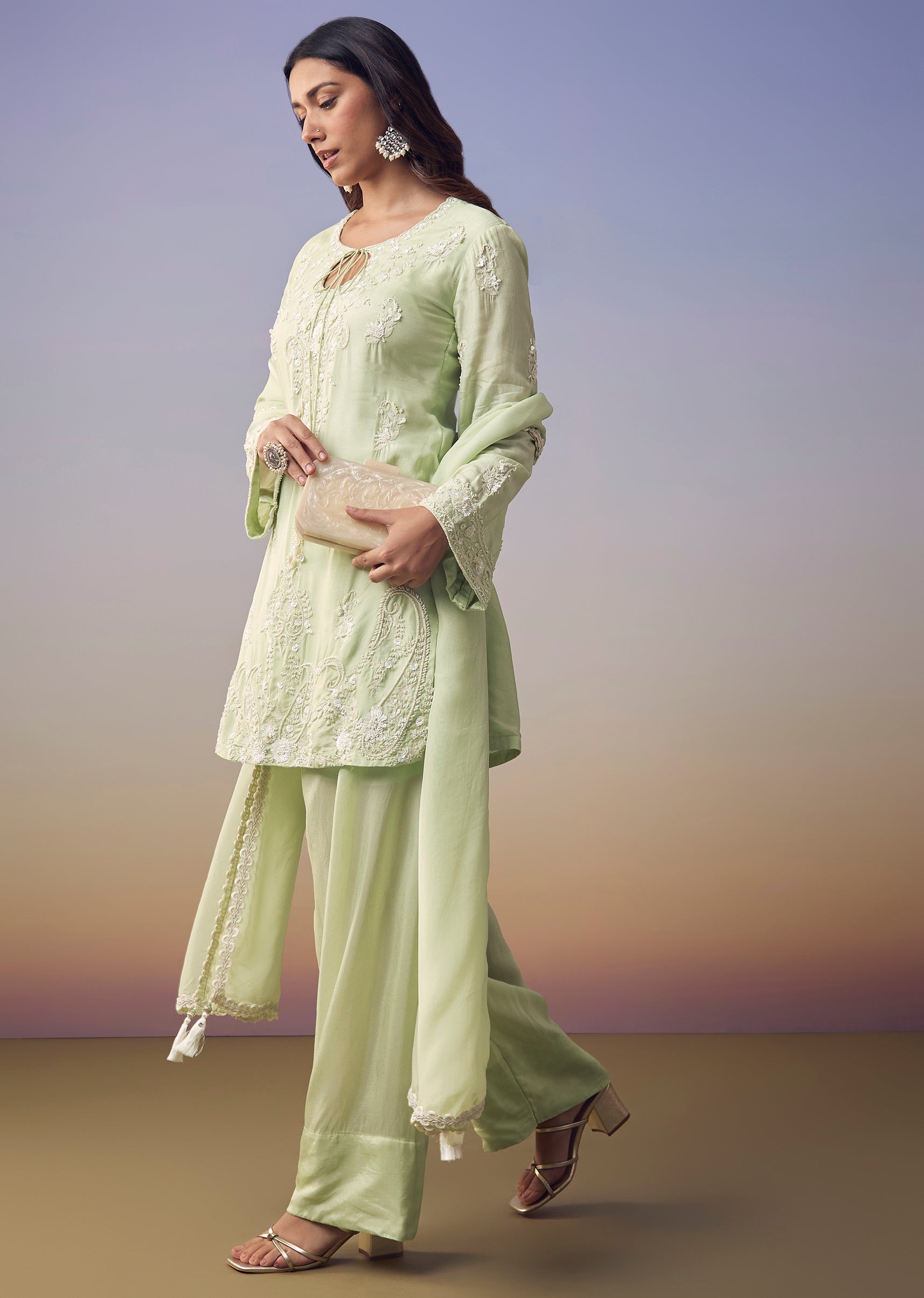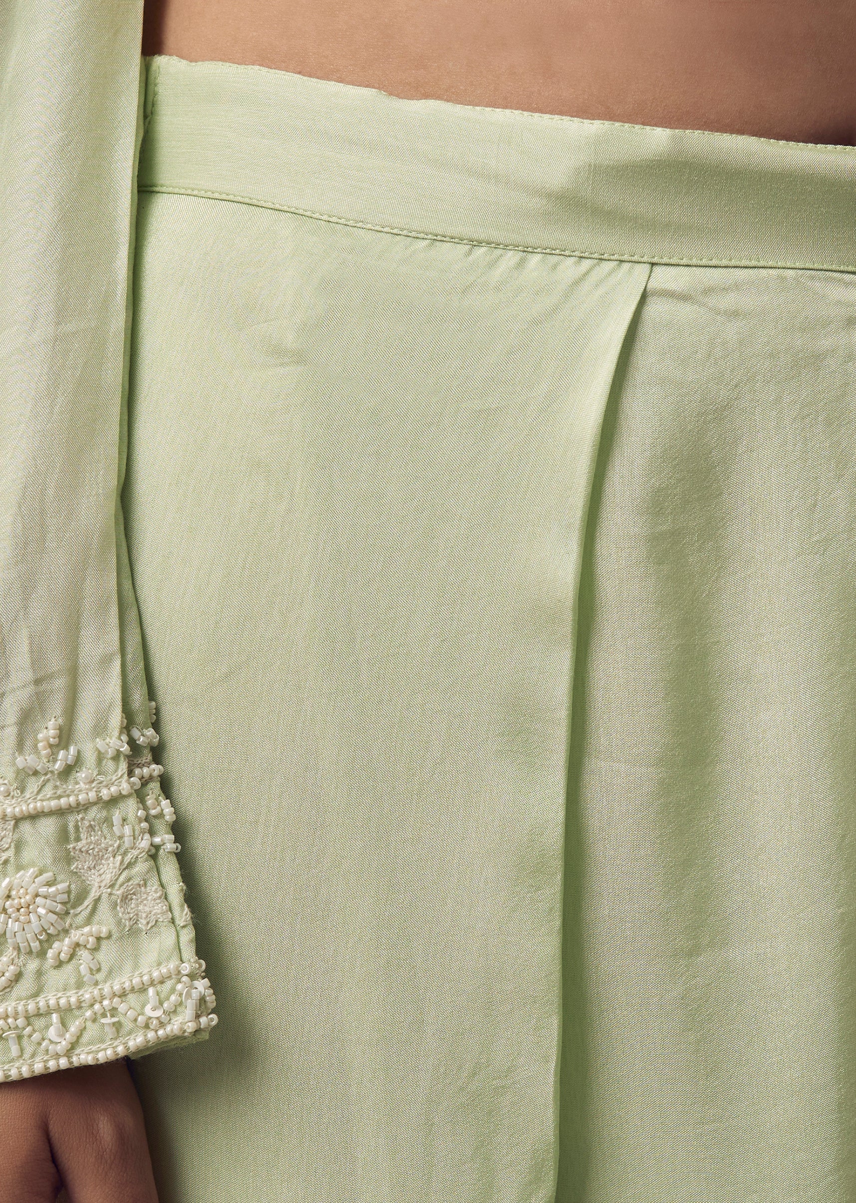 Bring soft elegance to your festive wardrobe with this pista green kurta set crafted in a viscose and silk blend, beautifully adorned with moti and sequin work along with delicate... More Product Details