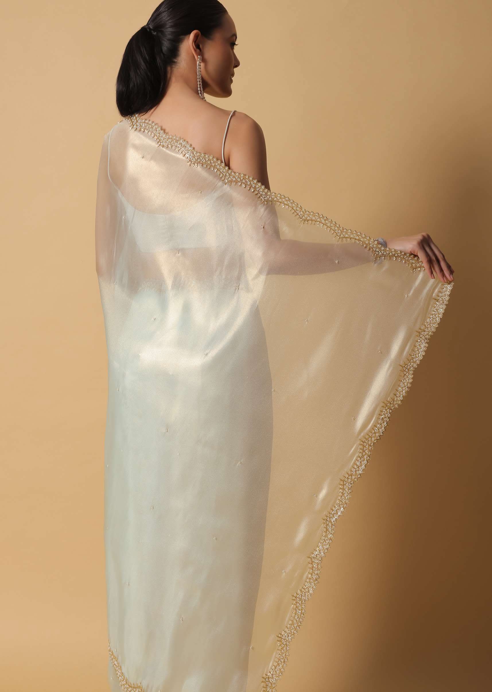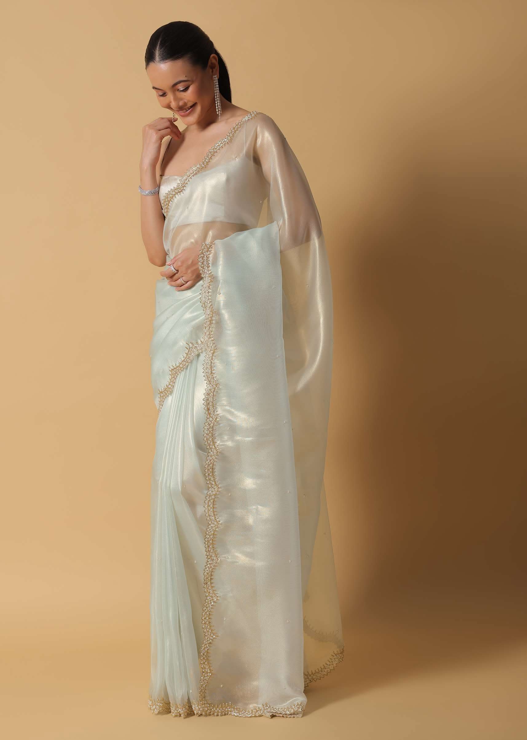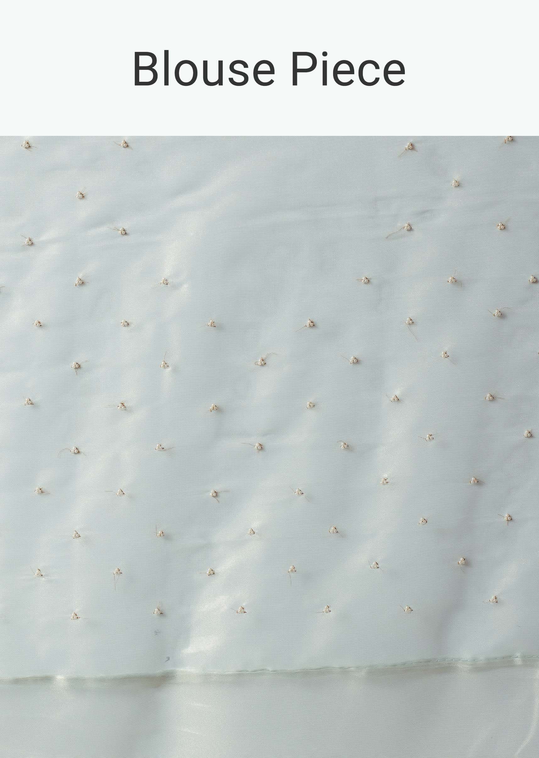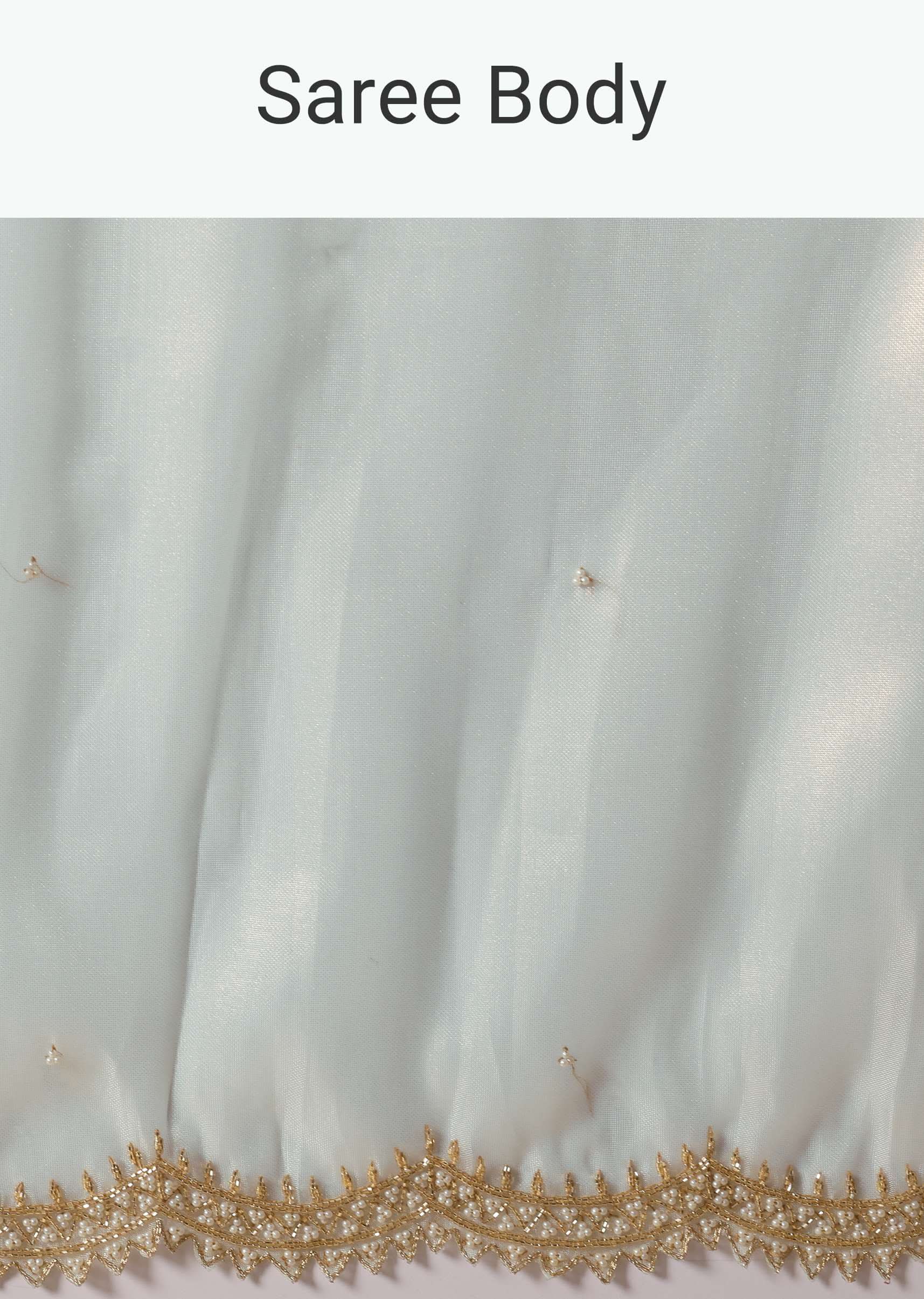 -   The intricate pearl and bead embroidery border work adds a touch of regal charm, enhancing the overall allure of the saree.