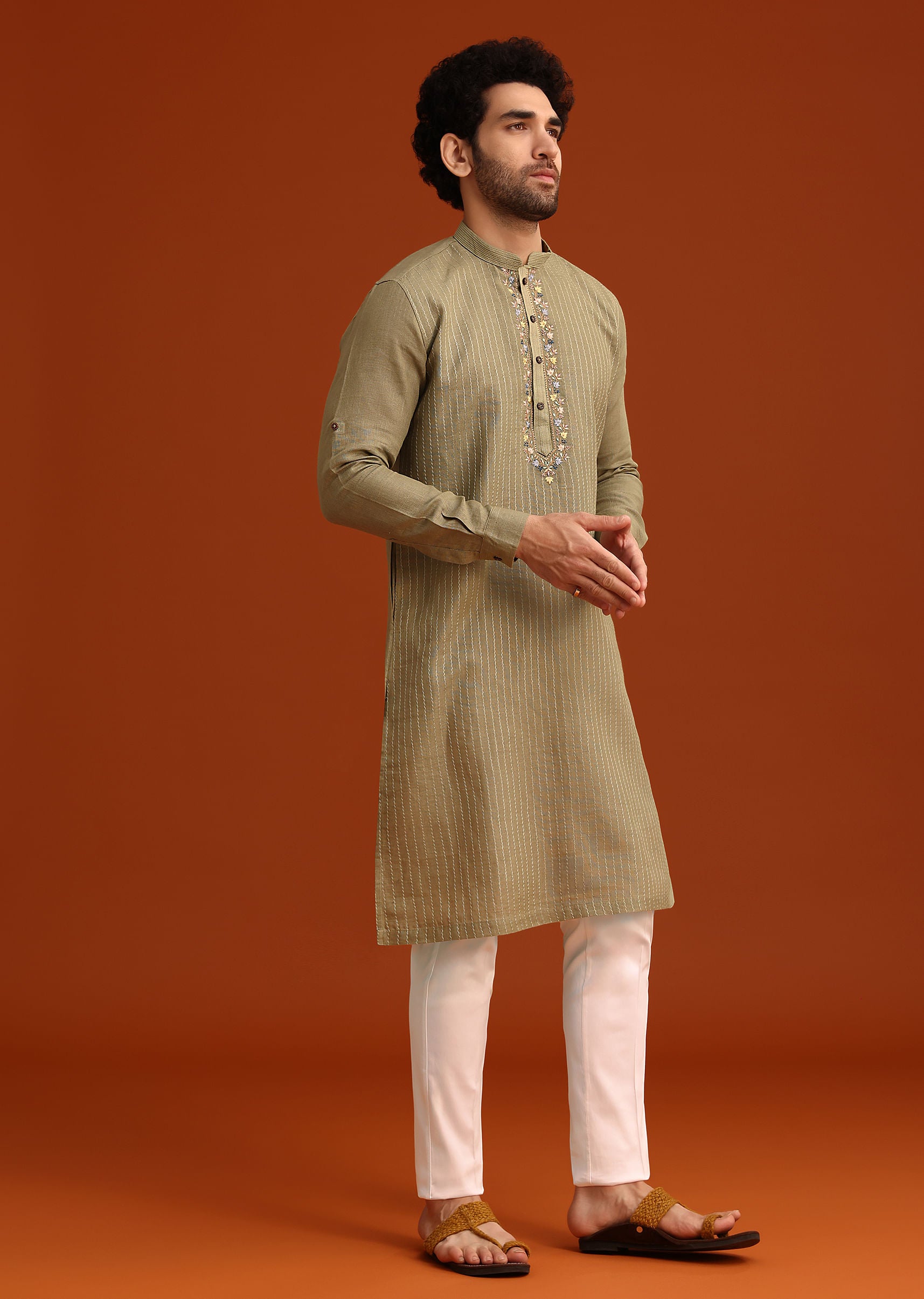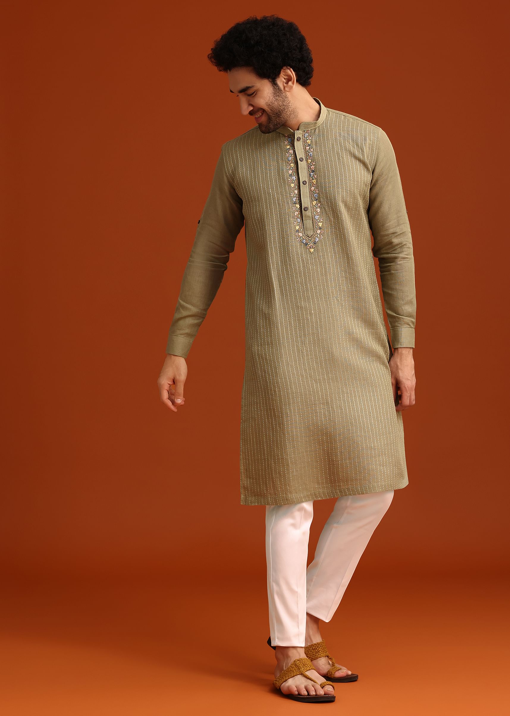 - Keep it chic and stylish this celebratory season by stepping out in this pista green kurta set.