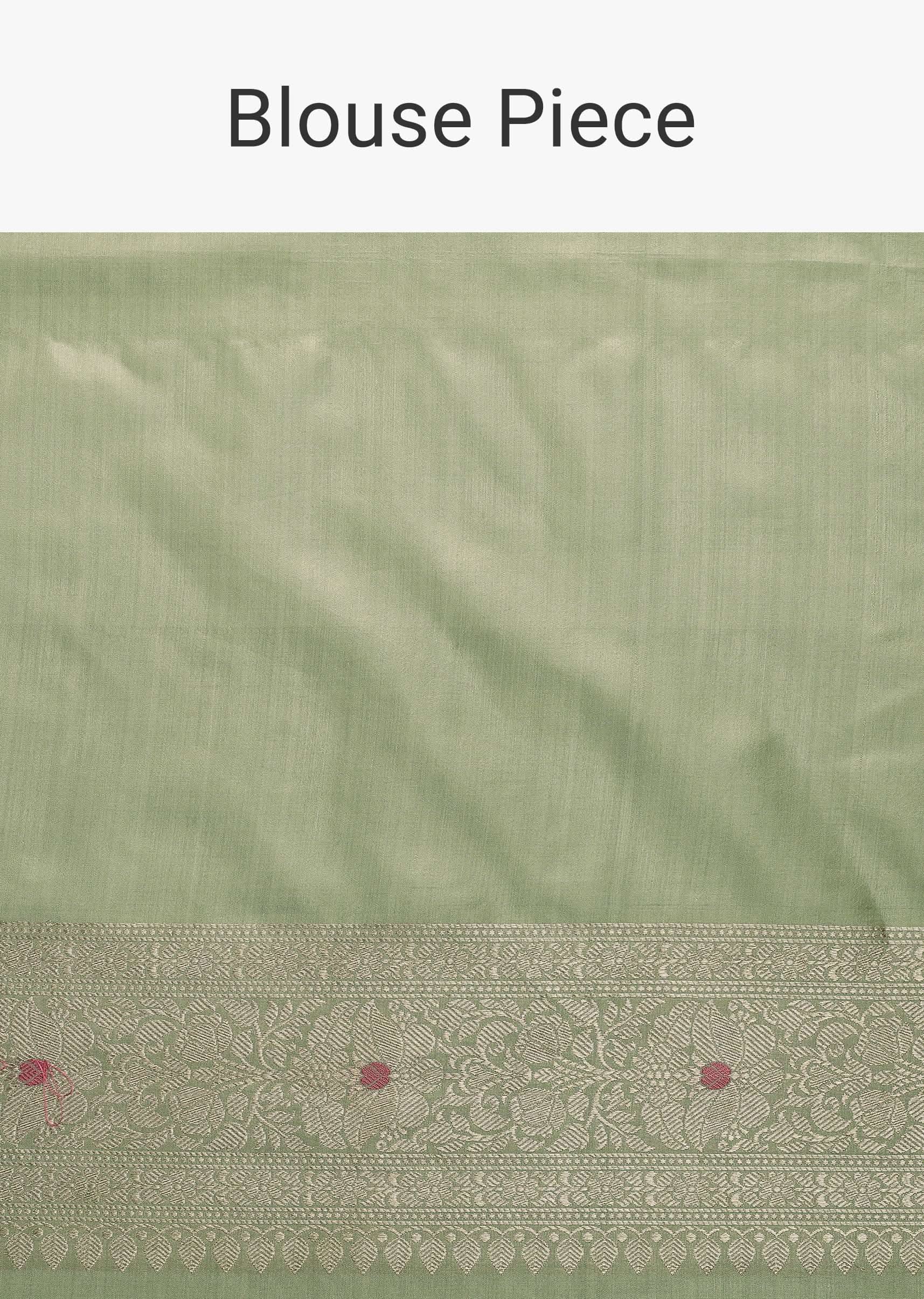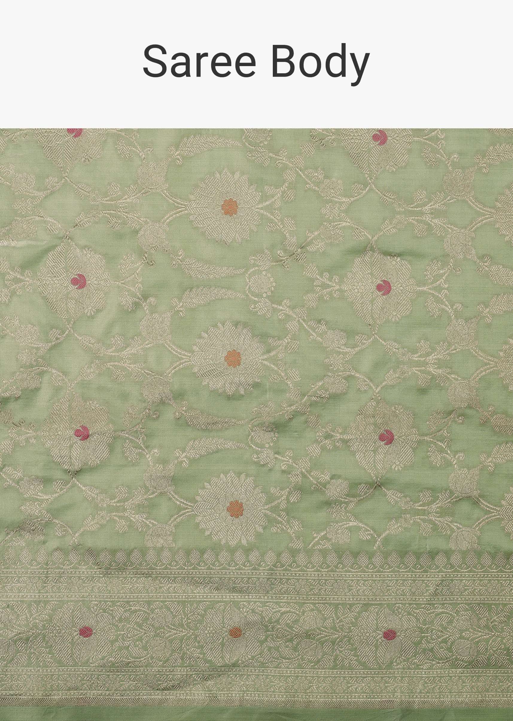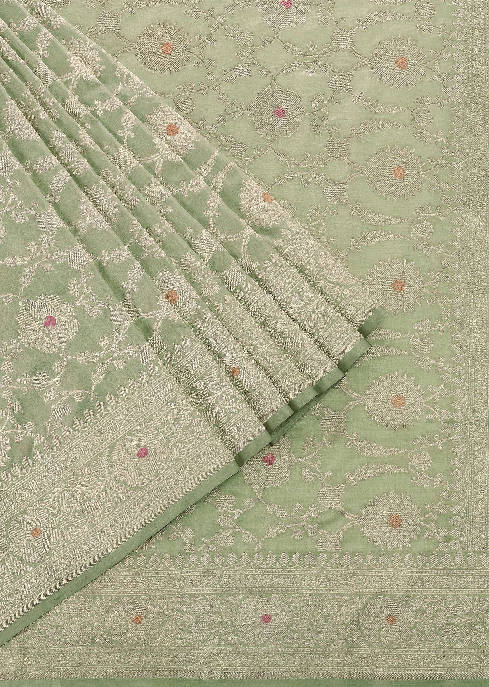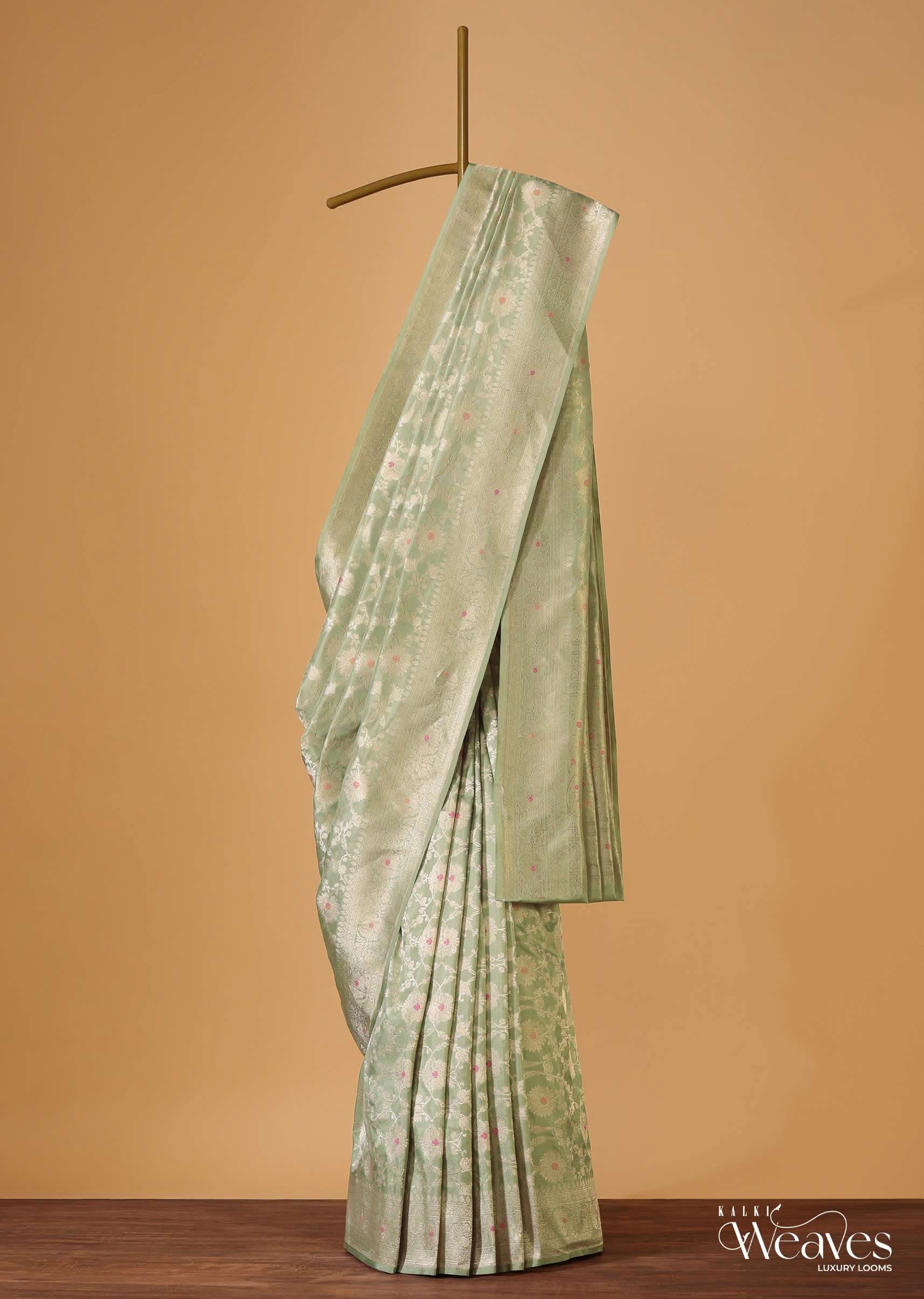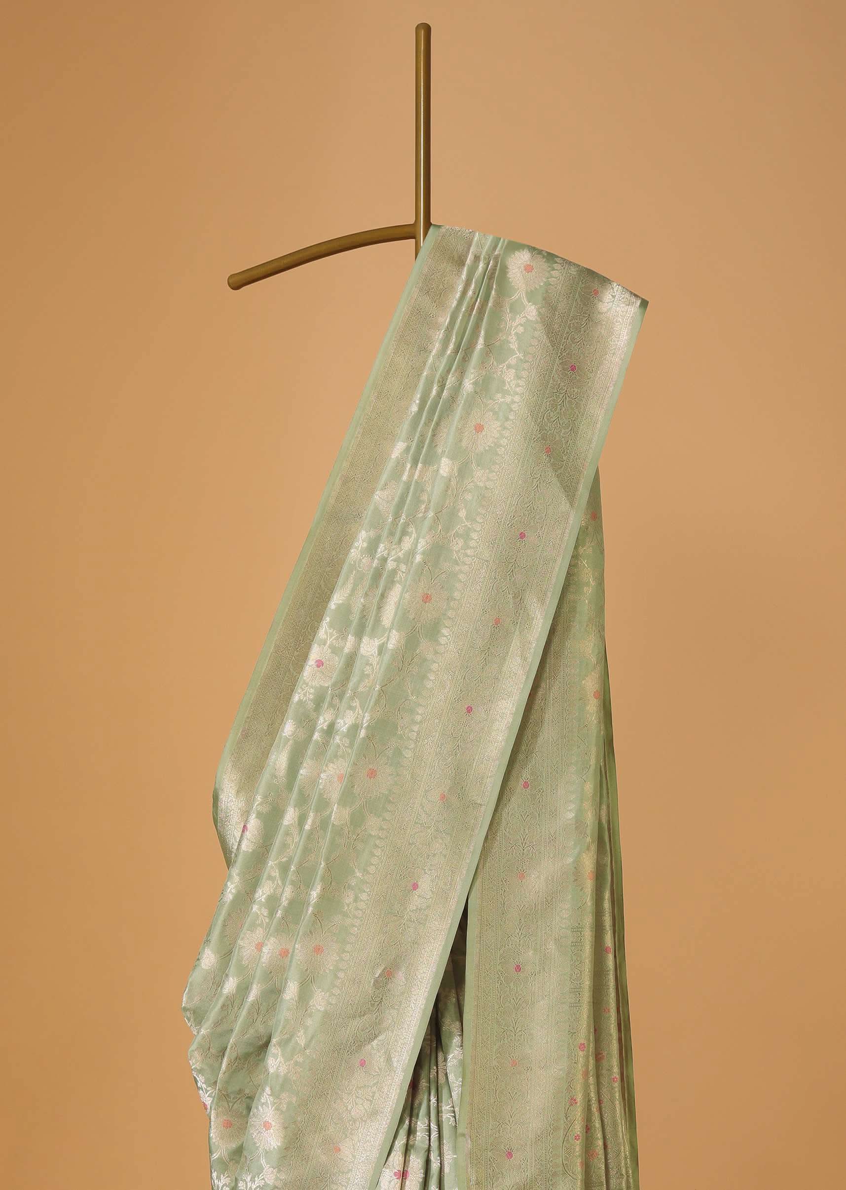 Pista Green Handloom Banarasi Saree In Katan Silk With Meenakari Weave And Unstitched Blouse