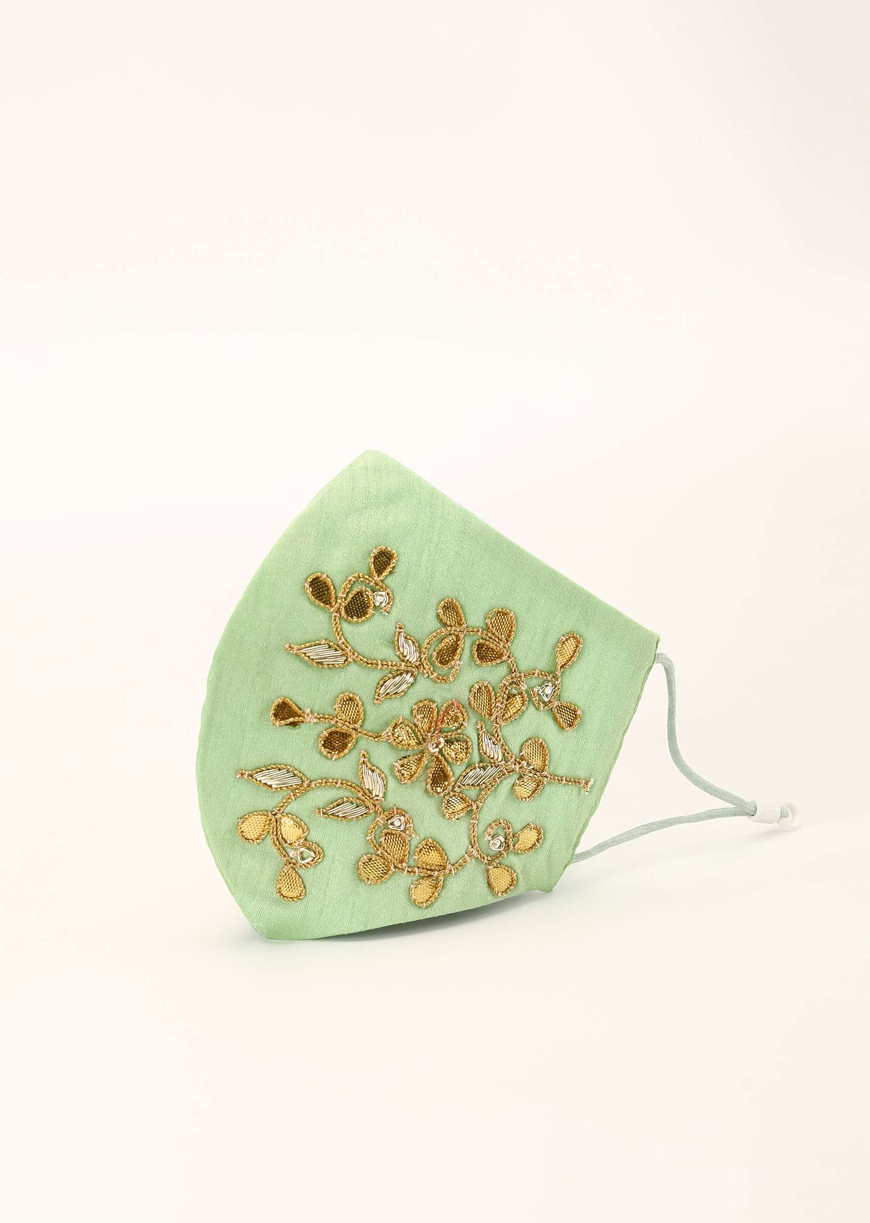 Pista Green Mask In Raw Silk With Gotta Patti And Zardosi Embroidered Floral Design