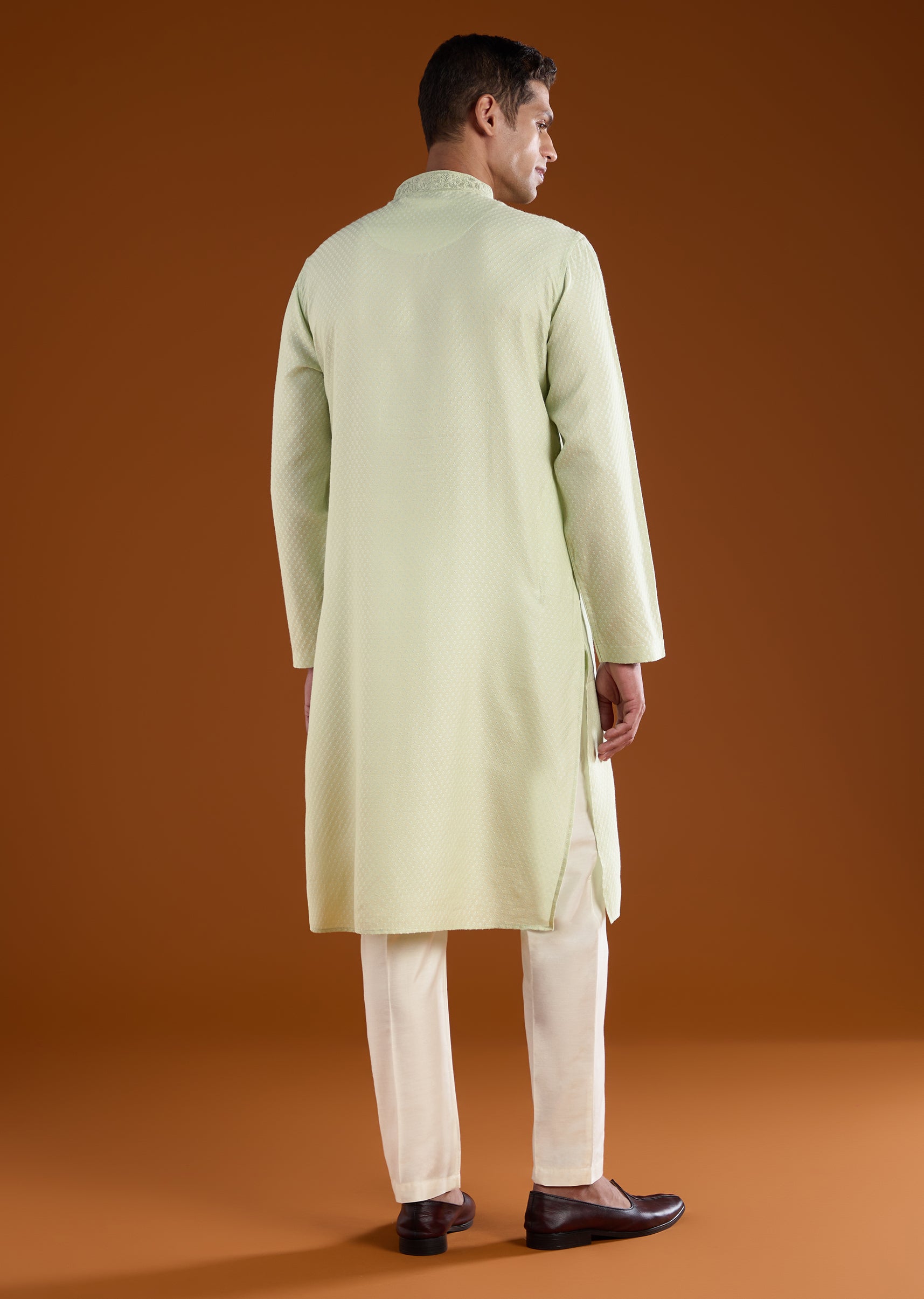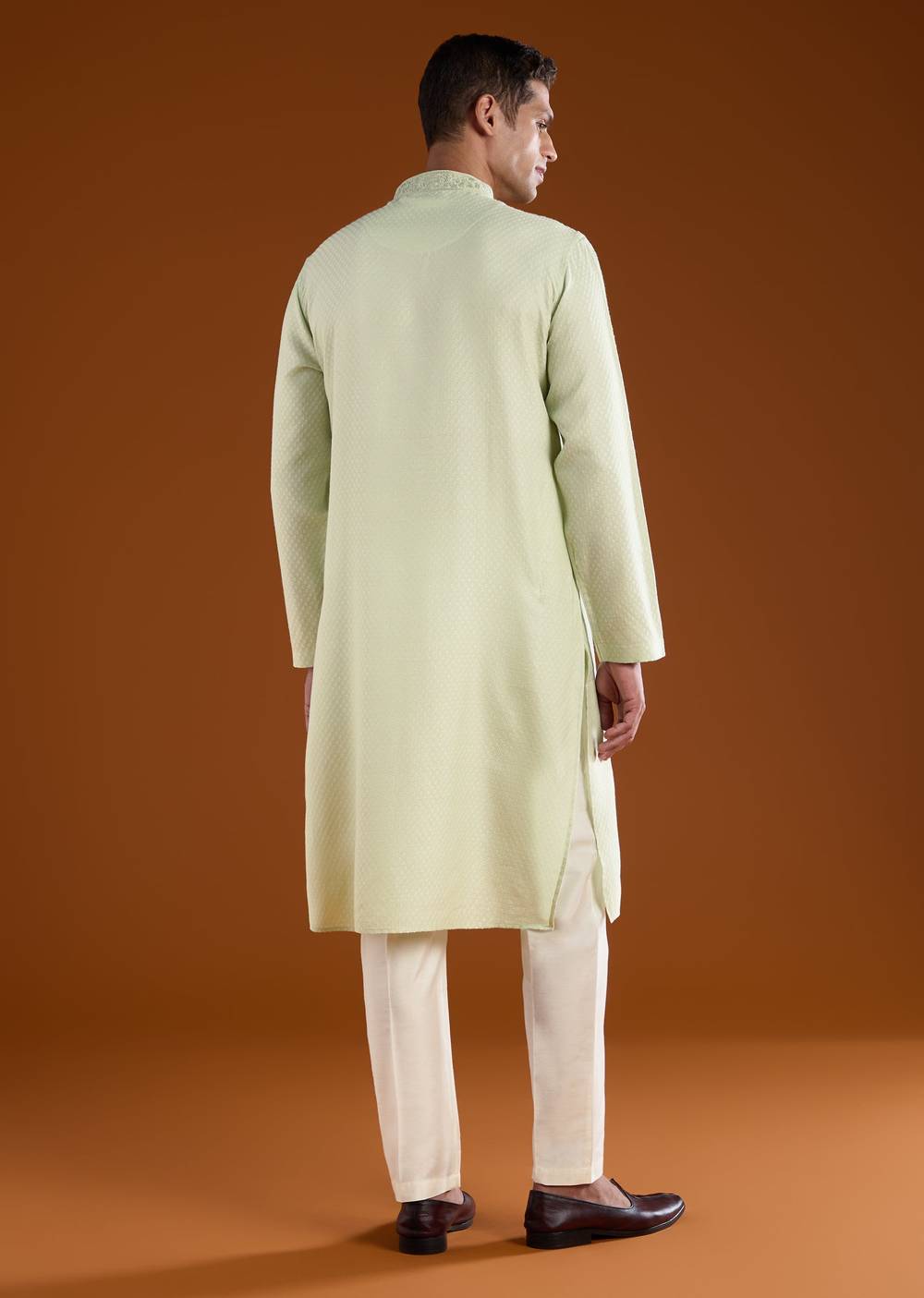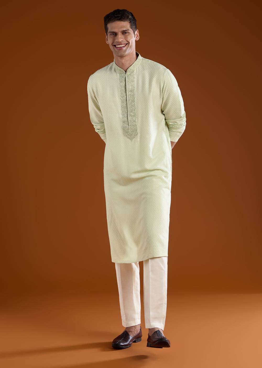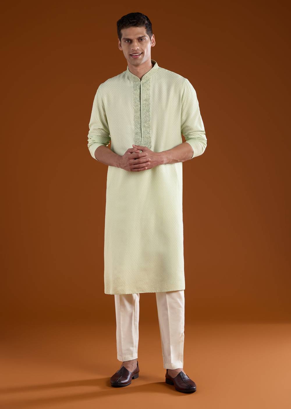 This pista green kurta set offers a fresh and elegant look, crafted in silk and art silk with refined resham thread work that adds subtle texture and charm. The full sleeve kurta features a classic mandarin collar along with front buttons and a front hook eye closure for a polished traditional finish. Paired with coordinated pants, the ensemble creates a graceful and sophisticated appearance ideal for weddings, festive gatherings, and cultural occasions. Awarded as the Most Trusted Brand, we're delivering styles you love, just as promised.