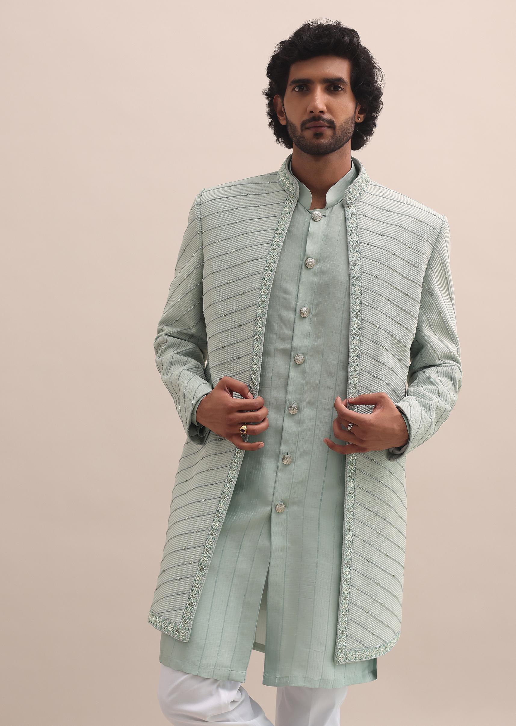 - Presenting the pista green embroidered indowestern.
