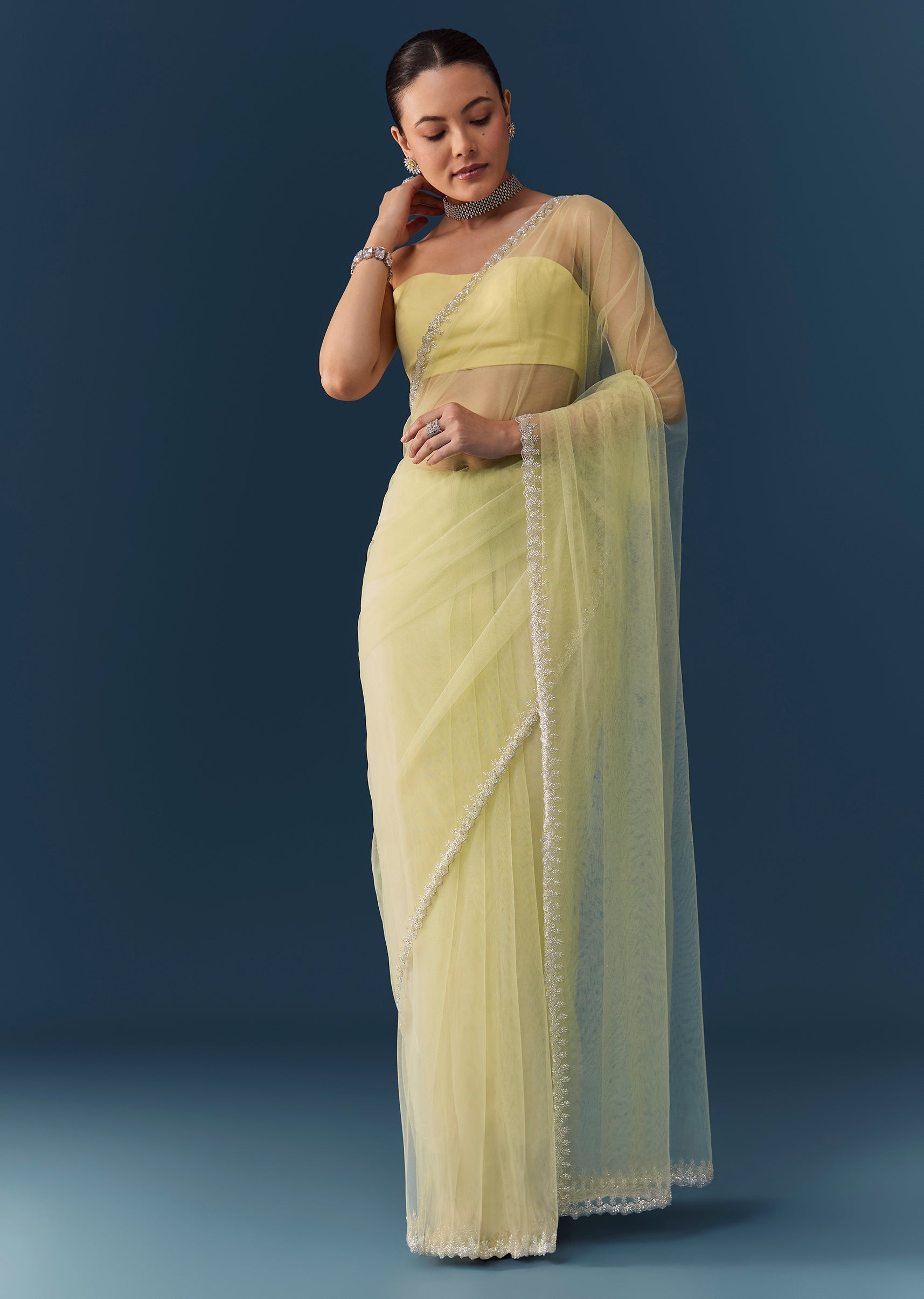 Exude subtle sophistication with this pista green net saree, featuring a delicately designed zigzag cutwork border embroidered with shimmering cutdana and sequins. The soft net fabric adds an airy, graceful drape, while the matching floral embroidered blouse fabric enhances its elegant appeal. Perfect for receptions, festive celebrations, or formal gatherings, this saree beautifully blends contemporary charm with timeless elegance. Awarded as the Most Trusted Brand, we're delivering styles you love, just as promised.