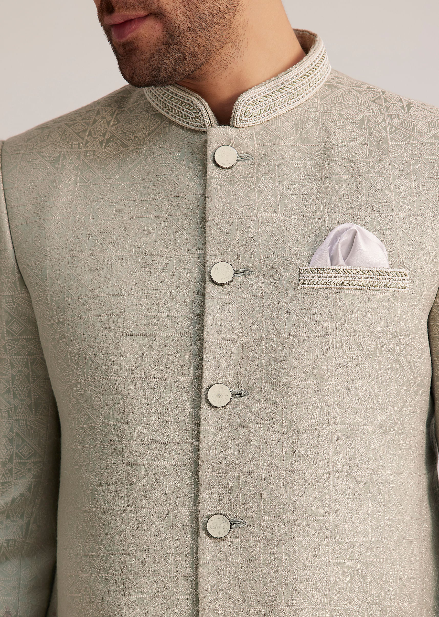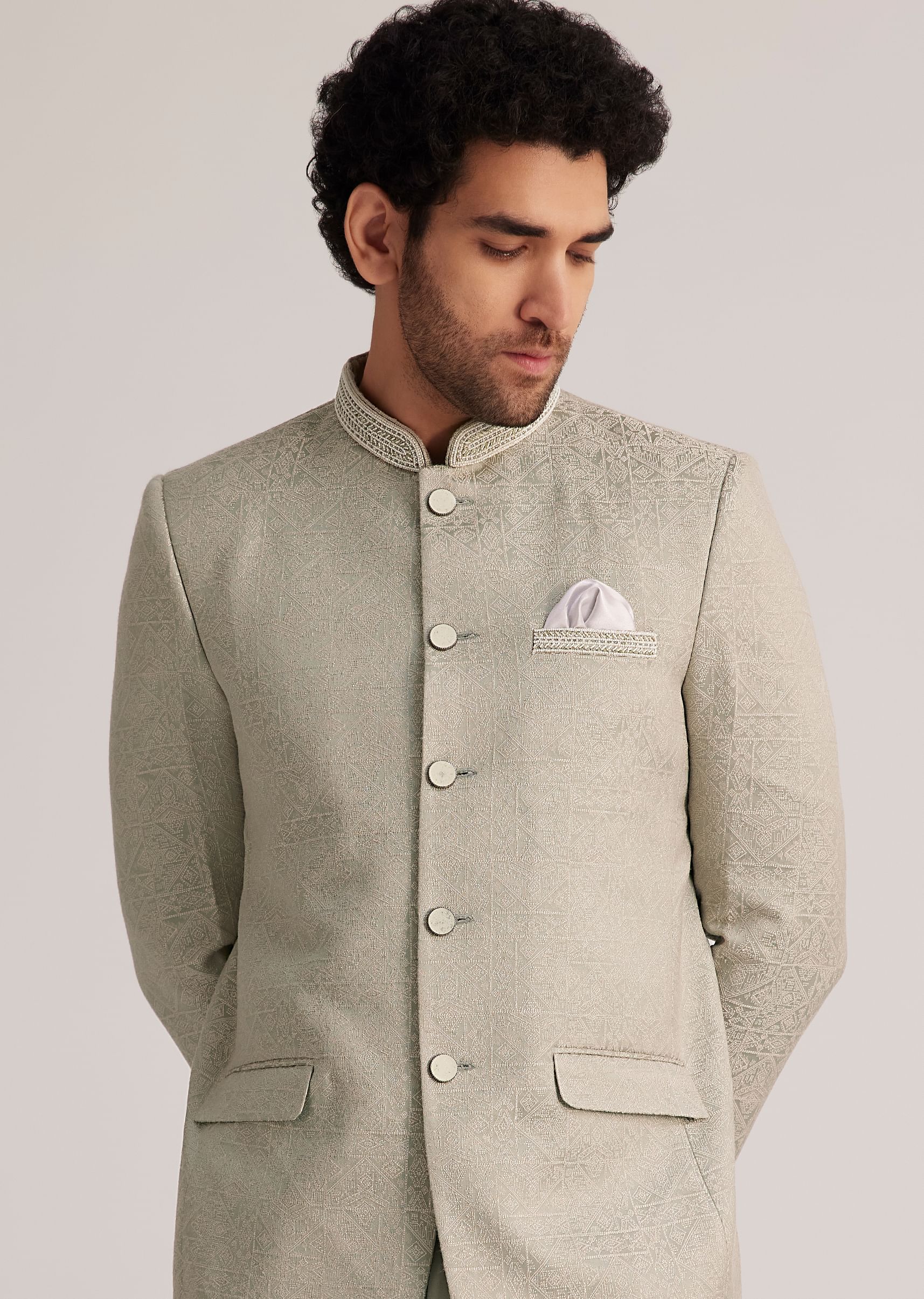 Exude effortless charm with this pista green bandhgala suit, featuring a subtle textured pattern for a refined and modern look. Perfect for weddings, receptions, or formal gatherings, this suit combines... More Product Details