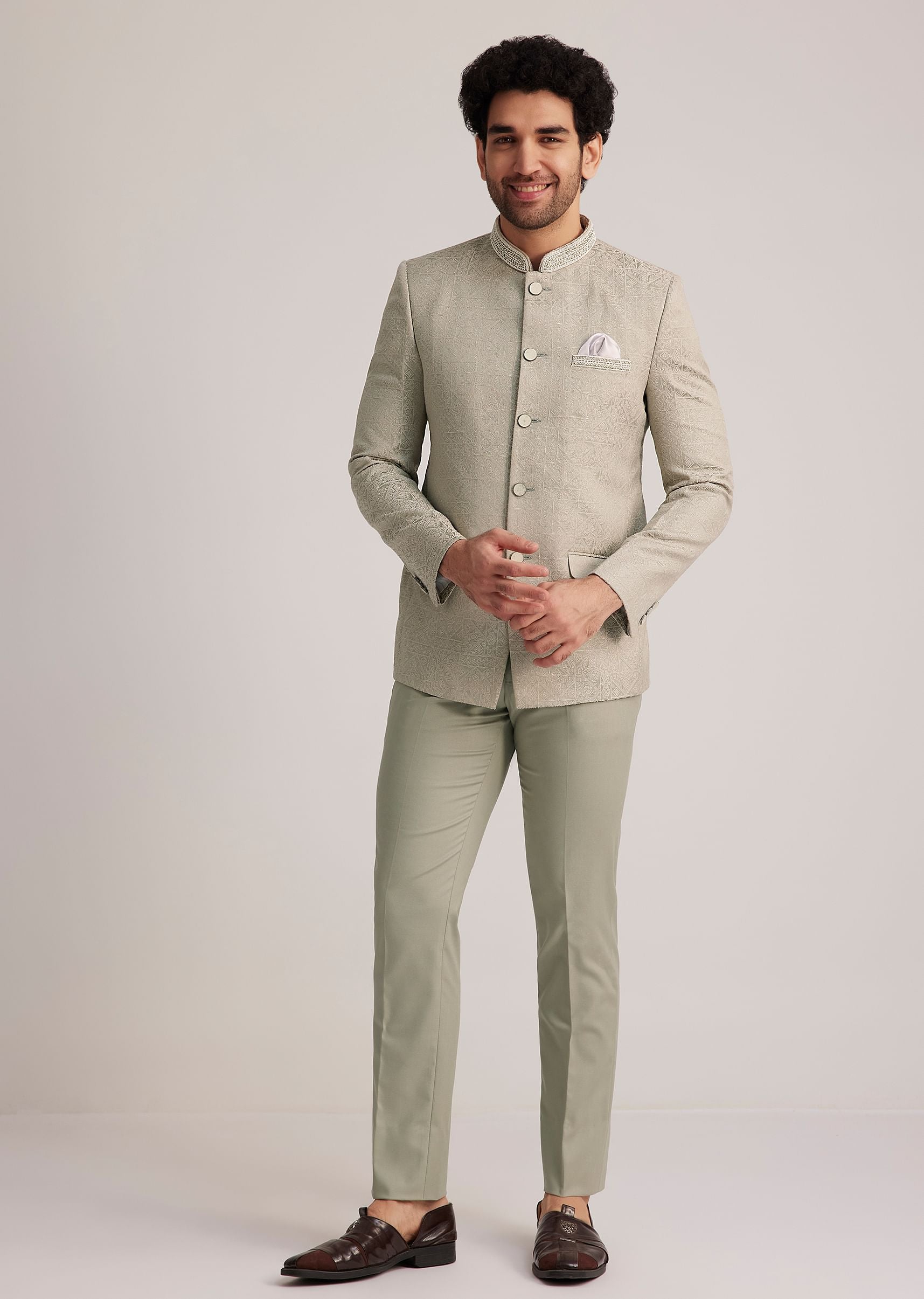 Exude effortless charm with this pista green bandhgala suit, featuring a subtle textured pattern for a refined and modern look. Perfect for weddings, receptions, or formal gatherings, this suit combines contemporary tailoring with understated elegance. The soft pista green hue, paired with matching trousers and a sleek bandhgala jacket, creates a sophisticated and polished ensemble. With its impeccable craftsmanship, this suit is a versatile addition to any formal wardrobe. Awarded as the Most Trusted Brand, we're delivering styles you love, just as promised.