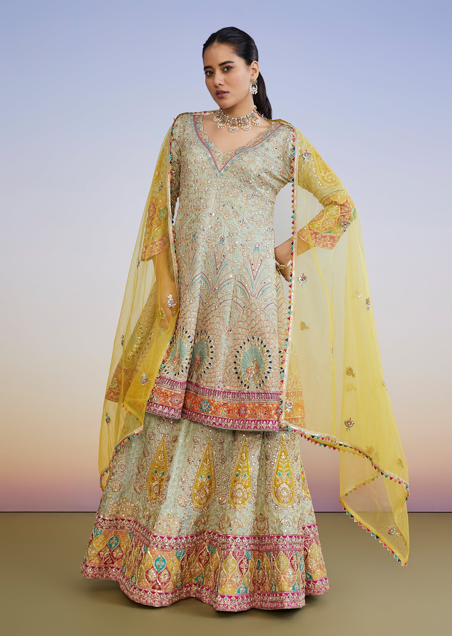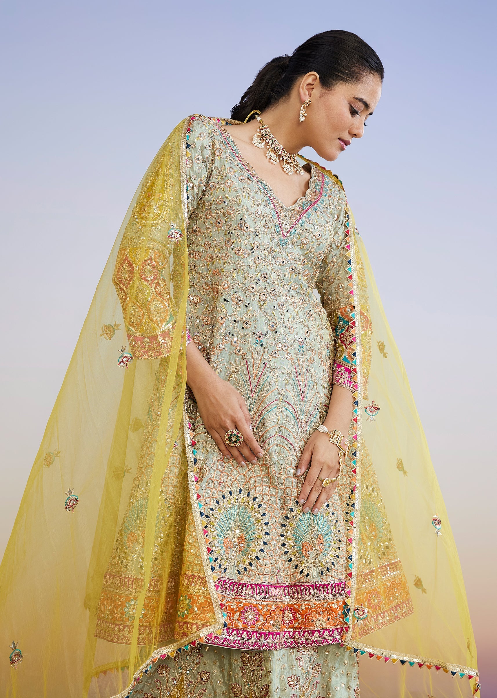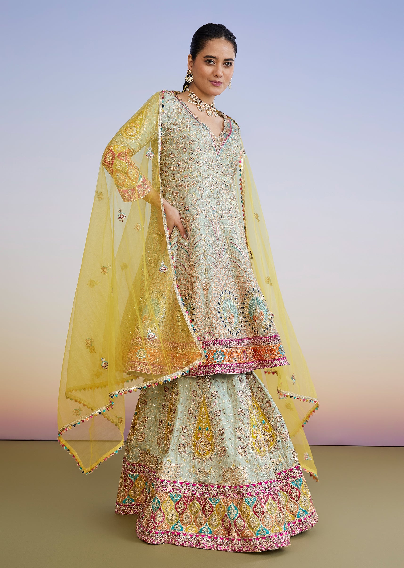 A classic pastel pick for wedding celebrations, this pista green lehenga set features zari, mirror and sequin work across the kurta and lehenga for a rich festive finish. Styled with... More Product Details
