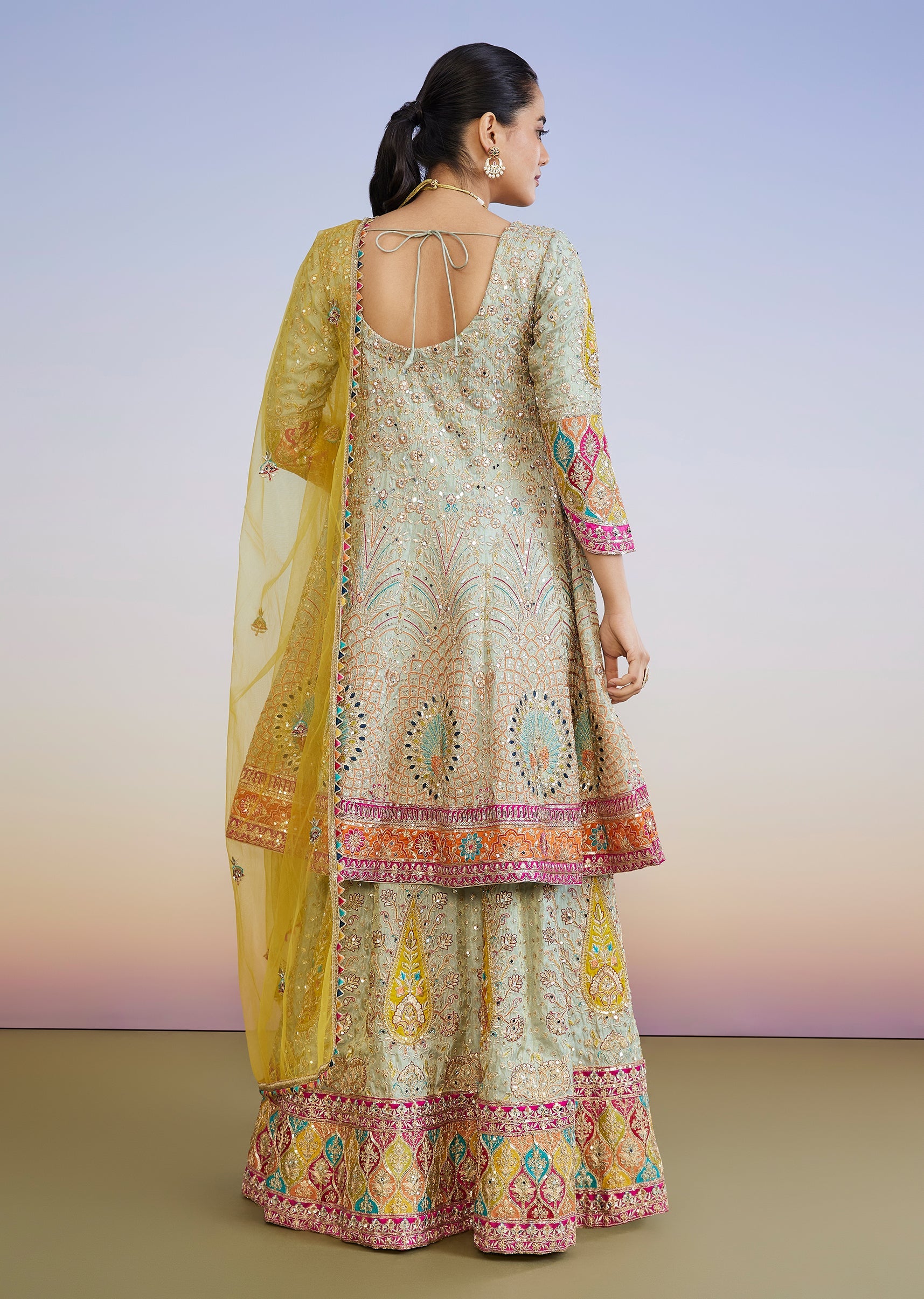 A classic pastel pick for wedding celebrations, this pista green lehenga set features zari, mirror and sequin work across the kurta and lehenga for a rich festive finish. Styled with a V-neckline and half sleeves, the circular silhouette and matching dupatta make it perfect for bridesmaids and mother-of-the-bride dressing. Awarded as the Most Trusted Brand, we're delivering styles you love, just as promised.