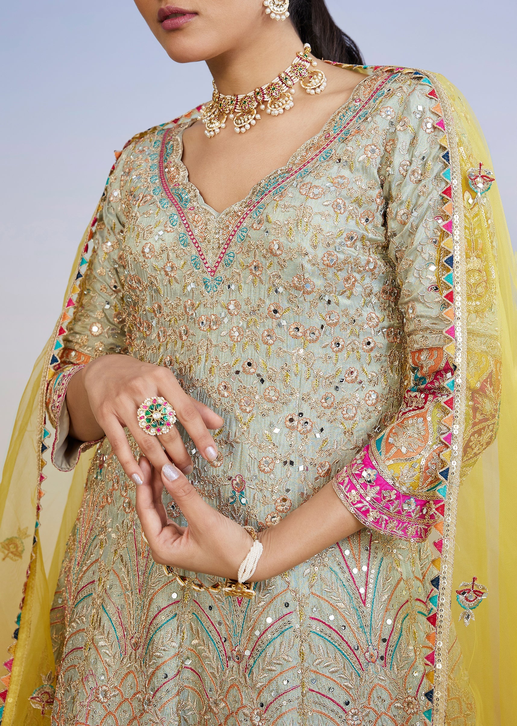 Pair with kundan jewellery and metallic heels—keep the dupatta drape neat for a polished look.