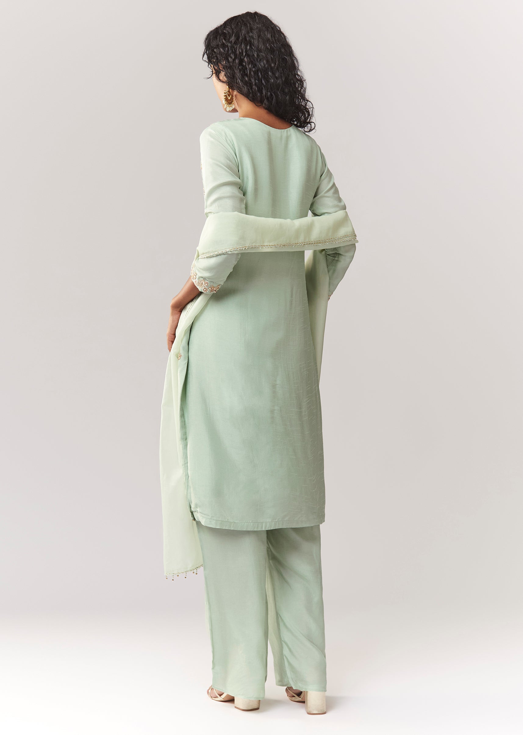 A pastel festive Pakistani-style 3-piece set in dola silk with zardosi and moti work. Straight V-neck kurta with 3/4 sleeves, paired with a mid-waist elasticated palazzo and a solid organza... More Product Details