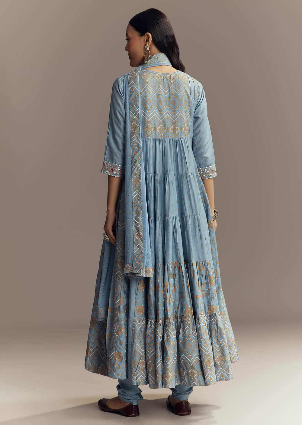 Powder Blue Chanderi Printed Anarkali Suit With Resham Work