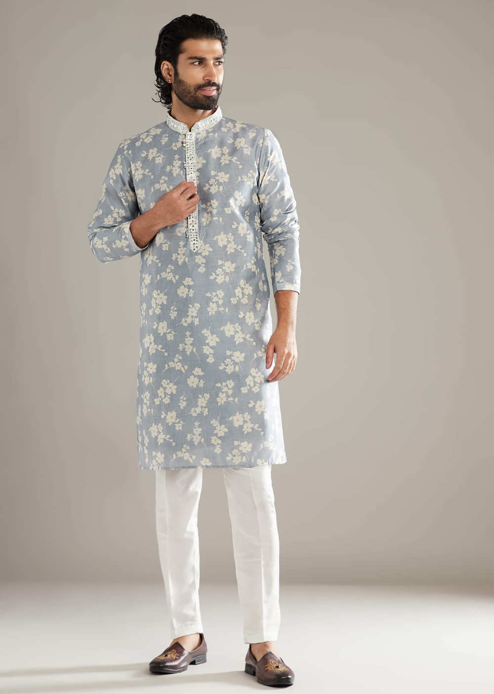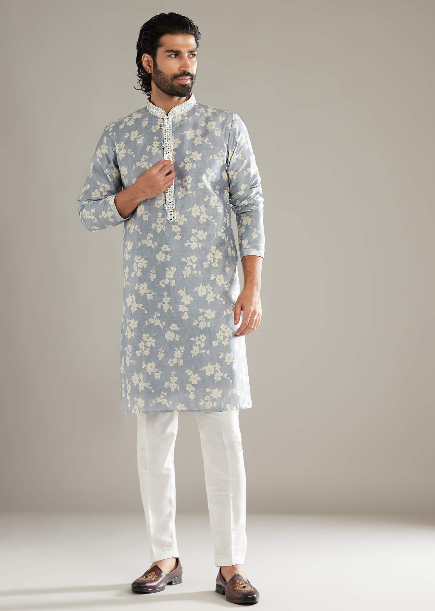 Powder Blue Kurta Set For Men With Floral Print And Mirror Work