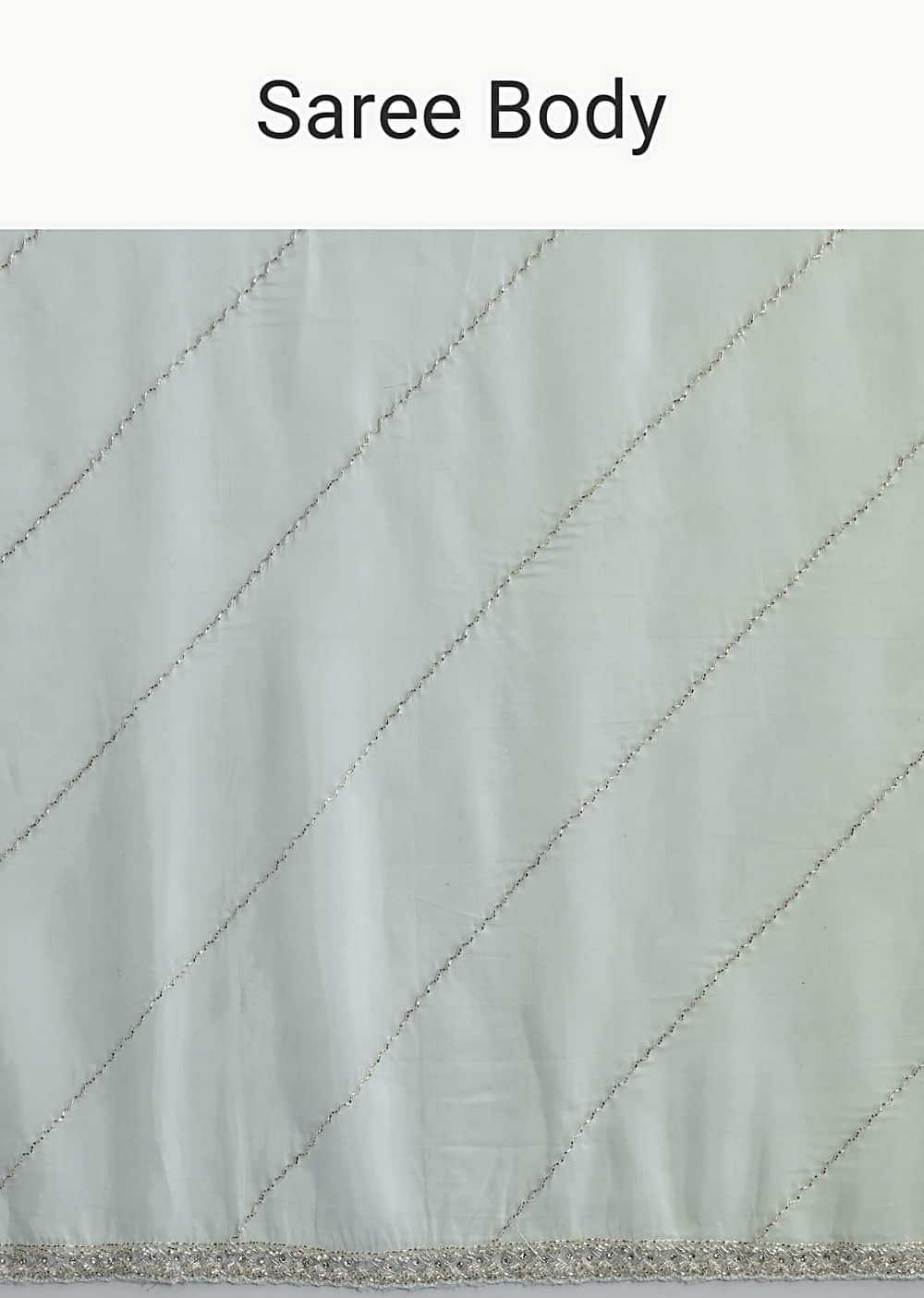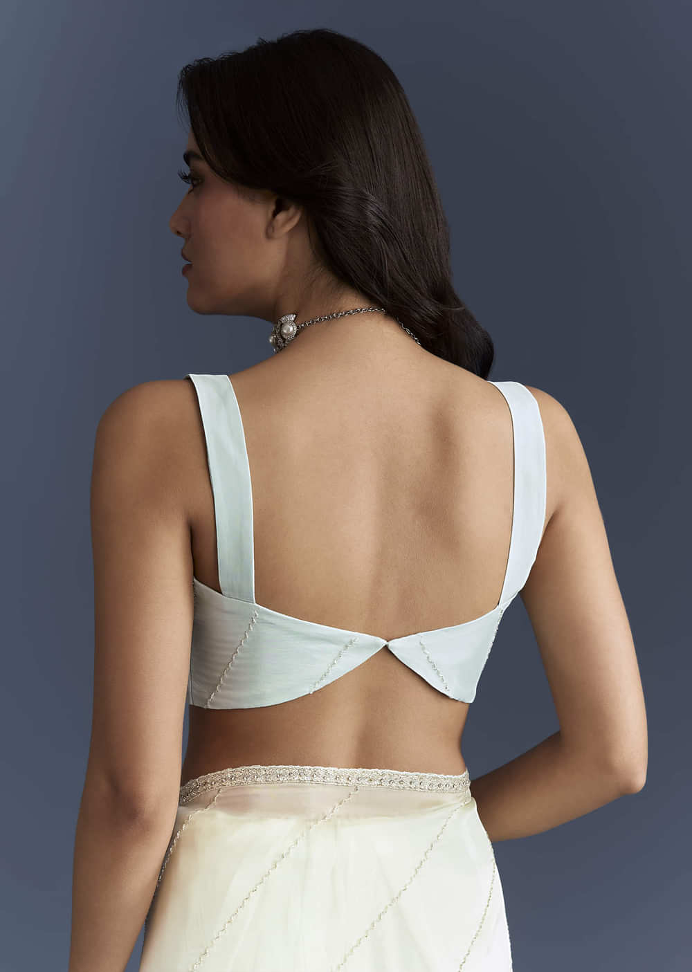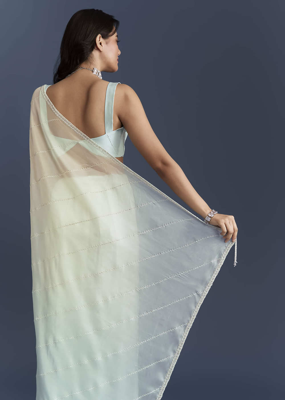 Soft and floaty on the skin, this powder blue organza saree shows delicate cross stripes embroidered in cutdana so the sparkle stays fine. Sequins join the work to catch movement... More Product Details