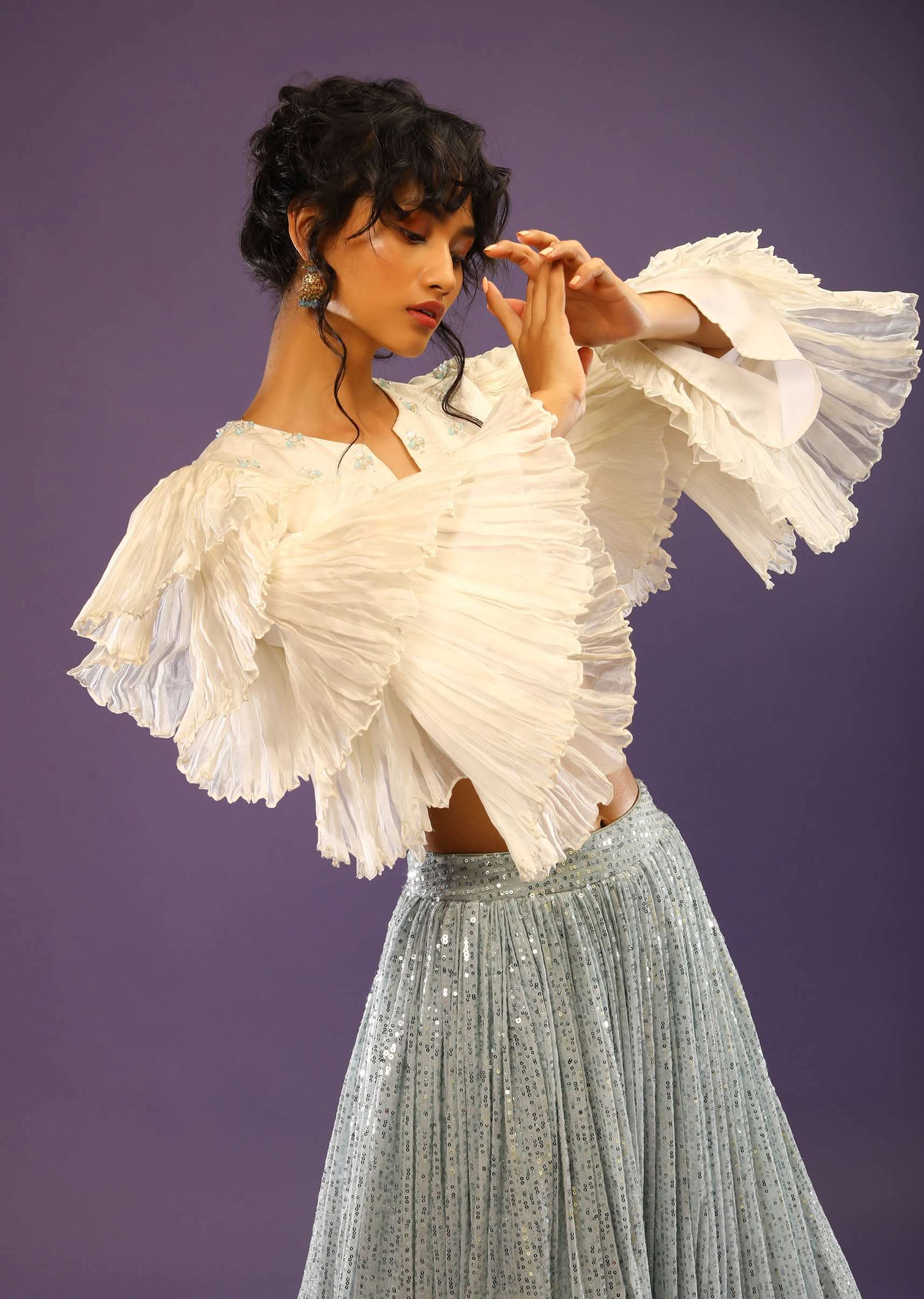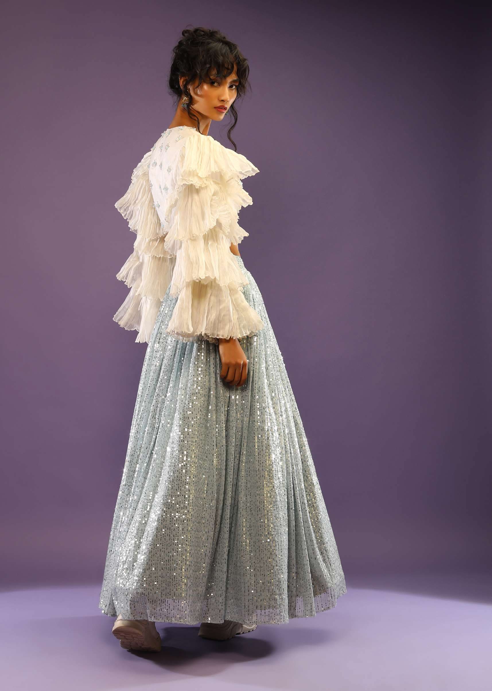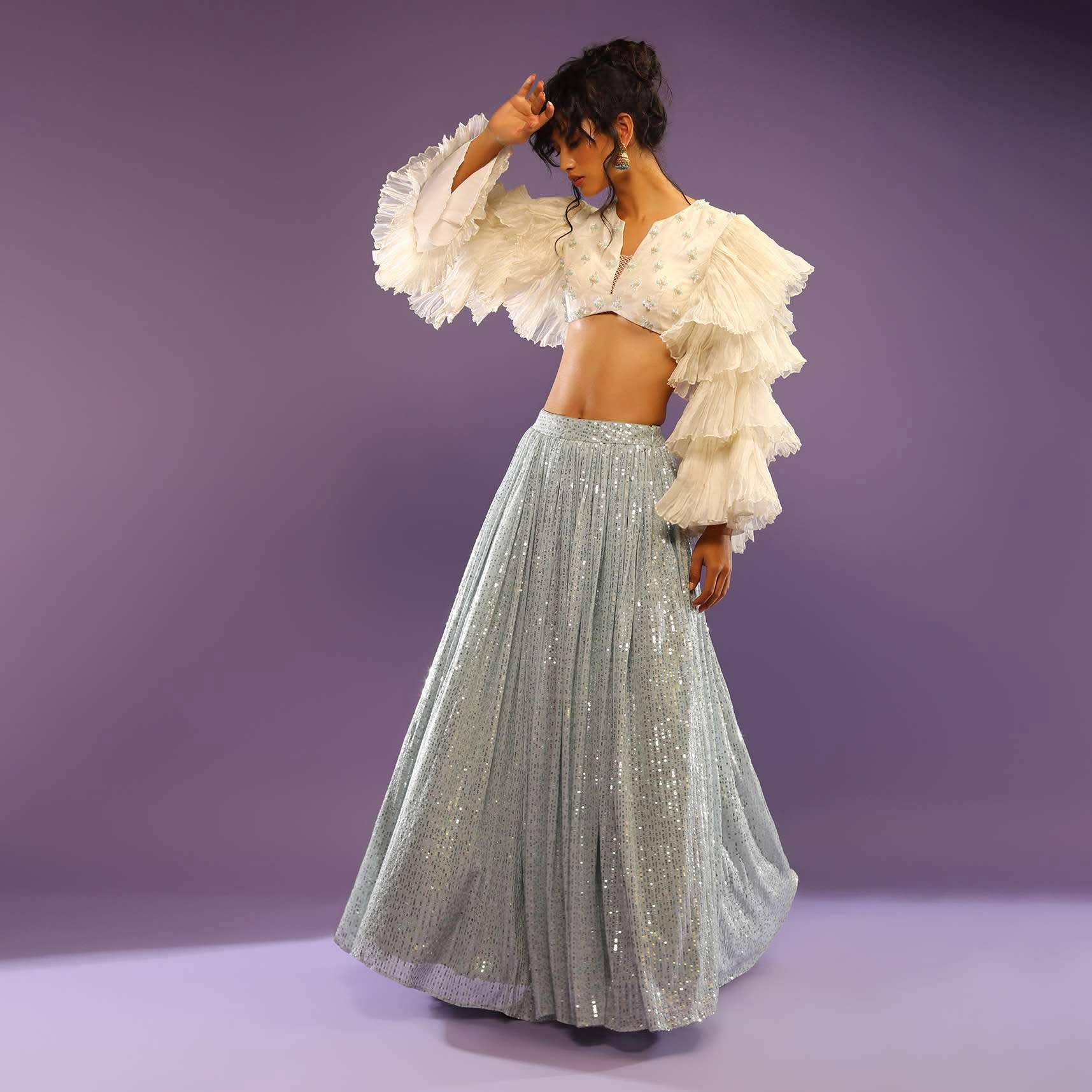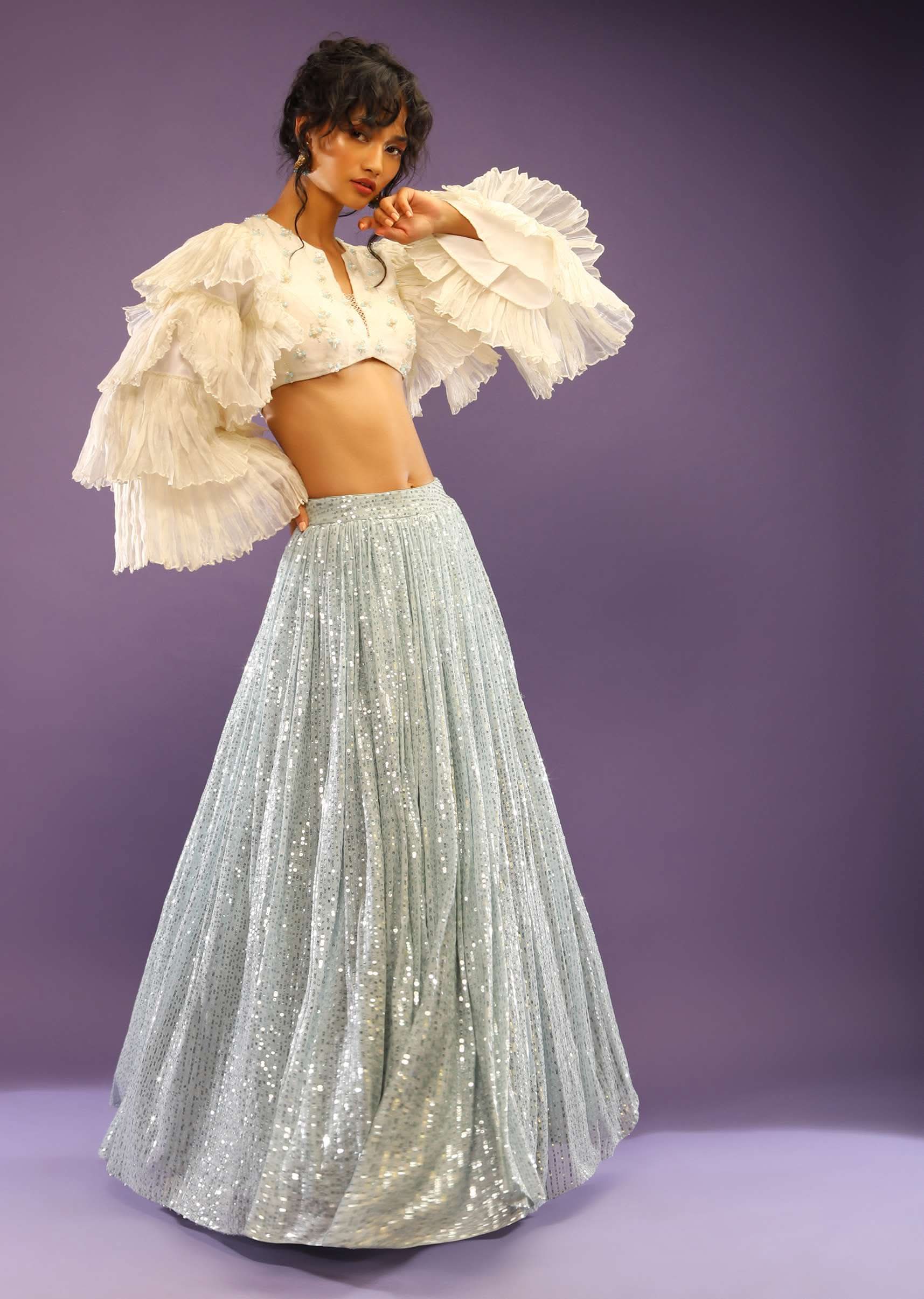 Powder Blue Sequin Skirt And White Crop Top With Fancy Layered Bell Sleeves And Plunging Neckline