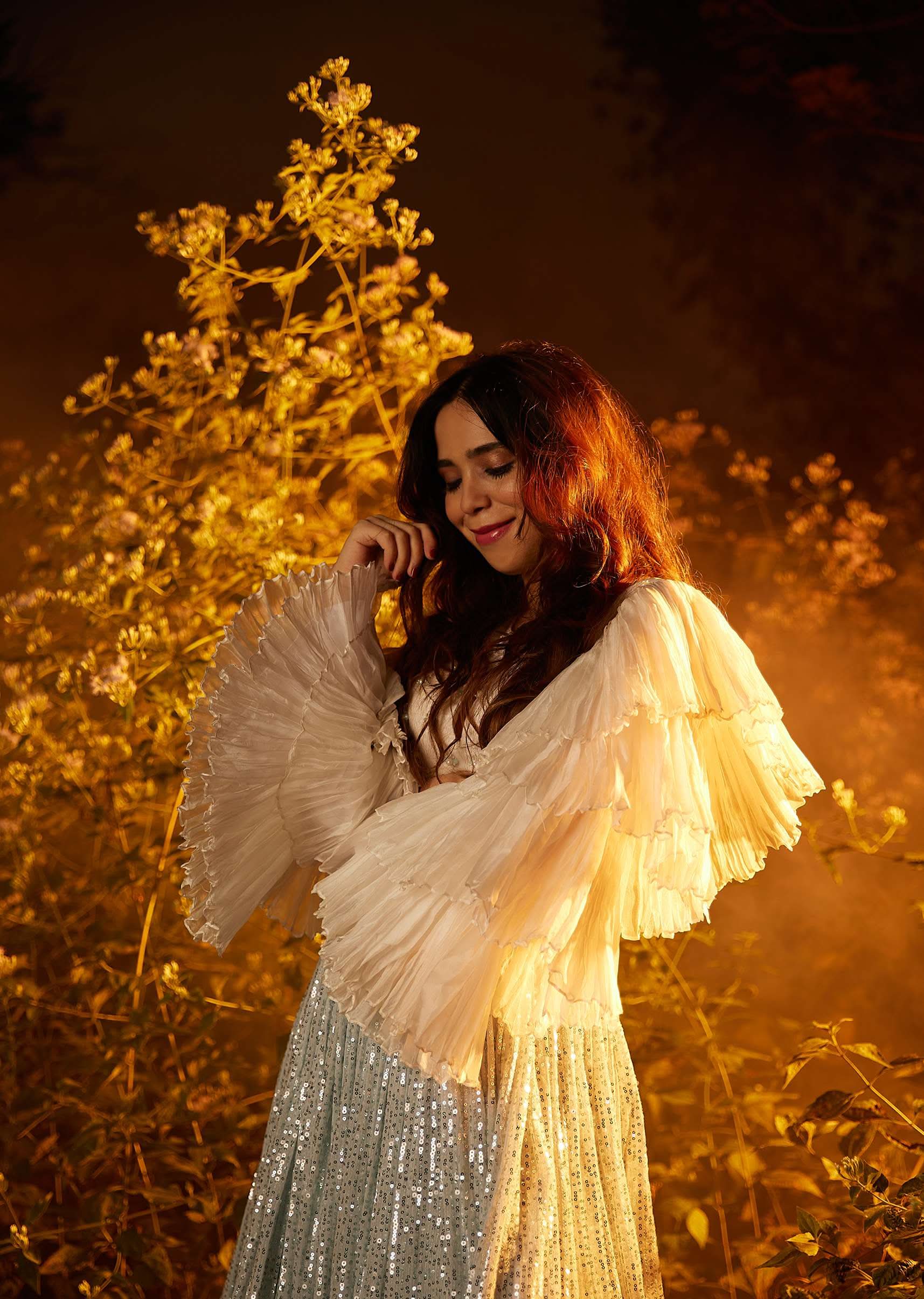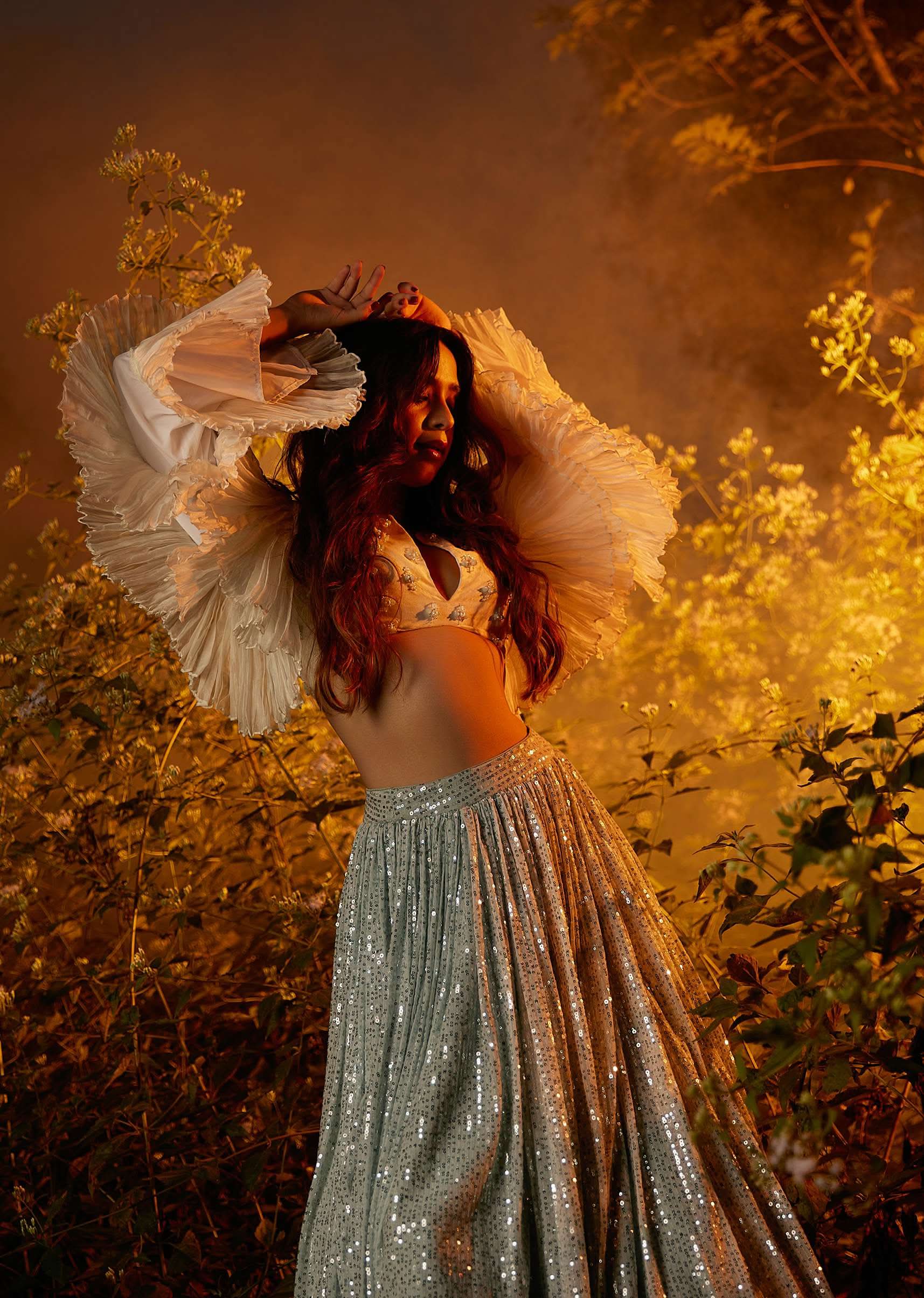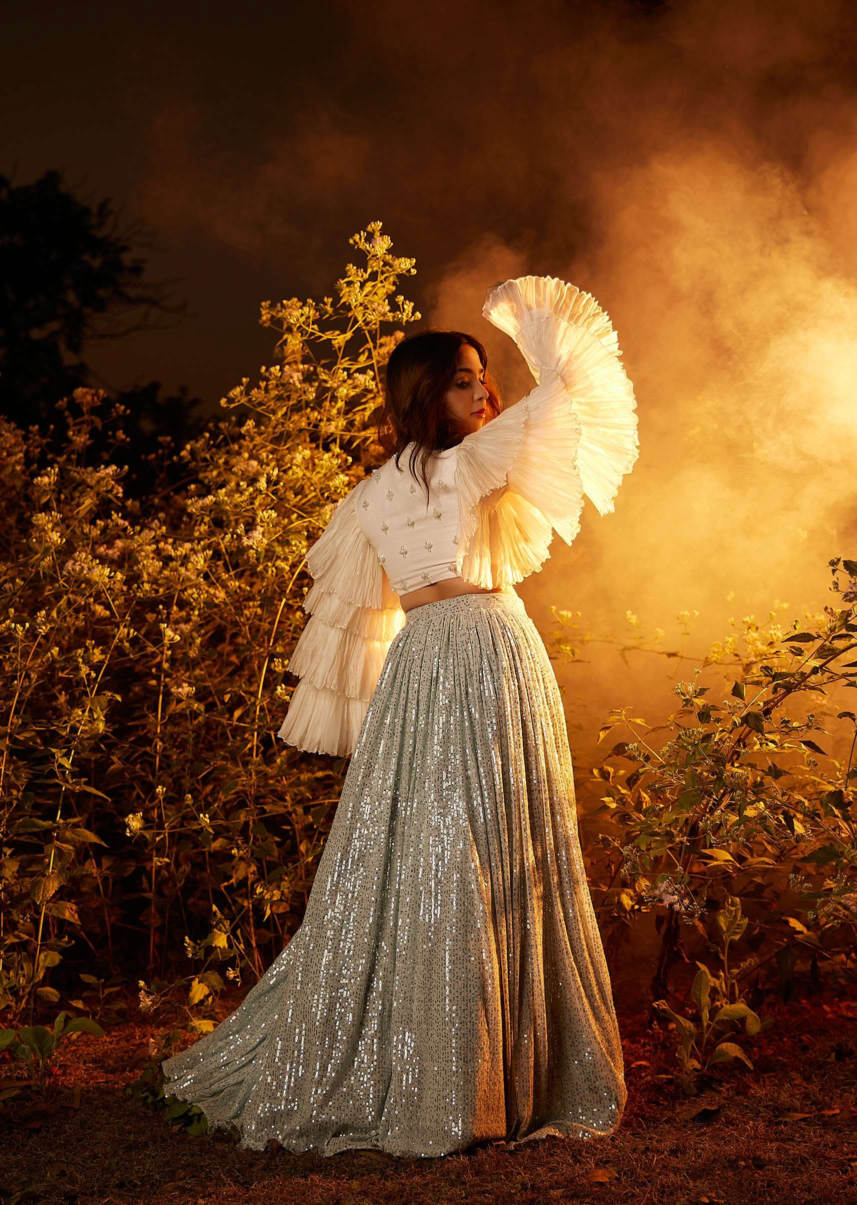 - Powder blue sequins skirt paired with a white crop top in organza with fancy layered bell sleeves.