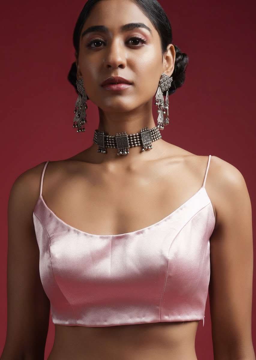 Powder Pink Blouse In Milano Satin With Spaghetti Straps On The Shoulders